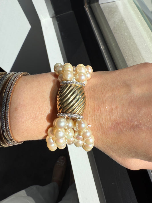 Luxury 14K Yellow Gold and Diamond Clasp Five-Strand Pearl Bracelet – Retro Elegance