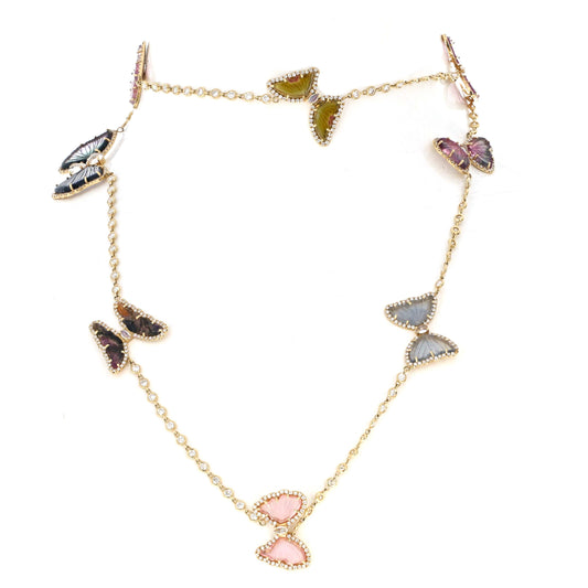 Tourmaline Butterfly Necklace with Diamonds 18K Yellow Gold, 30 Inch Long Layering Pendant Necklace