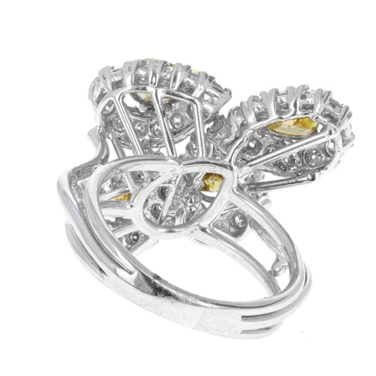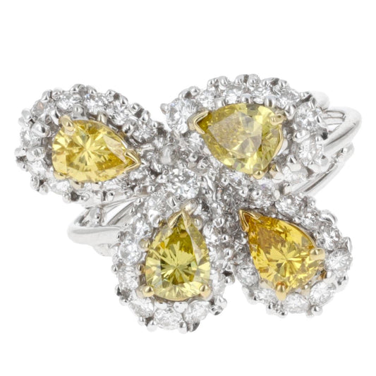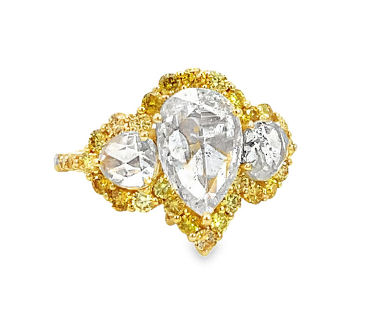 18K Yellow Gold Rose Cut Pear Shape Three-Stone White and Yellow Diamond Ring