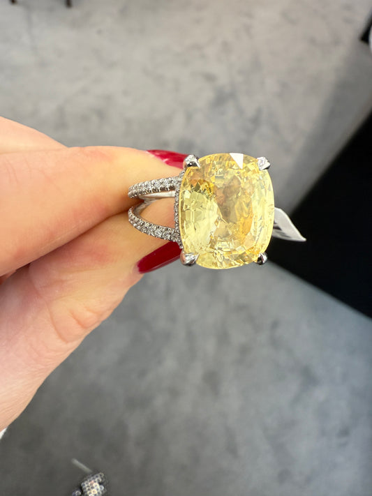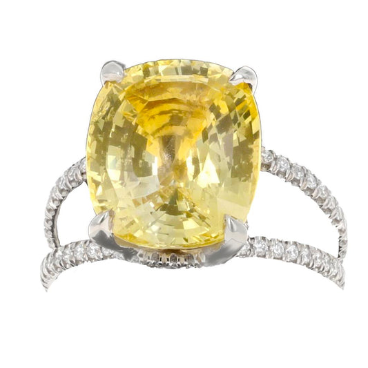 GIA No-Heat 10.19 Carat Sri Lanka Yellow Sapphire Cocktail Ring in 18K White Gold with Diamond Split Shank