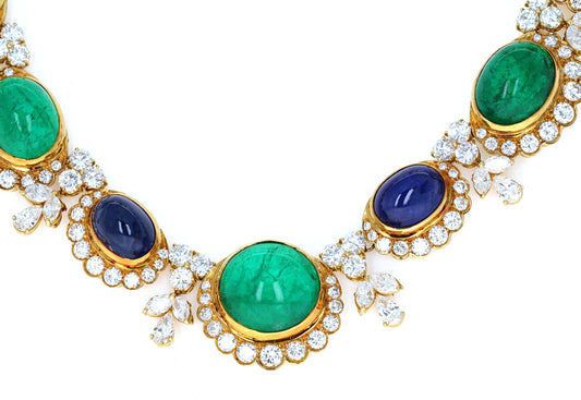 GIA Vintage Retro Sapphire Emerald Cabochon and Diamond Necklace