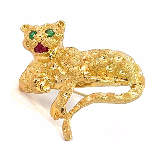 18K Yellow Gold Panther Brooch Pin – Emerald Eyes, Ruby Mouth, Stamped LM
