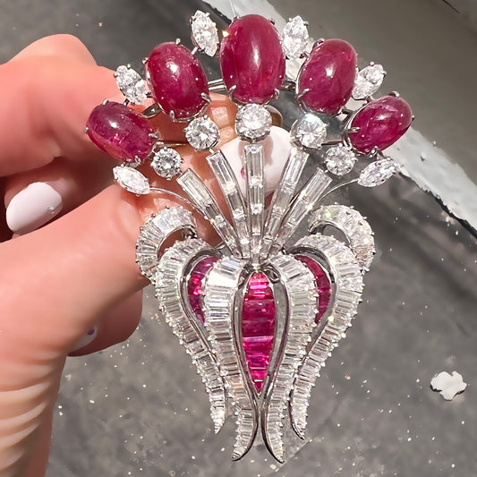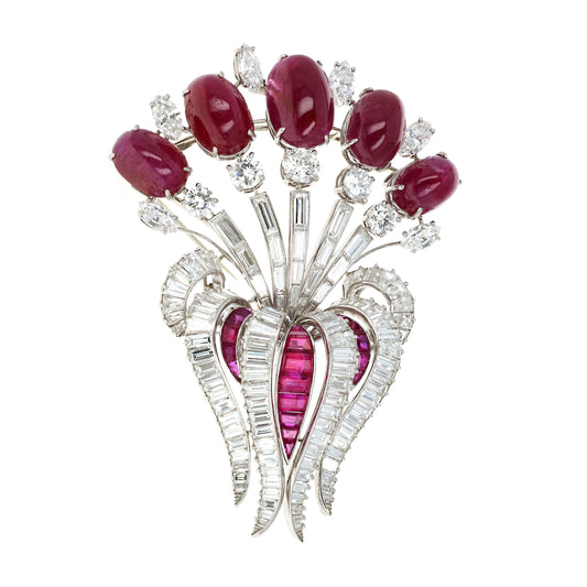 Oscar Heyman GIA Certified Platinum Ruby and Diamond Brooch, No-Heat Burma Rubies