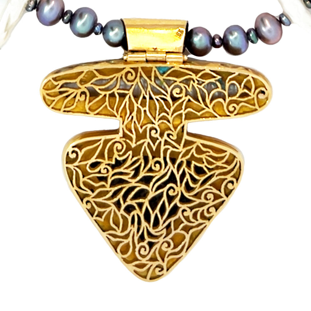 The centerpiece is an opalized wood pendant set in 18-karat yellow gold. The pendant, measuring 2.25 inches in length and 2 inches in width, showcases hand-carved details and a tribal-inspired design.
