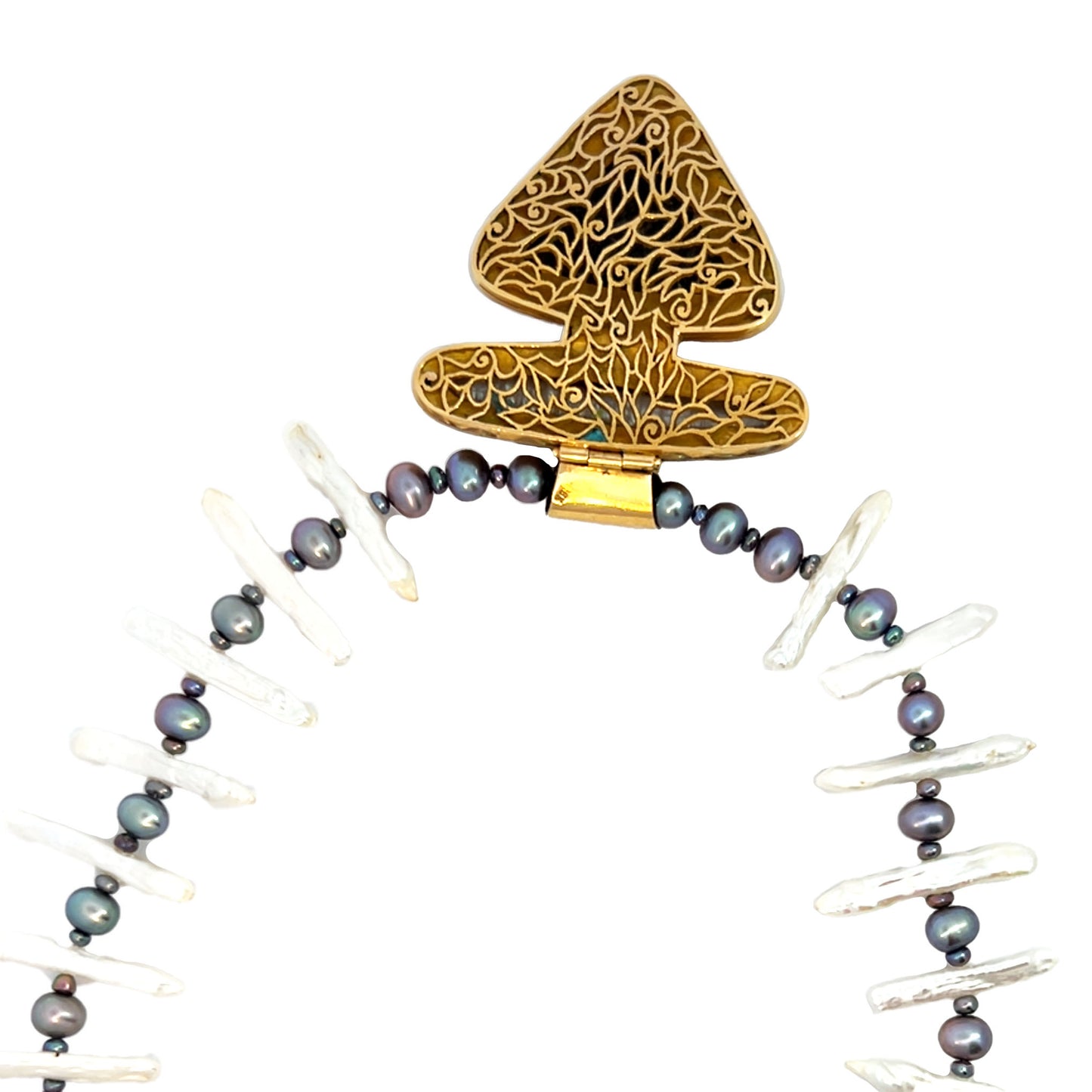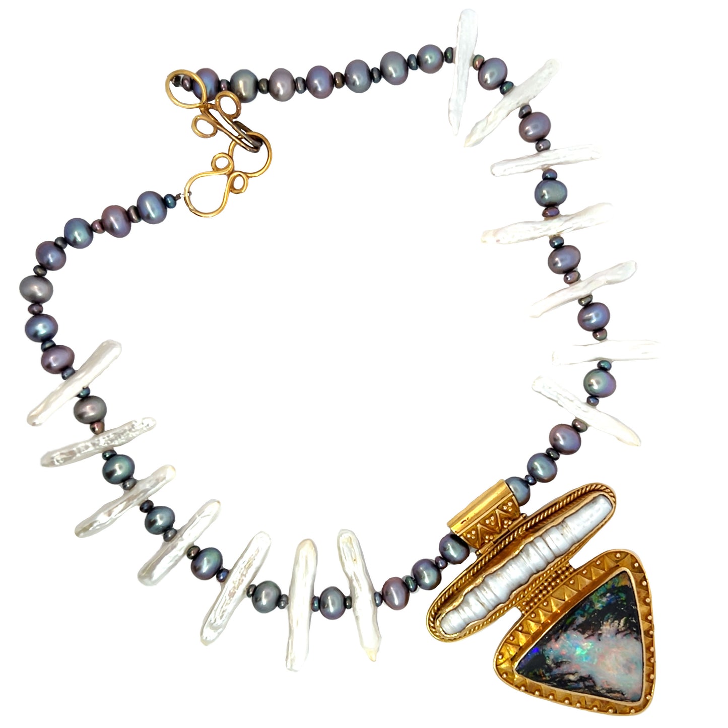 This necklace features elongated white Biwa stick pearls paired with iridescent black peacock pearls, creating a striking contrast of shapes and colors.