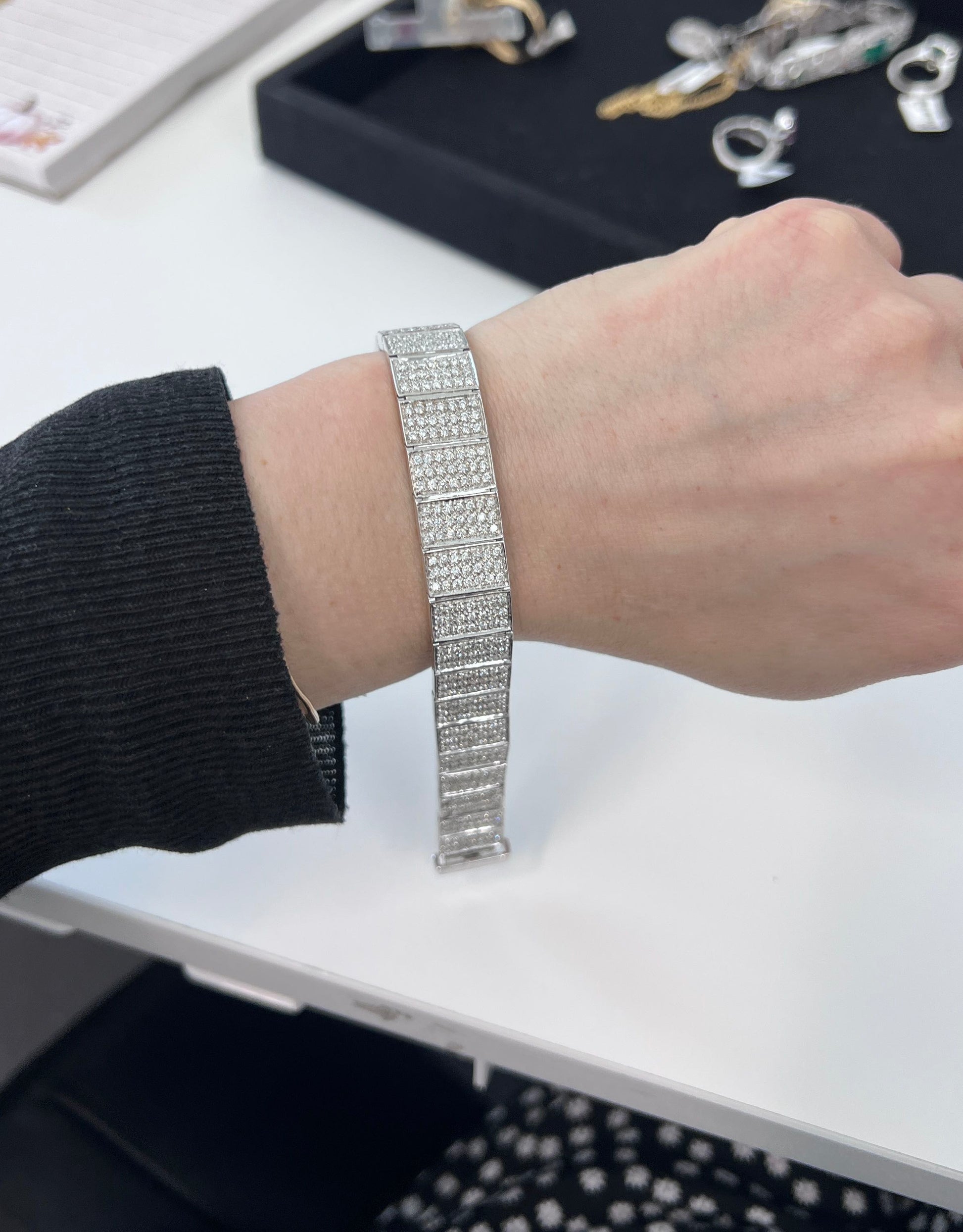 18K white gold diamond link bracelet dazzles with 525 pavé-set round brilliant diamonds, totaling 7.50 carats. Its 25 intricately designed link panels, each adorned with 21 diamonds, create a seamless, flexible fit.