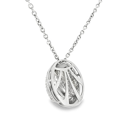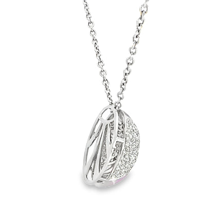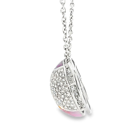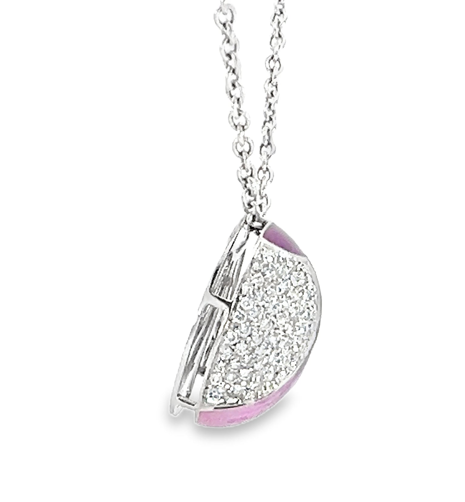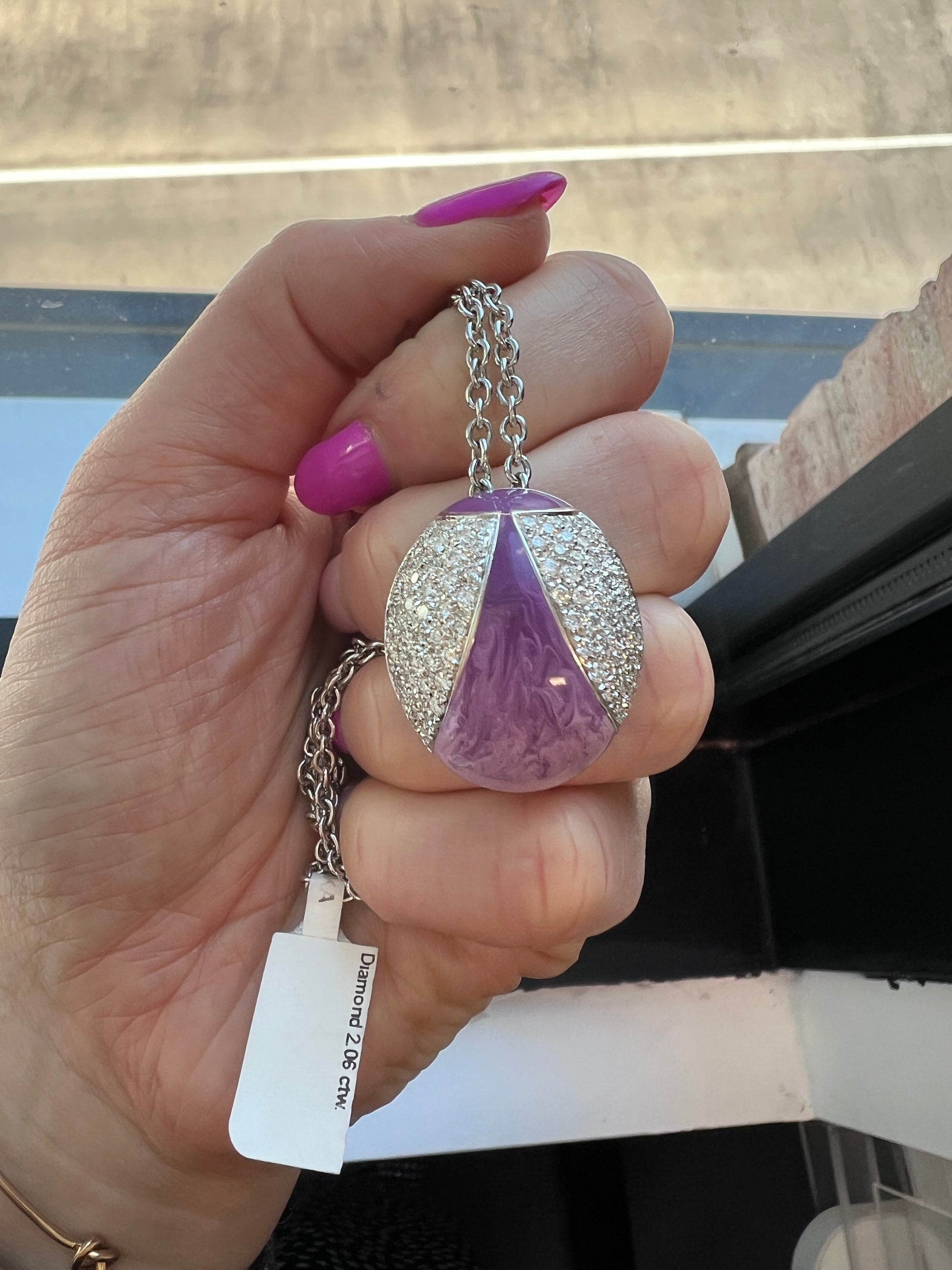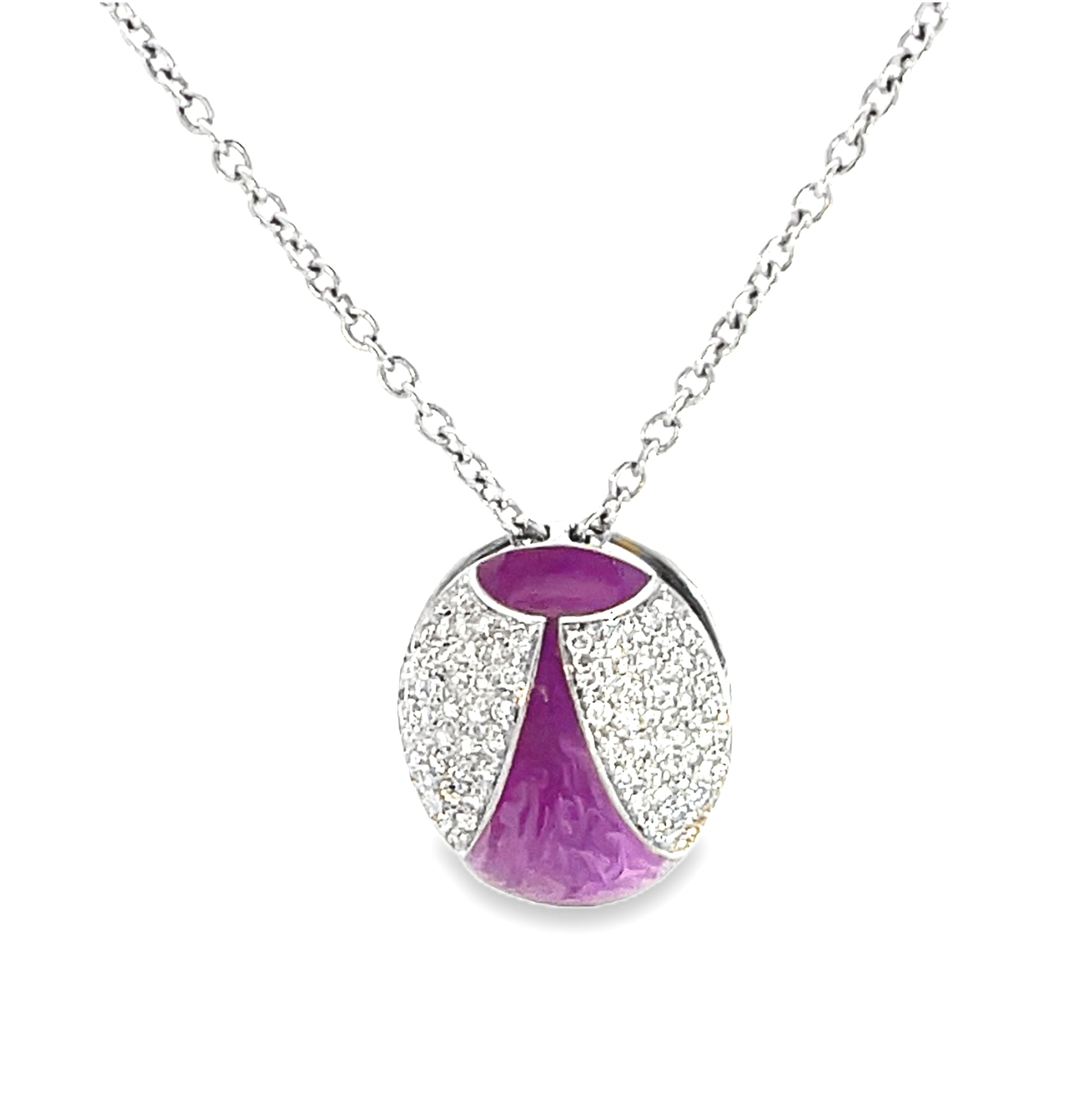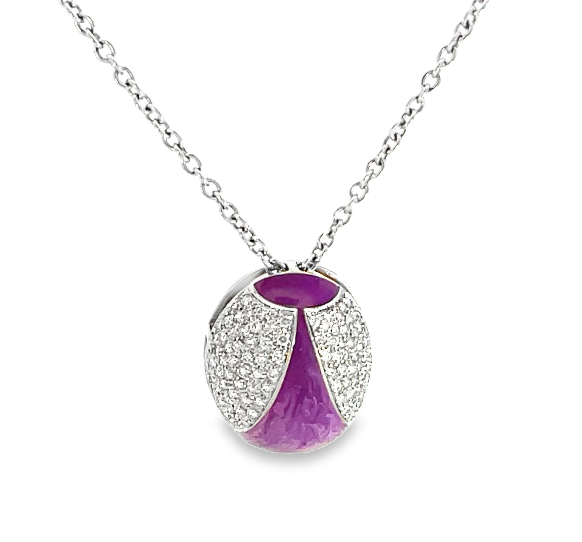 18K white gold pendant necklace showcases a stunning purple enamel orb, beautifully accented with 2.06 carats of sparkling round brilliant diamonds. The intricate craftsmanship and high-quality materials make this piece a luxurious statement, perfect for casual elegance and formal sophistication. The enamel work is finely detailed, ensuring a vibrant, eye-catching finish that captures light beautifully.