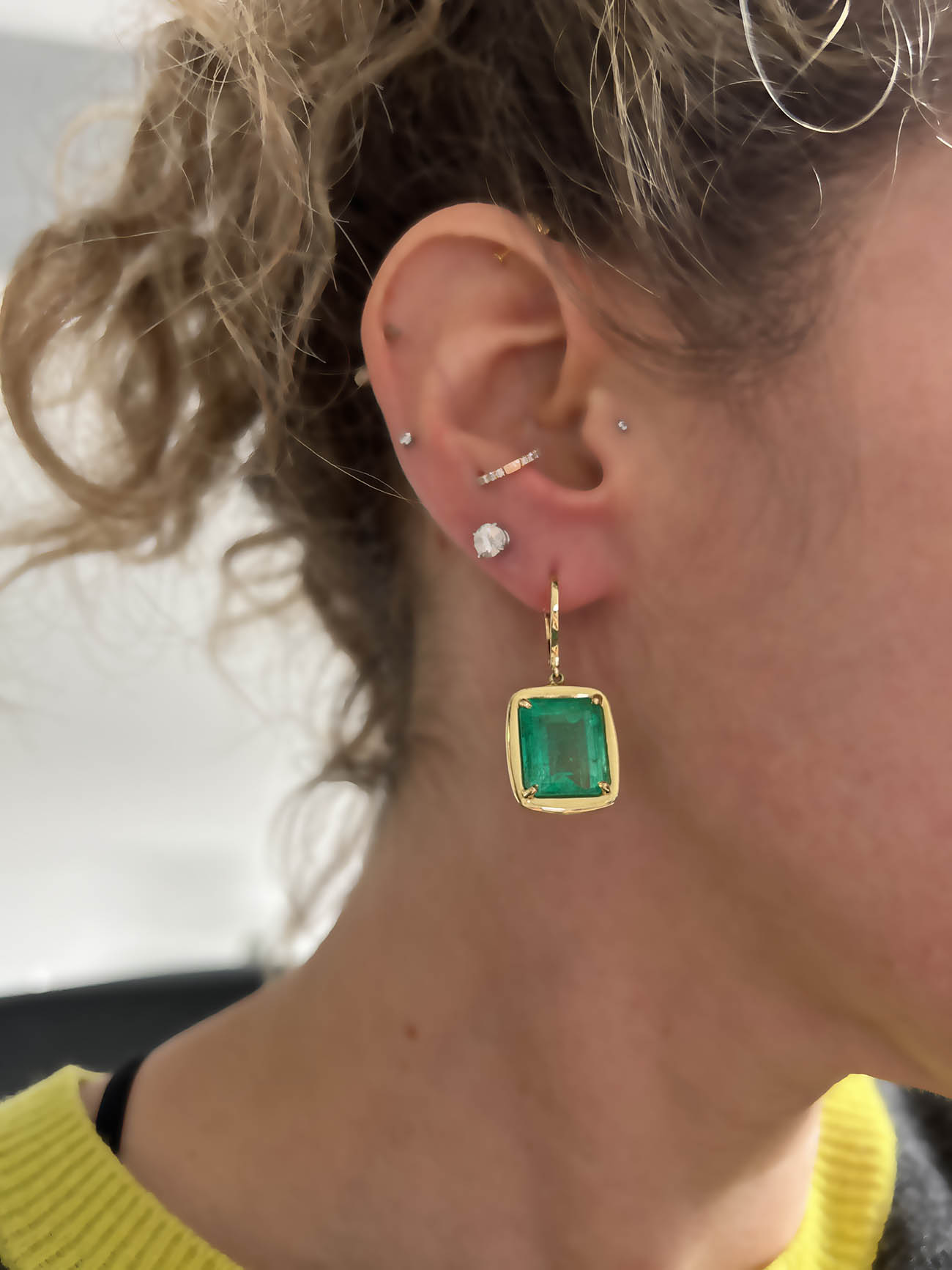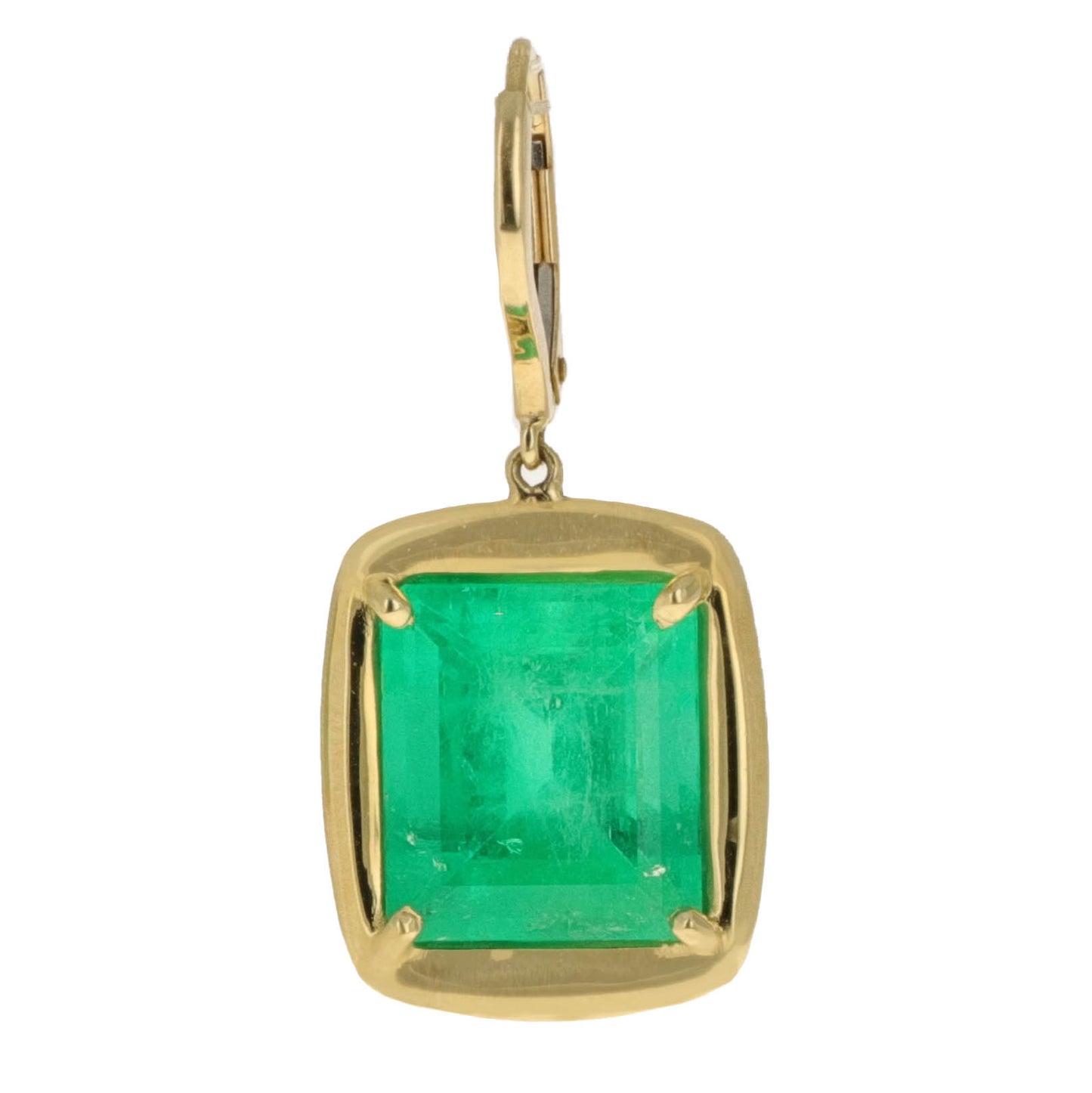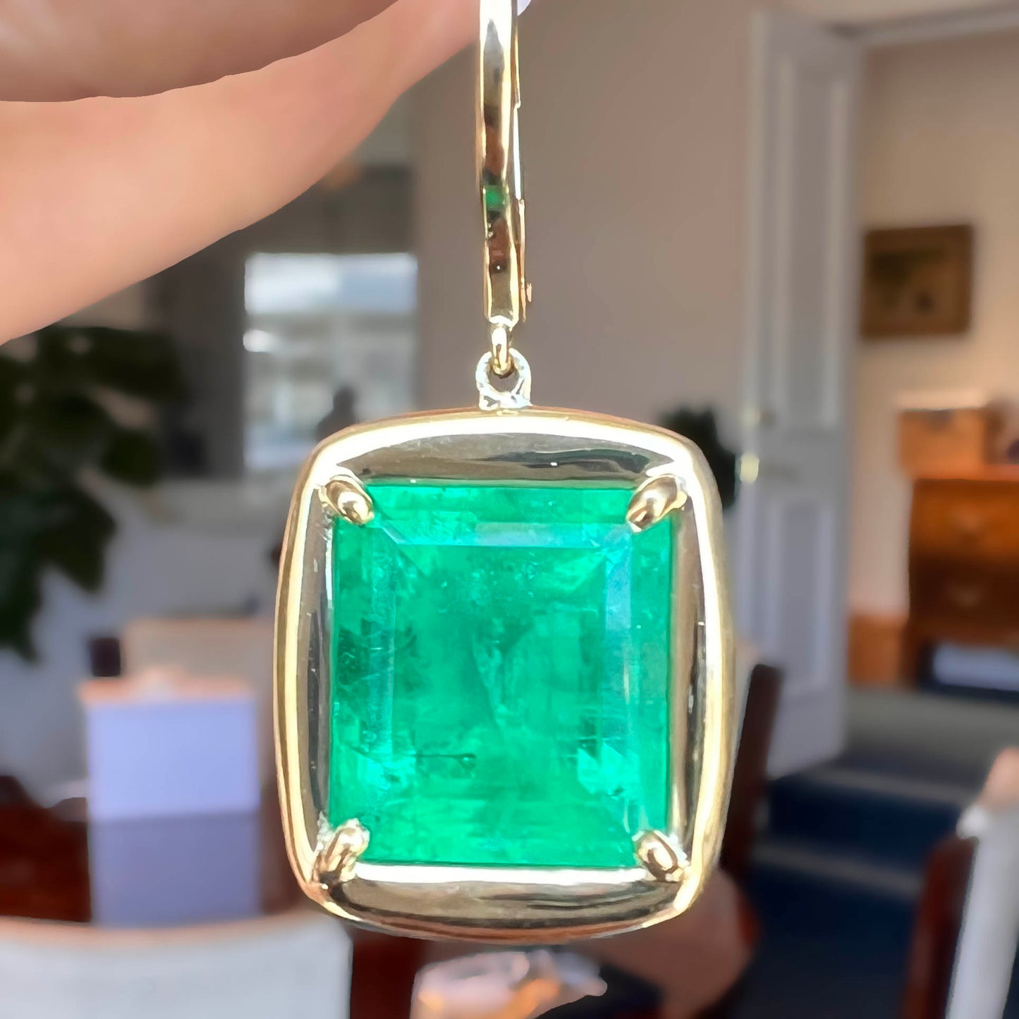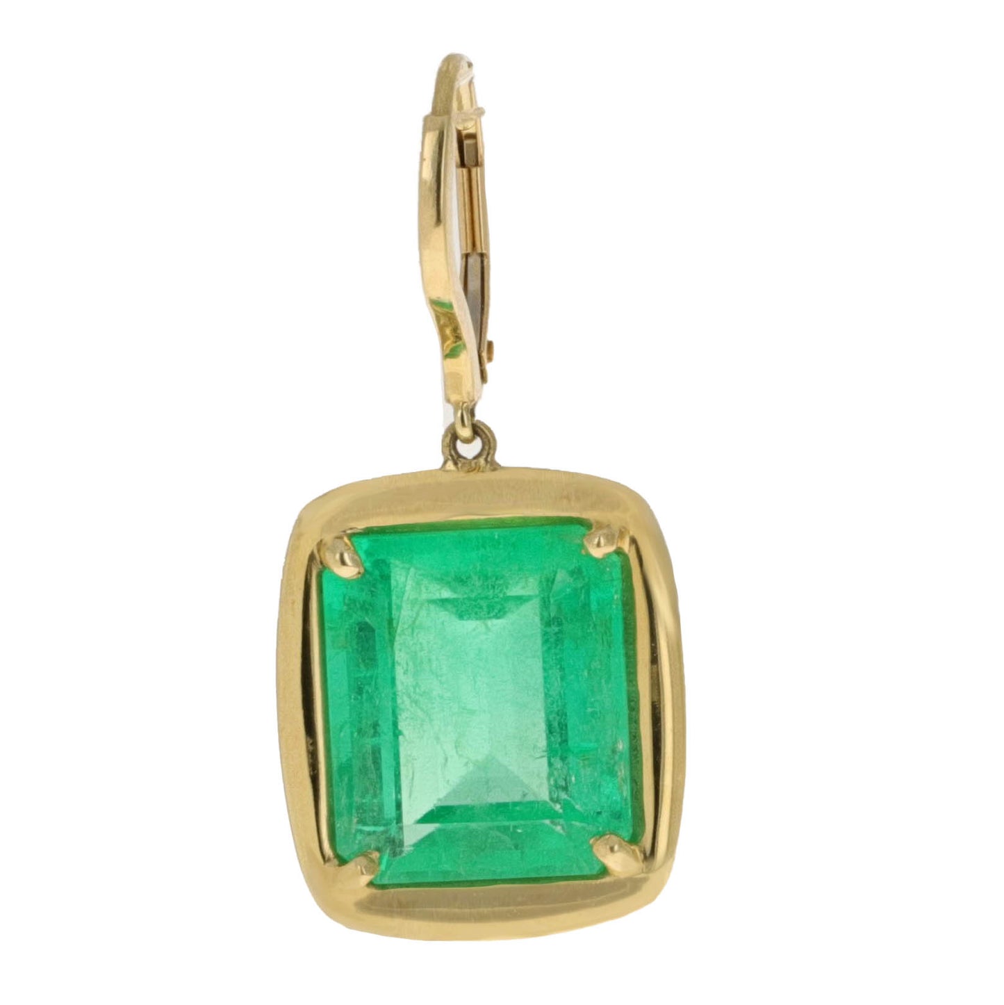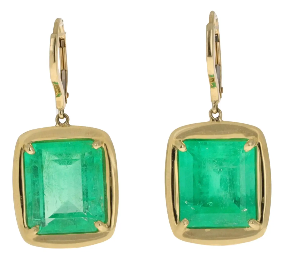 18K yellow gold Colombian emerald dangle earrings featuring two striking emeralds with a combined weight of 17.90 carats. Each gemstone is expertly bezel-set in a handcrafted 18-karat yellow gold setting that perfectly embraces and secures the stones. The vibrant green emeralds, sourced from Colombia, contrast beautifully with the lustrous yellow gold, creating a look that’s as bold as sophisticated.