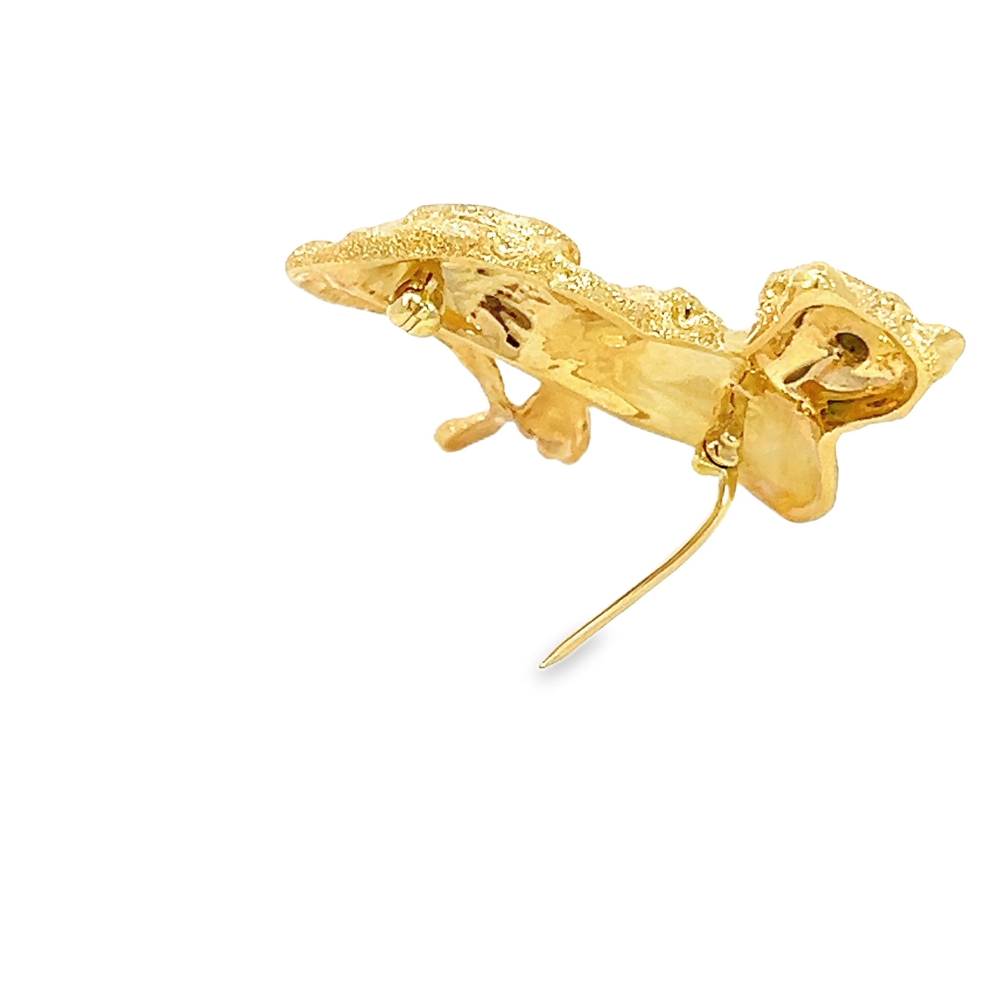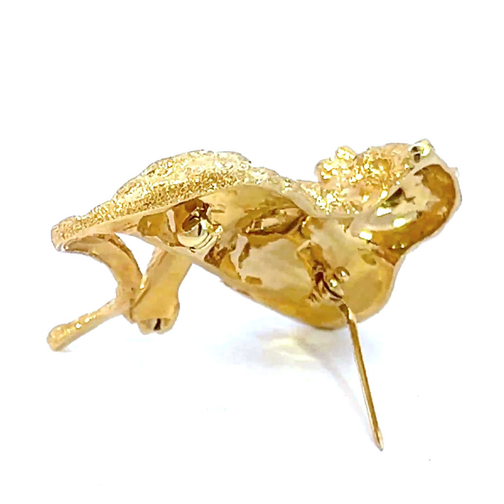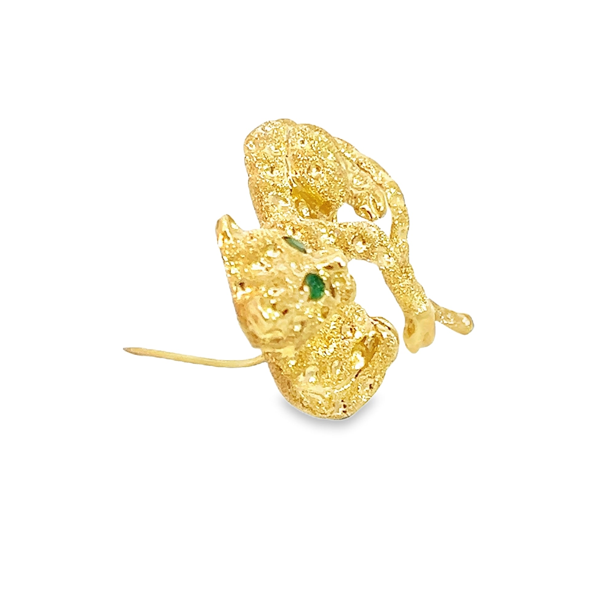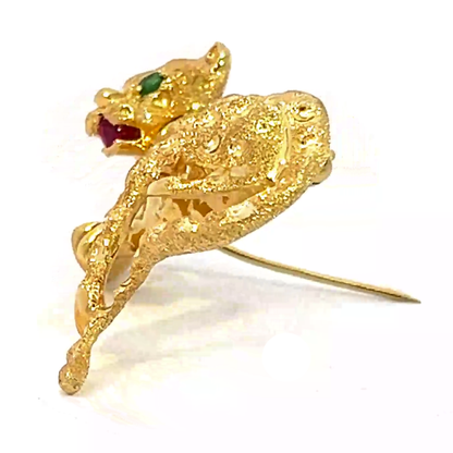 18K yellow gold panther brooch pin embodies elegance and wild beauty, featuring vivid green emerald eyes and a striking royal red ruby mouth. A true statement piece, this finely crafted brooch weighs 15.3 grams and is stamped 18K and LM, ensuring authenticity and quality.