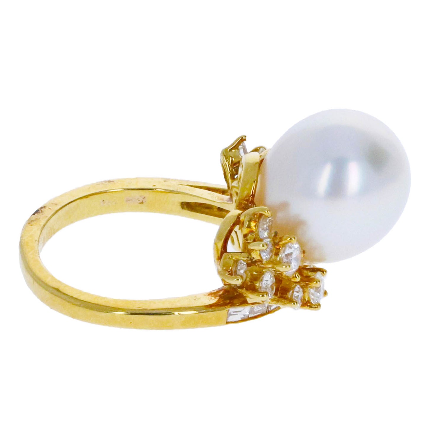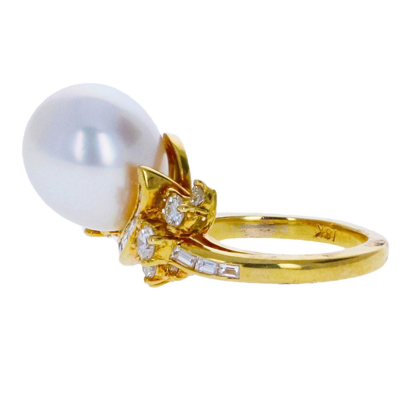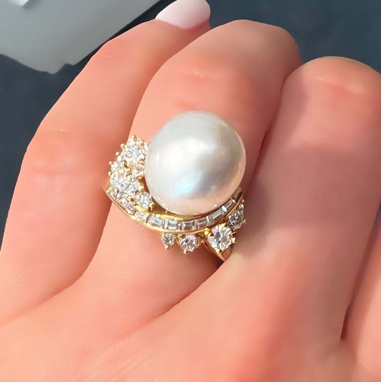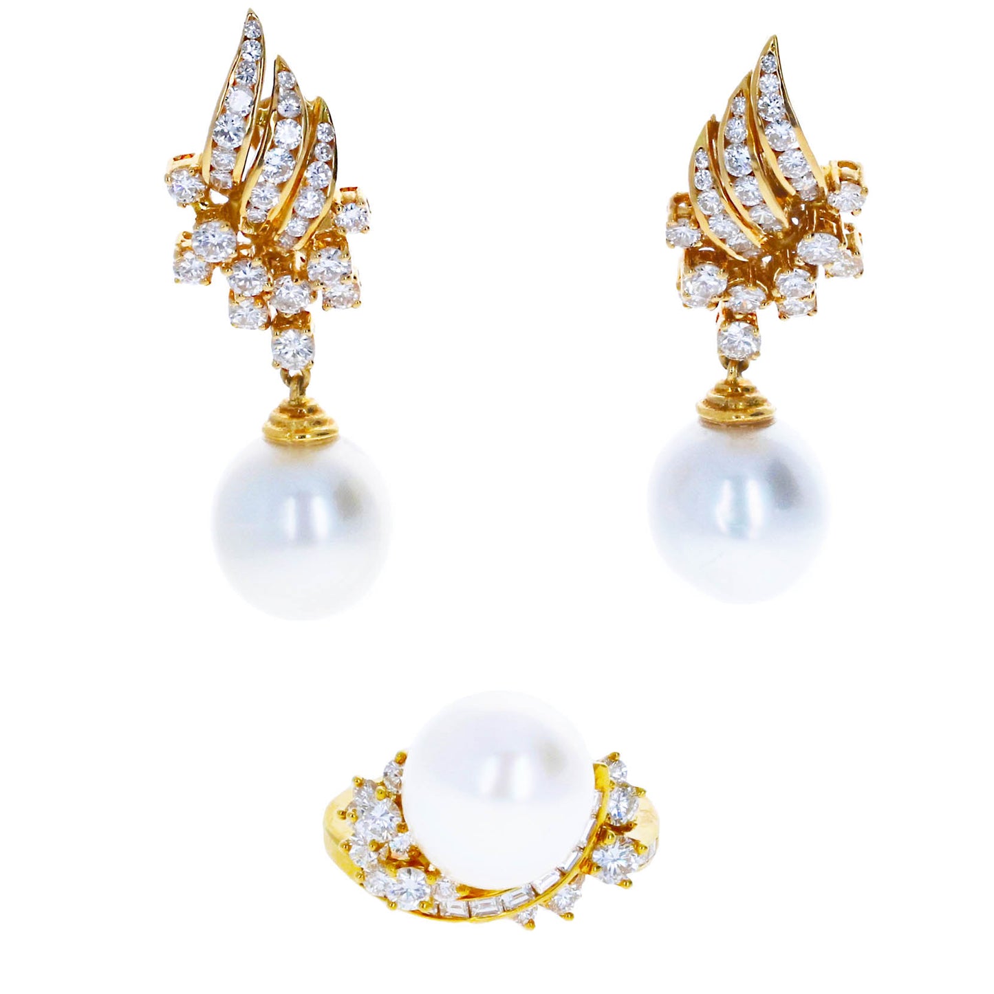 18K Yellow Gold Pearl and Diamond Earrings and Ring Set with 12-15mm Pearls