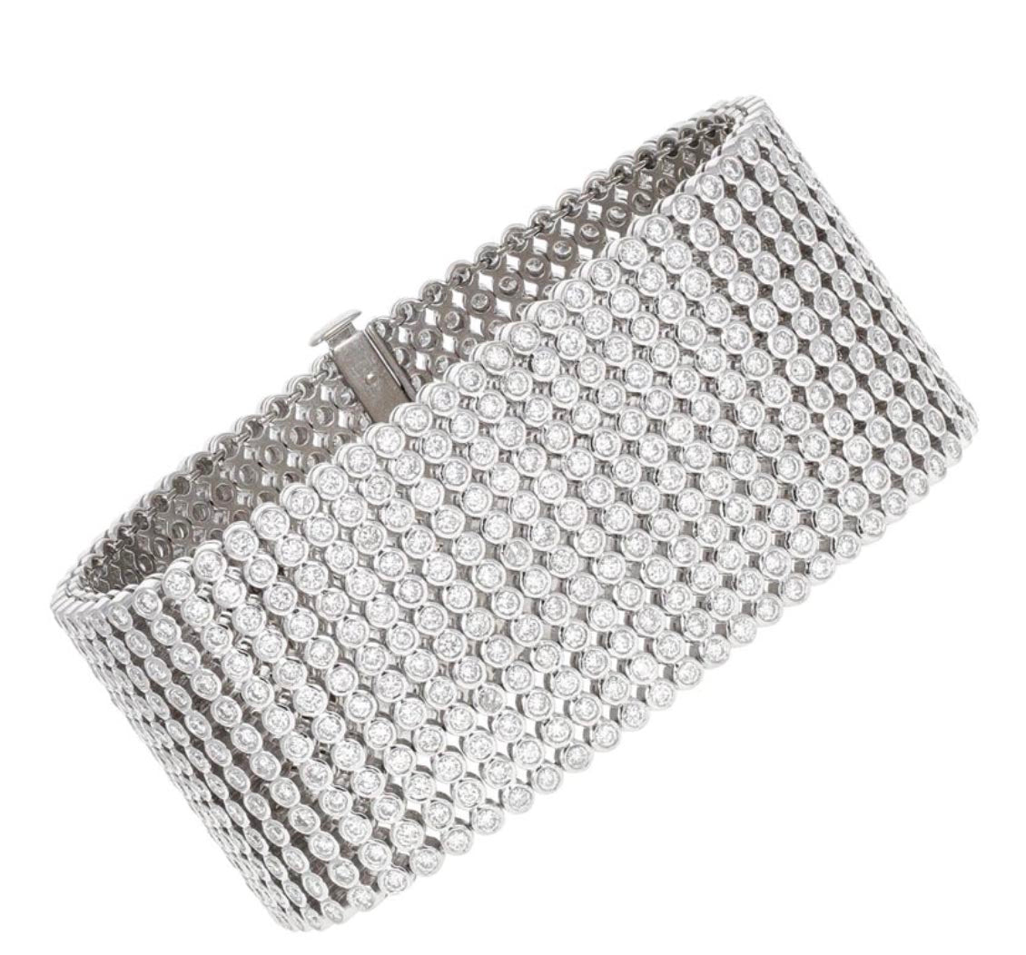 18k white gold 27.50-carat wide diamond tennis bracelet cuff. The diamonds are round brilliant cut G-H color and VS- SI clarity. Each of the 744 diamonds are bezel set, making the movement and fluidity of this bracelet perfect. The 744 diamonds make the 12 rows of diamonds sparkle at every angle. Each row has 62 lively diamonds that match perfectly.