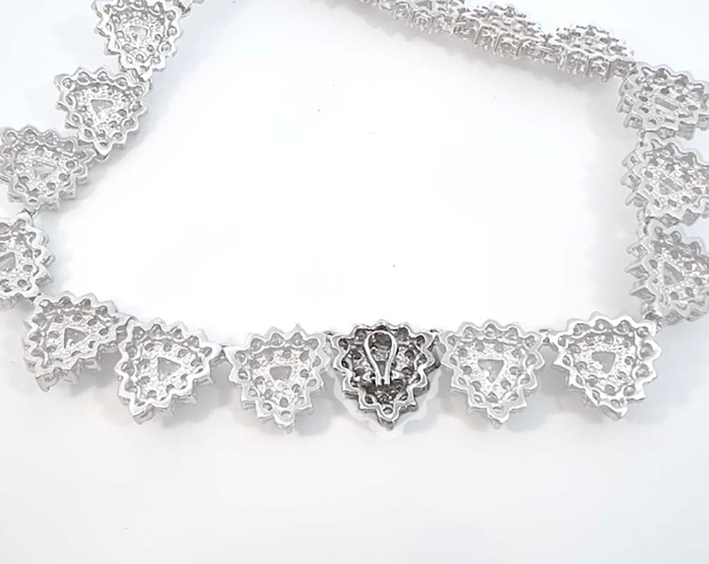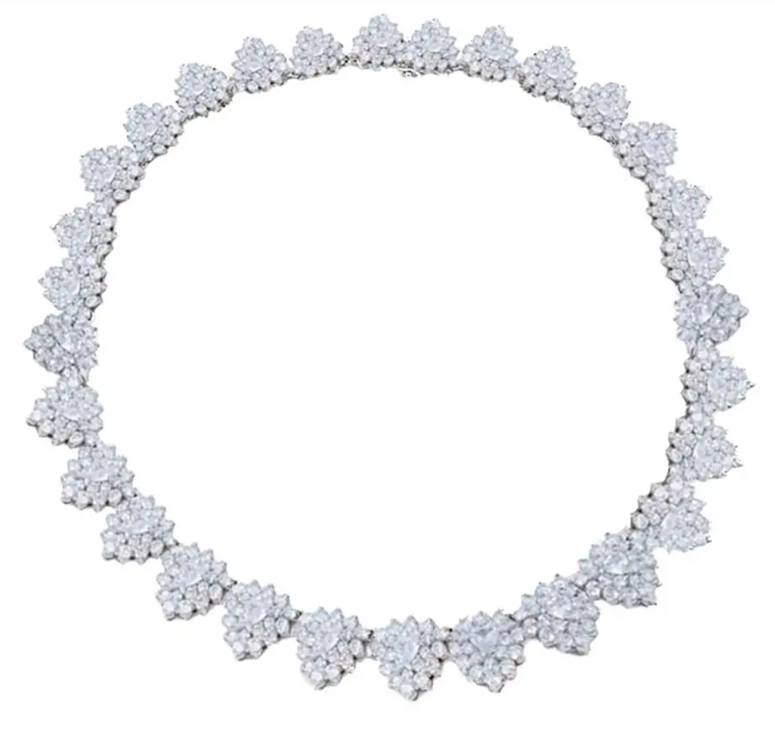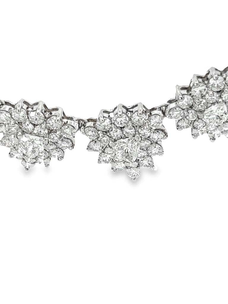 This modern-made Edwardian-style necklace is made with 32.50 carats in 18-karat white gold. The design includes 30 links, each showcasing a central heart-shaped white diamond surrounded by a double halo. The larger halo contains 12 diamonds, while the smaller halo contains 9 diamonds. With a total of 659 diamonds, there is a combined diamond weight of 32.50 carats. Crafted from 18-karat white gold, the necklace measures 16 inches in length. The front link includes an attachment designed to hang a pendant or charm. Designed in the Edwardian style, characterized by intricate details and a sense of romantic elegance, this necklace is a stunning blend of modern craftsmanship and vintage-inspired design.