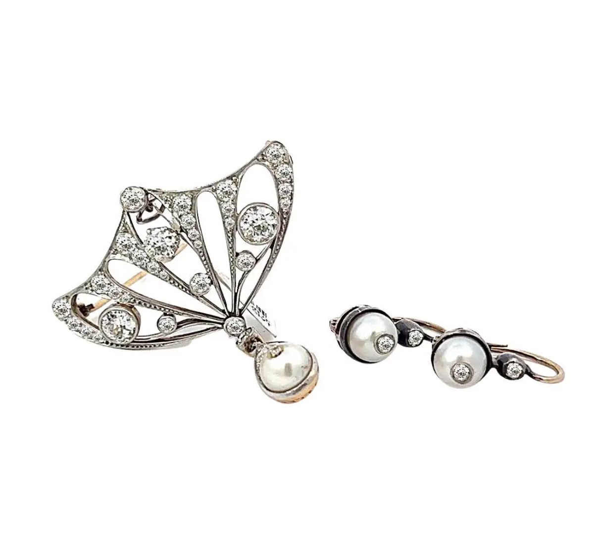 Antique Diamond and Pearl Platinum Brooch and Earrings Set