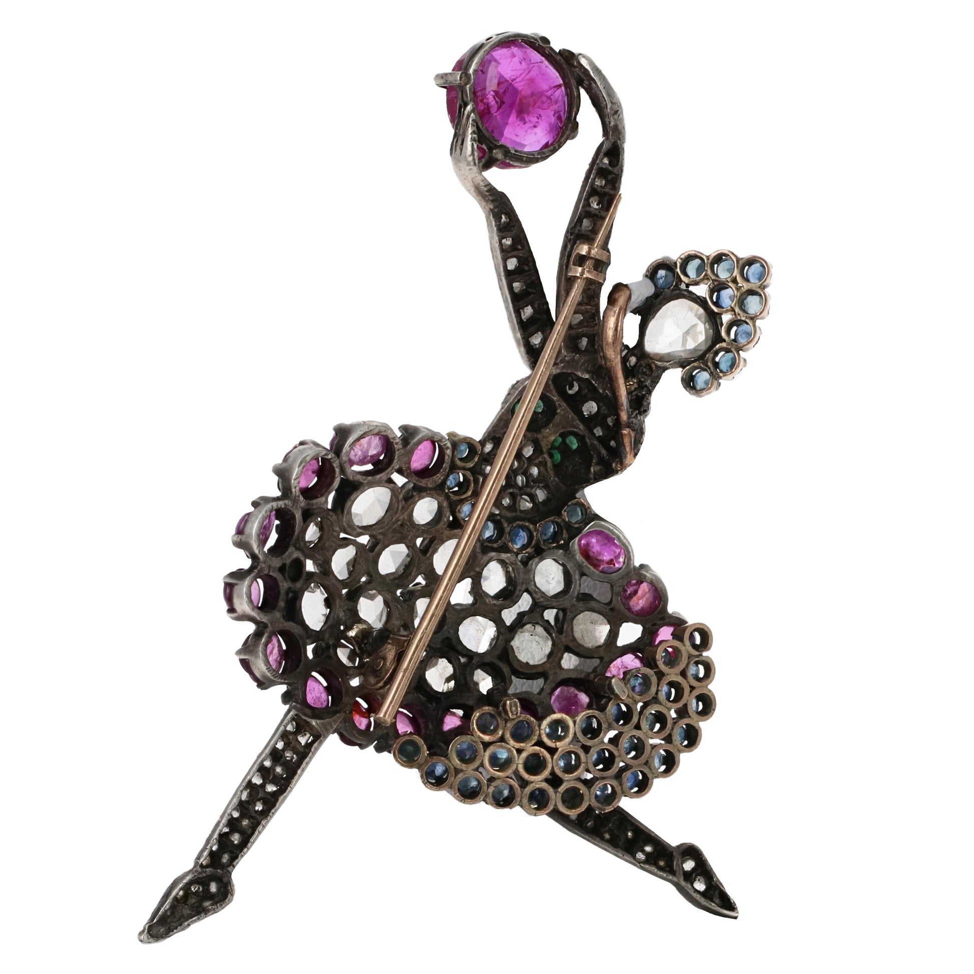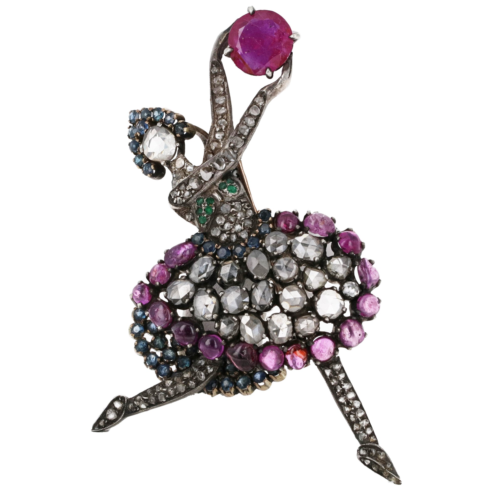 Measuring 7 cm by 4.5 cm, this piece is a substantial and striking example of antique craftsmanship. The blend of gemstones and expert goldsmithing makes this brooch not only a unique piece of wearable art but also a valuable heirloom for the discerning collector. Whether worn on a lapel or showcased in a collection, this brooch captures a moment of ballet in glittering gemstone form—elevating elegance, rarity, and history into a single extraordinary jewel.
