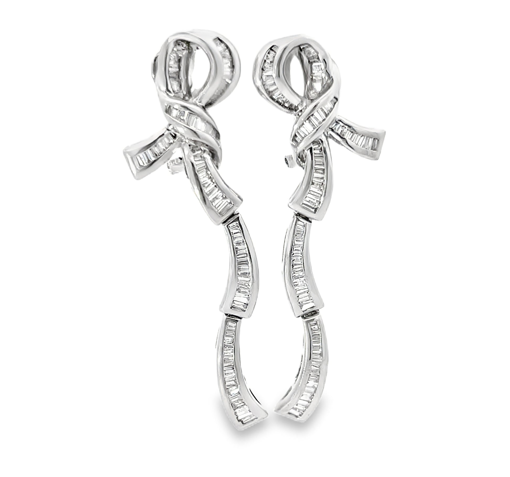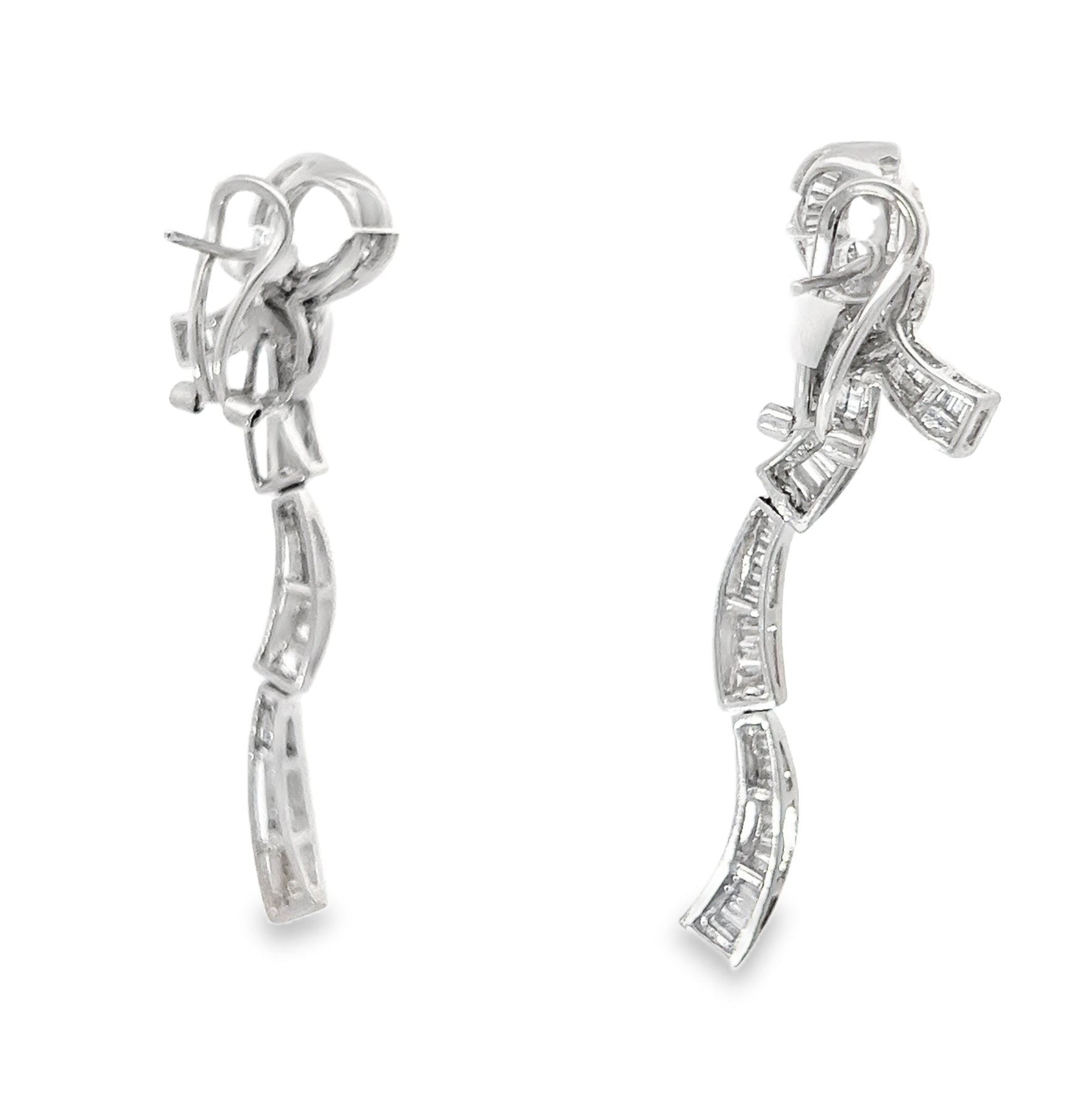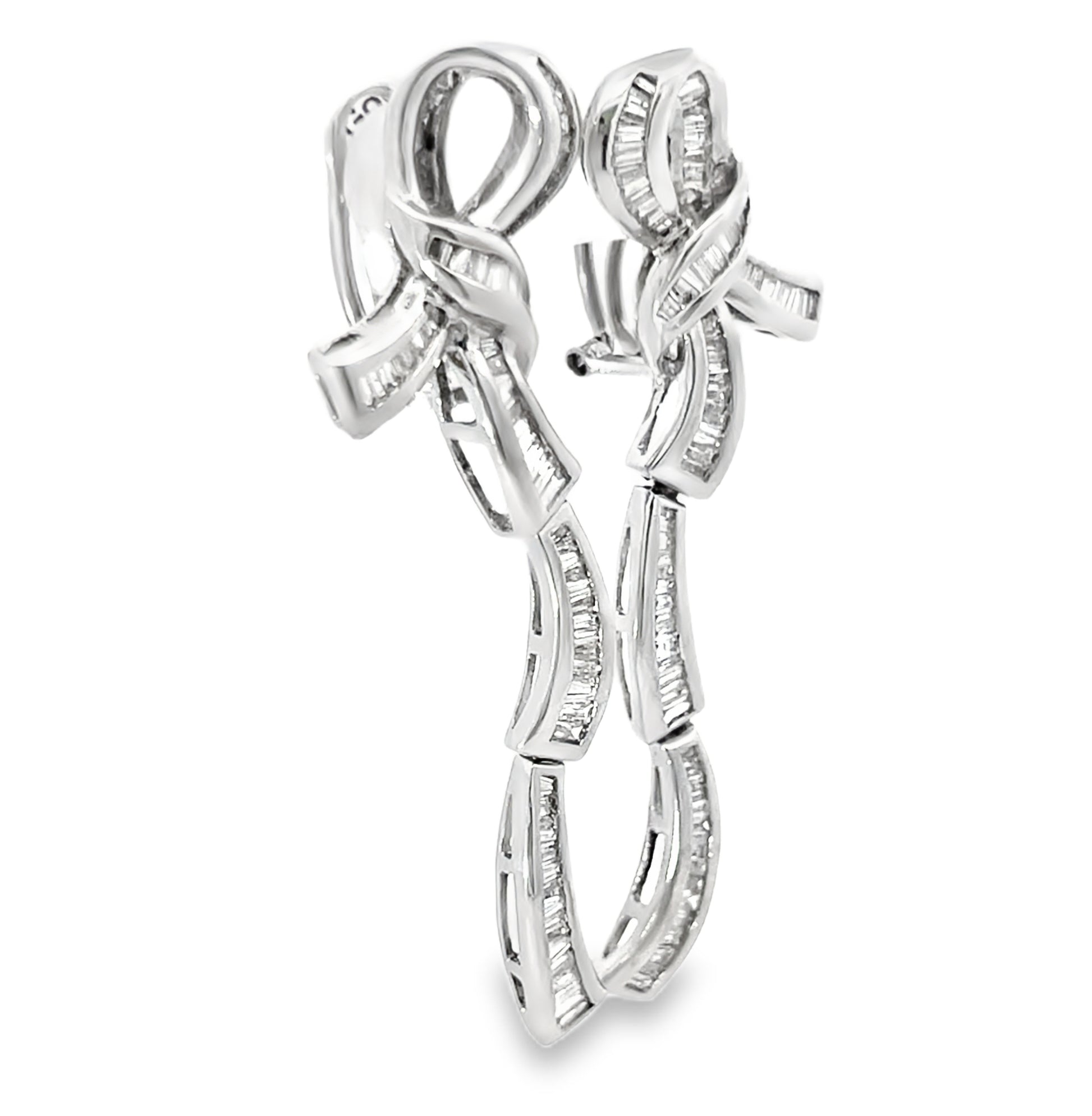 These exquisite Art Deco 18K white gold diamond bow drop earrings radiate vintage elegance with their sophisticated, cascading design. Crafted to capture light with every movement, they are channel-set with tapered baguette diamonds, creating a refined and timeless sparkle. Measuring 2.25 inches in length and 0.5 inches wide, these earrings gracefully dangle from secure lever-back closures for comfortable wear.