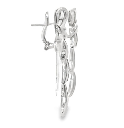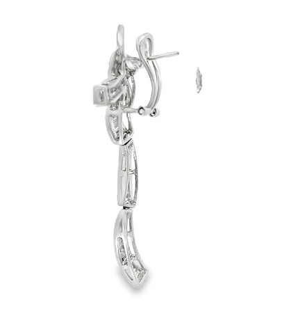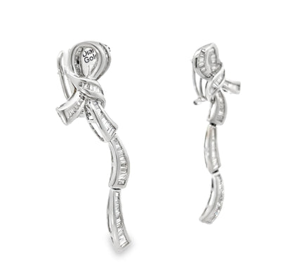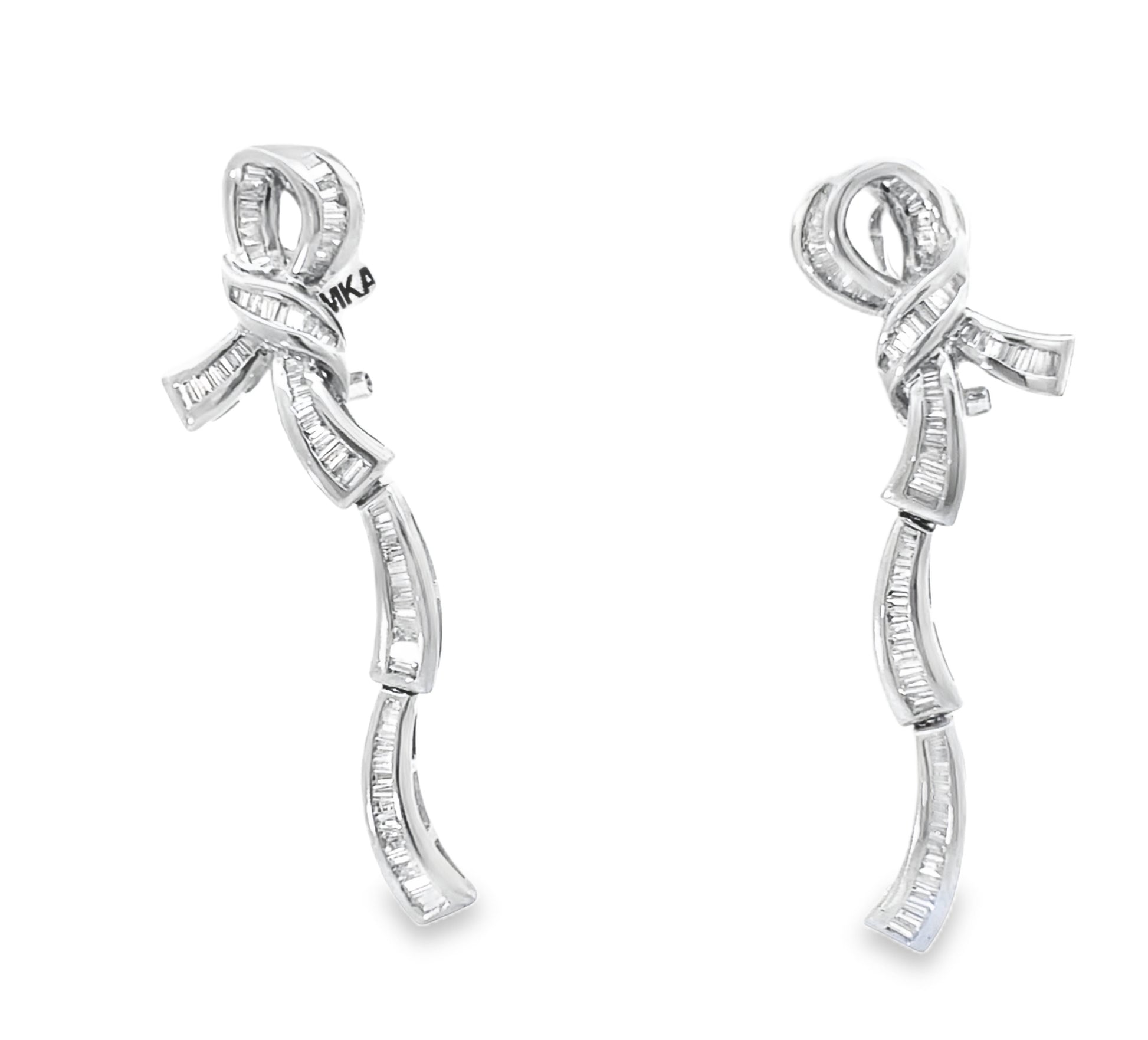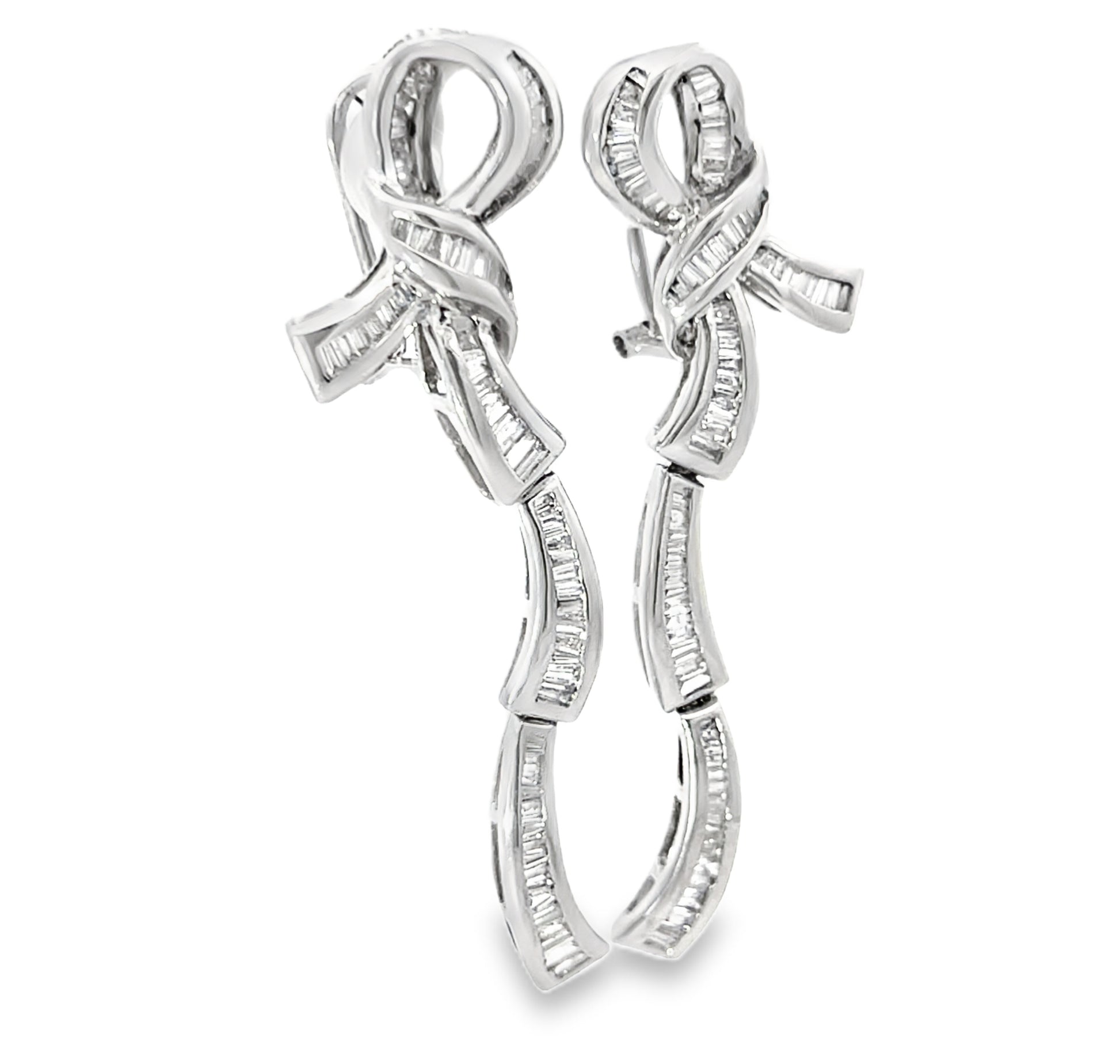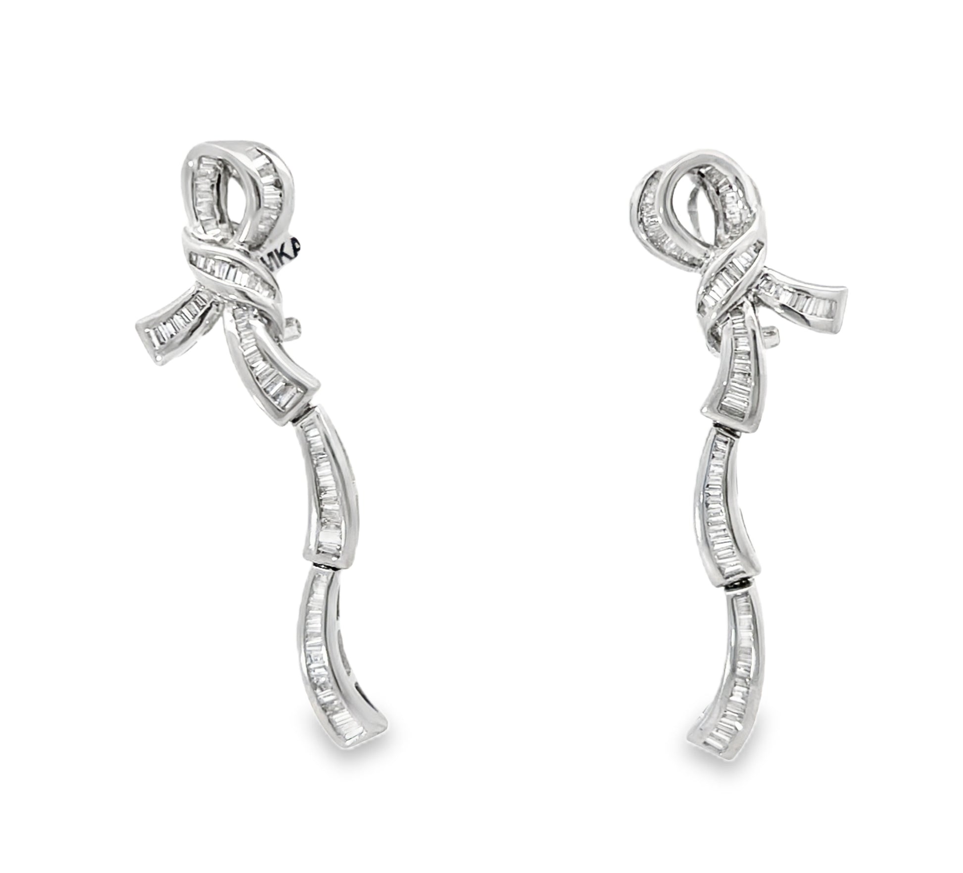 These exquisite Art Deco 18K white gold diamond bow drop earrings radiate vintage elegance with their sophisticated, cascading design. Crafted to capture light with every movement, they are channel-set with tapered baguette diamonds, creating a refined and timeless sparkle. Measuring 2.25 inches in length and 0.5 inches wide, these earrings gracefully dangle from secure lever-back closures for comfortable wear.
