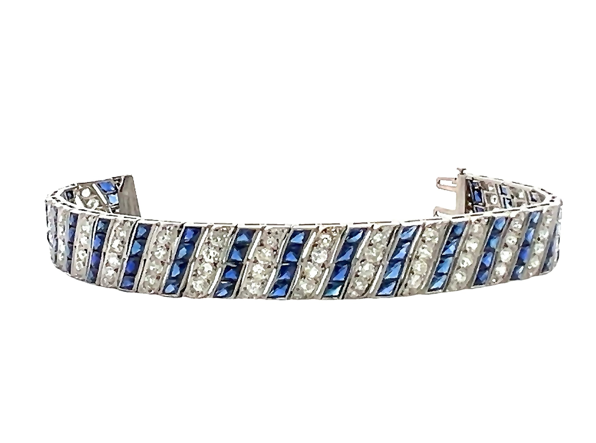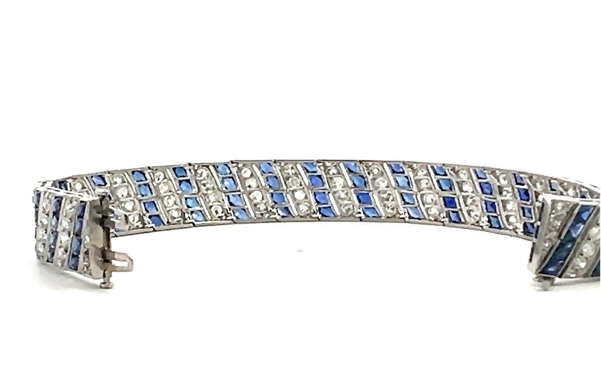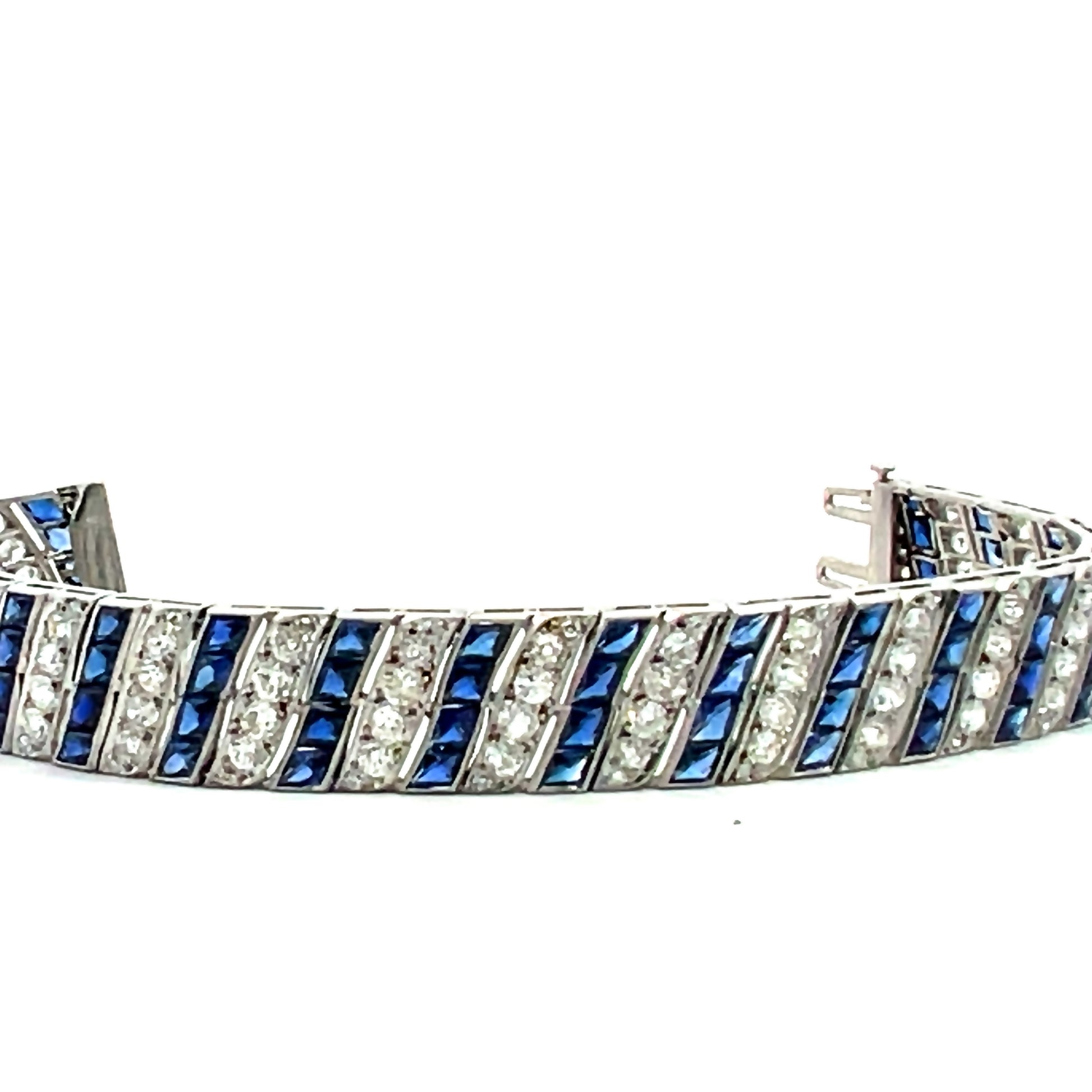 Synthetic sapphires were a fine Art Deco jewelry hallmark, reflecting the era’s craftsmanship and innovation. The old cut diamonds sparkle brilliantly, set against the refined platinum framework. A safety hook closure secures the bracelet, perfect for everyday elegance or special occasions. Whether worn alone or stacked with other pieces, this vintage treasure is a testament to exceptional design and historical authenticity—a must-have for collectors and lovers of fine antique jewelry.