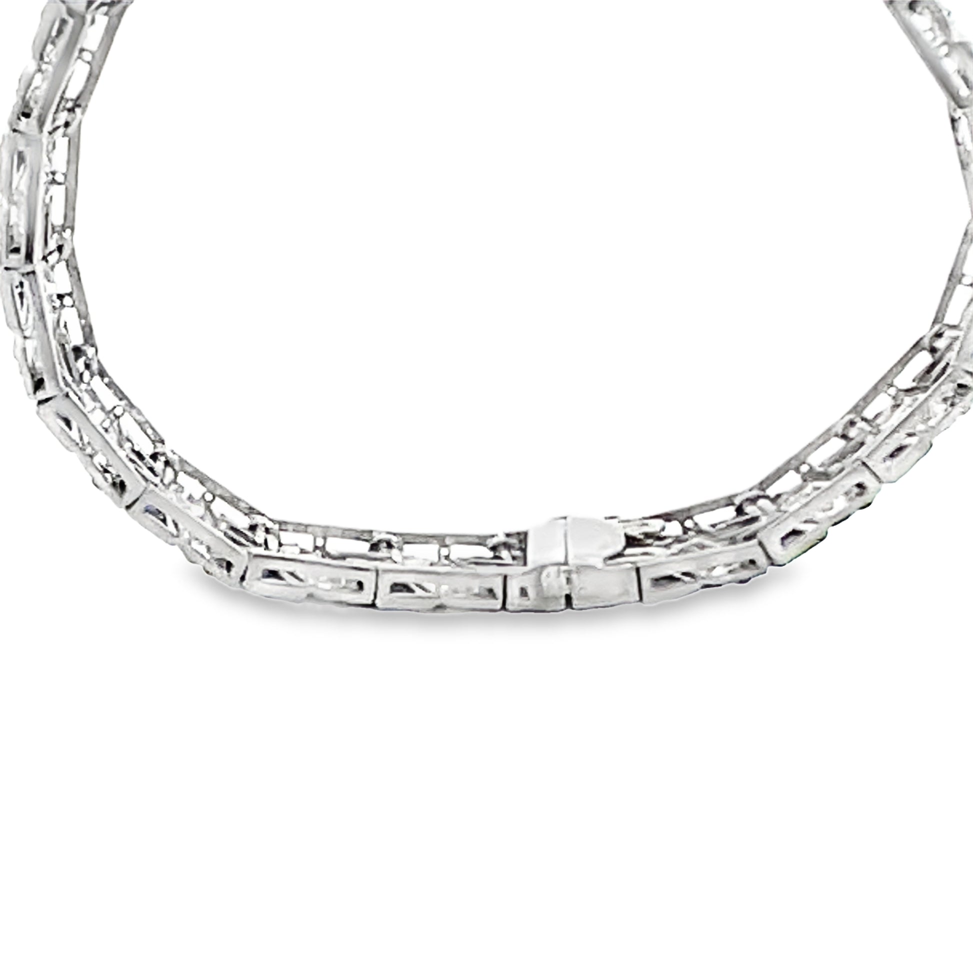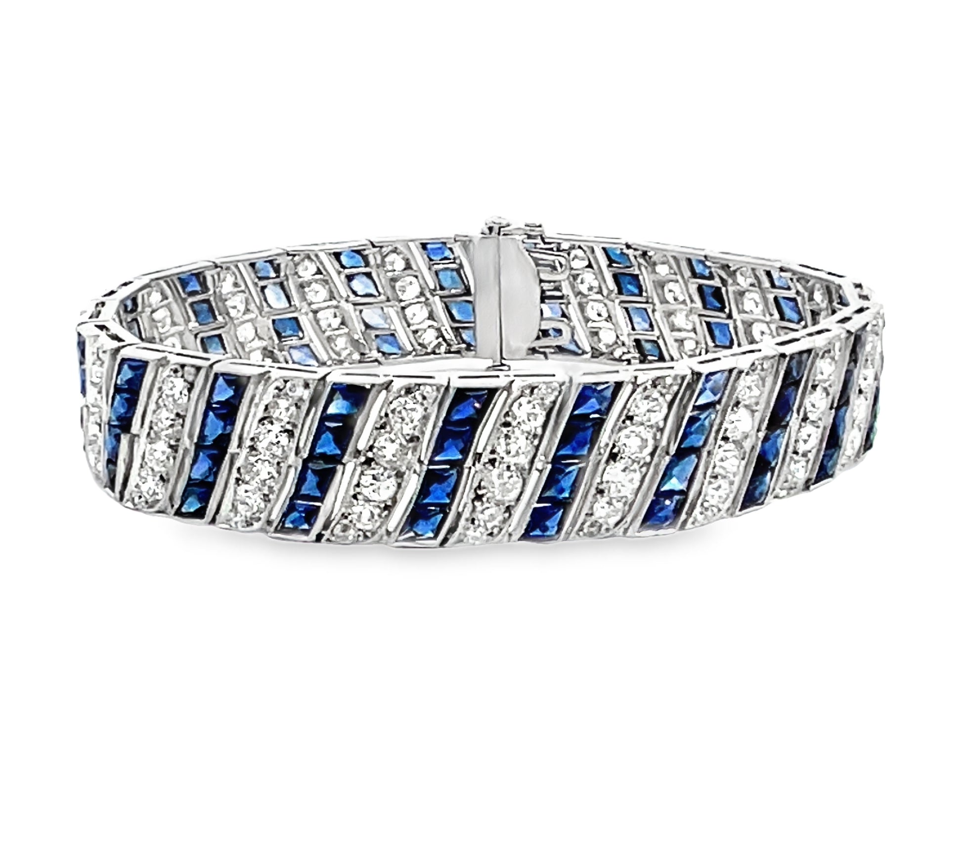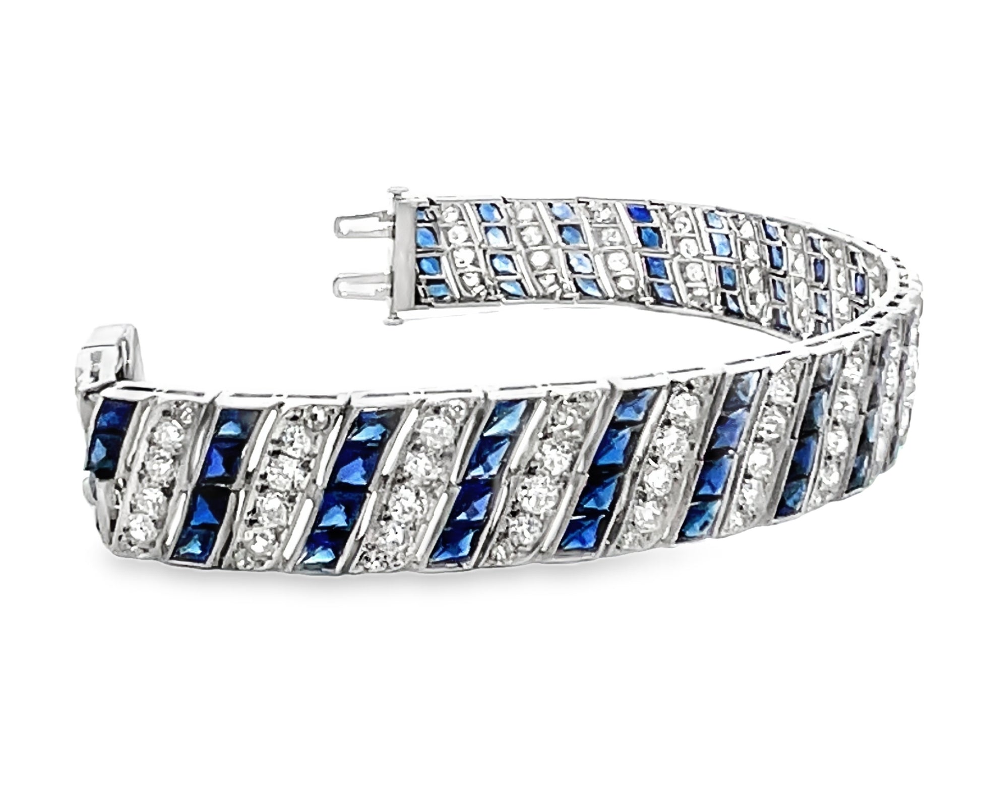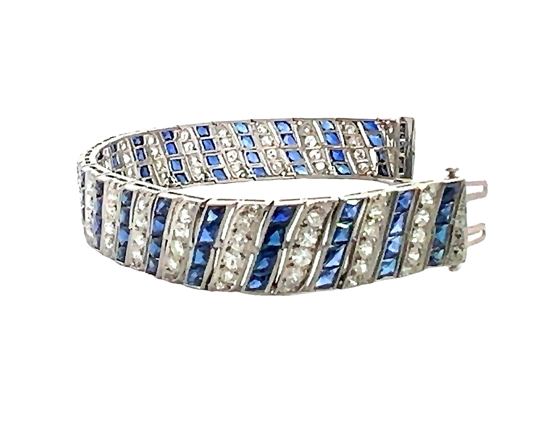 Synthetic sapphires were a fine Art Deco jewelry hallmark, reflecting the era’s craftsmanship and innovation. The old cut diamonds sparkle brilliantly, set against the refined platinum framework. A safety hook closure secures the bracelet, perfect for everyday elegance or special occasions. Whether worn alone or stacked with other pieces, this vintage treasure is a testament to exceptional design and historical authenticity—a must-have for collectors and lovers of fine antique jewelry.
