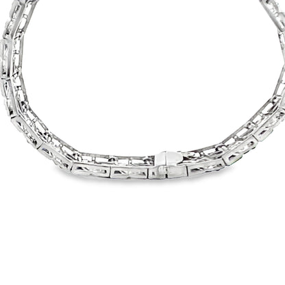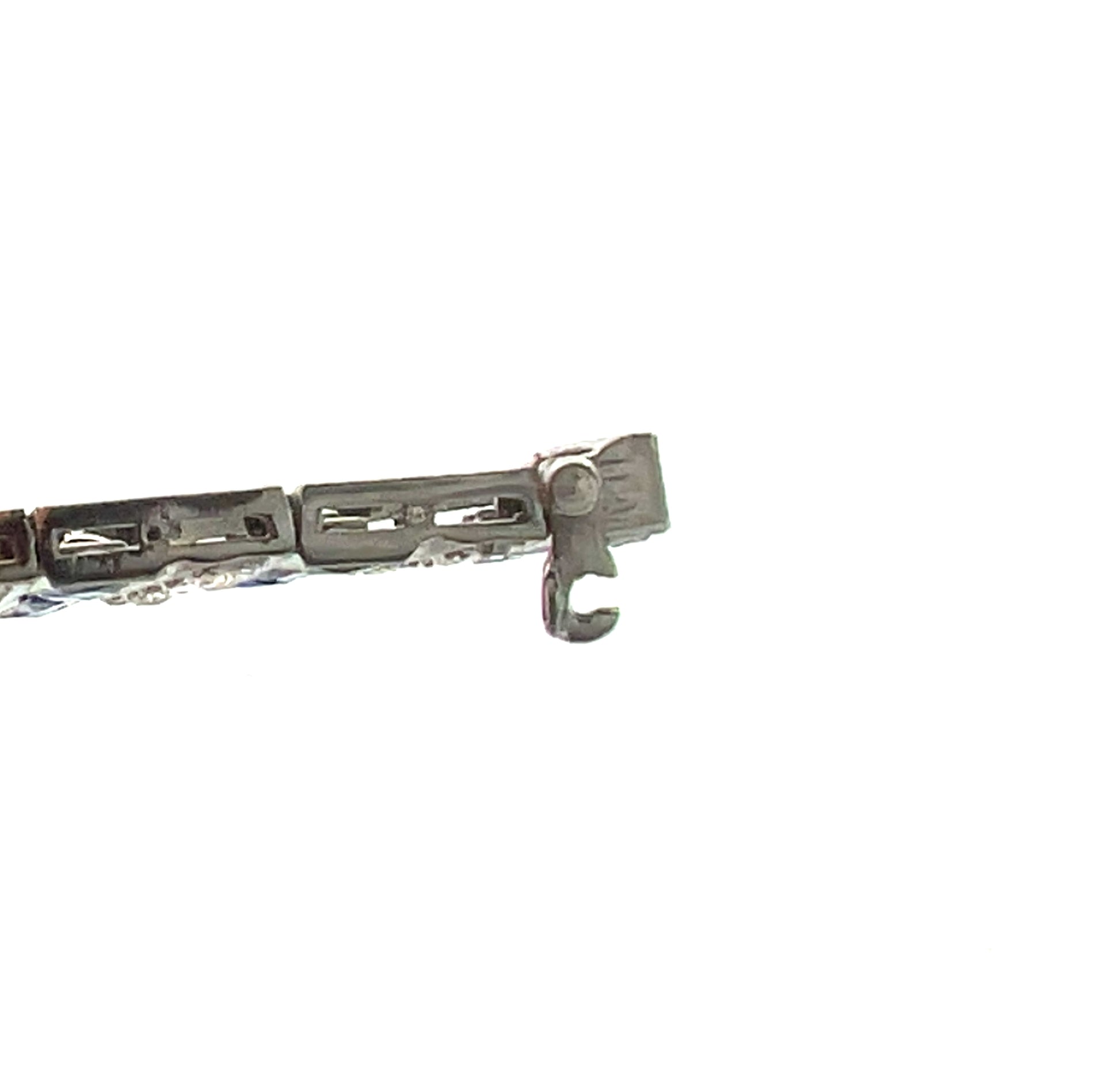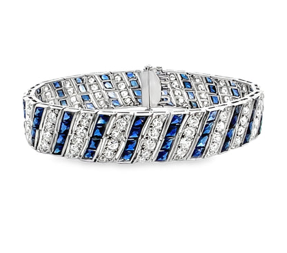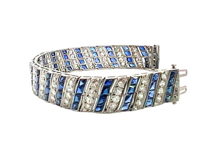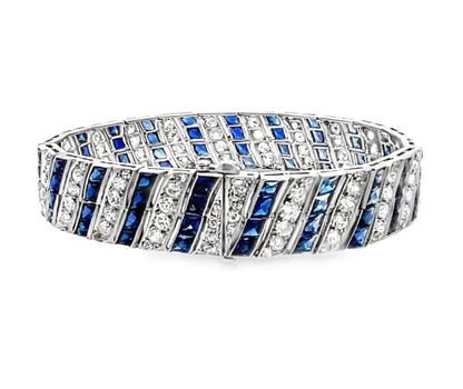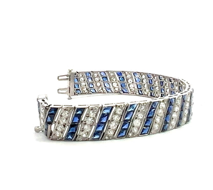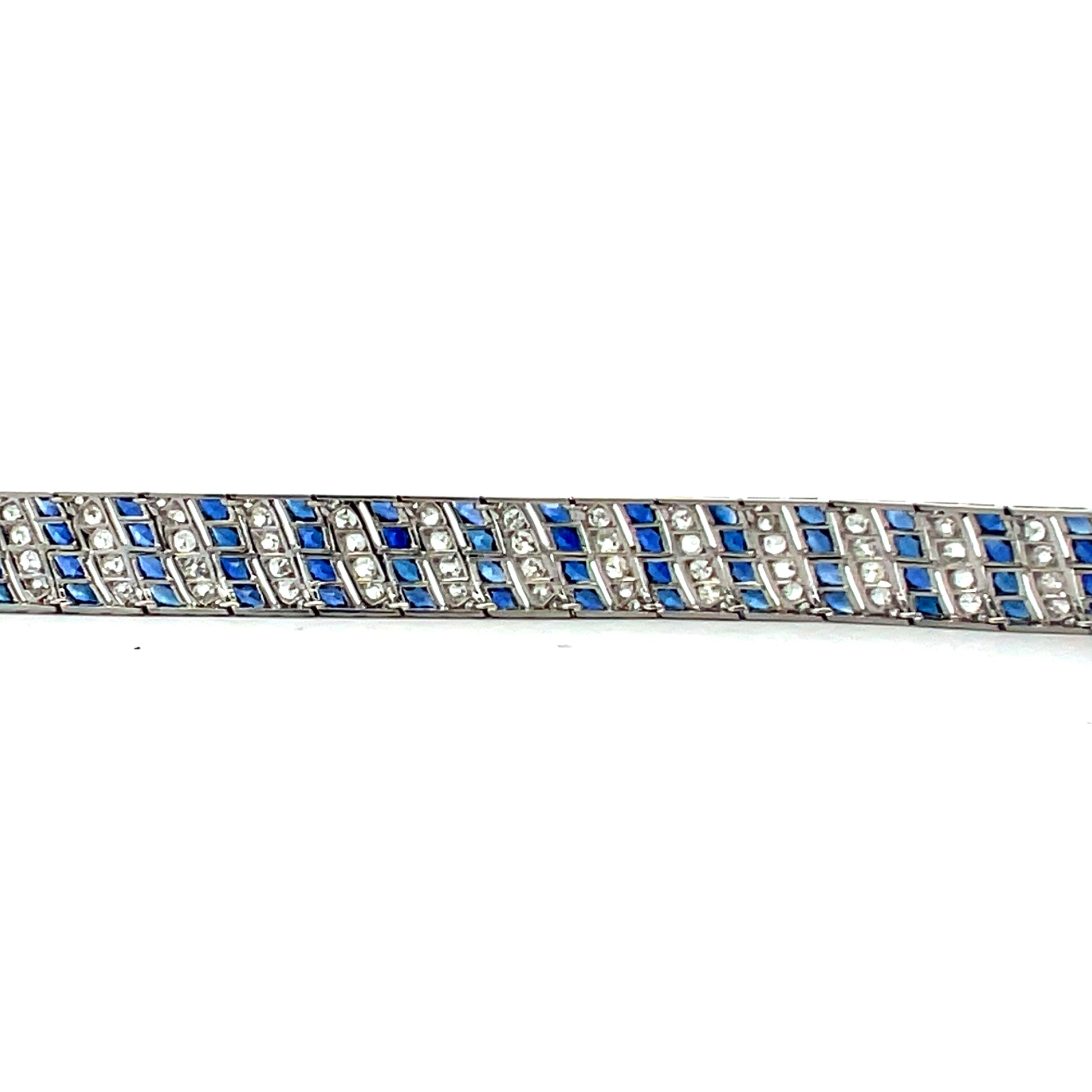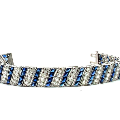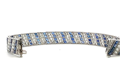 This exquisite Art Deco platinum bracelet showcases a mesmerizing design featuring 6 carats of old-cut white diamonds and intricately faceted carré-cut synthetic blue sapphires, all invisibly set for a seamless, luxurious look. The delicate filigree detailing enhances the vintage charm, while the flexible links allow for graceful movement on the wrist. Measuring 7 inches long and 0.50 inches wide, this bracelet weighs 35.40 grams of solid platinum, ensuring durability and timeless elegance.