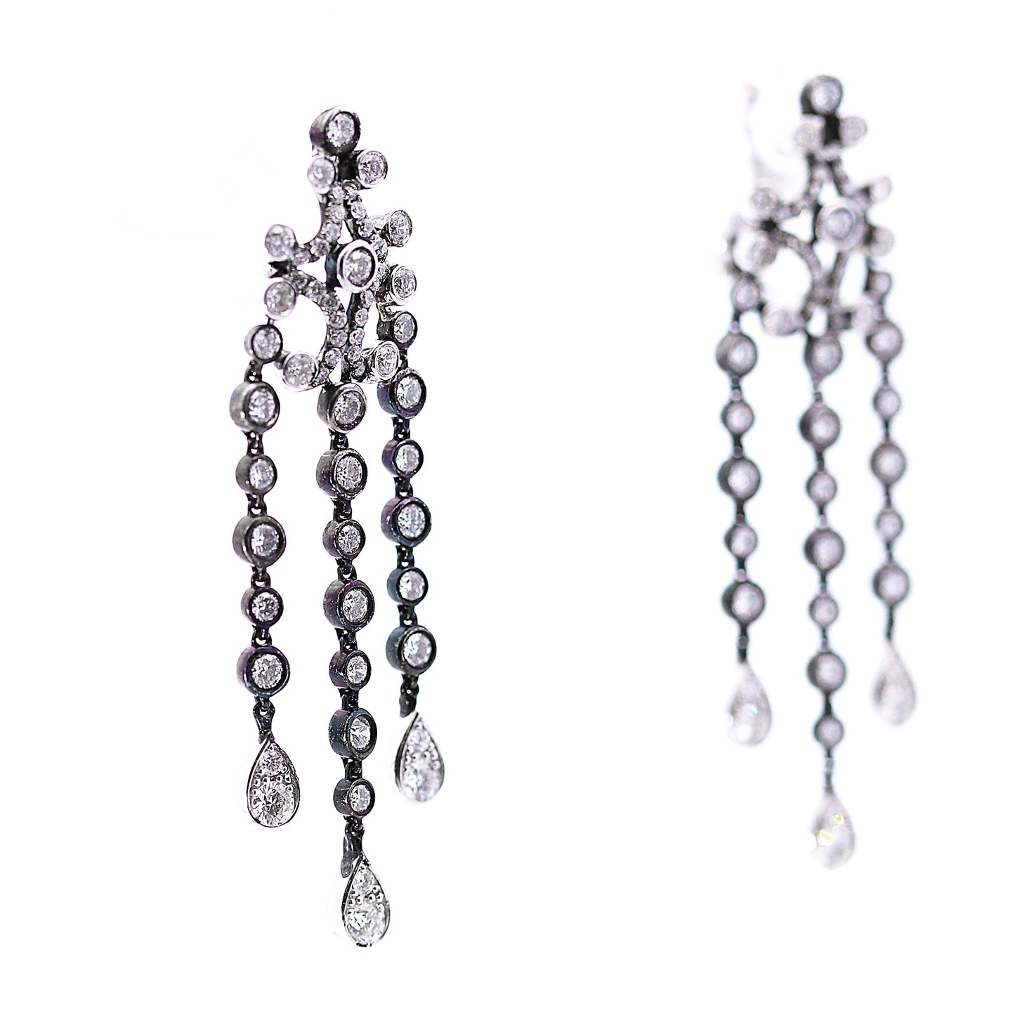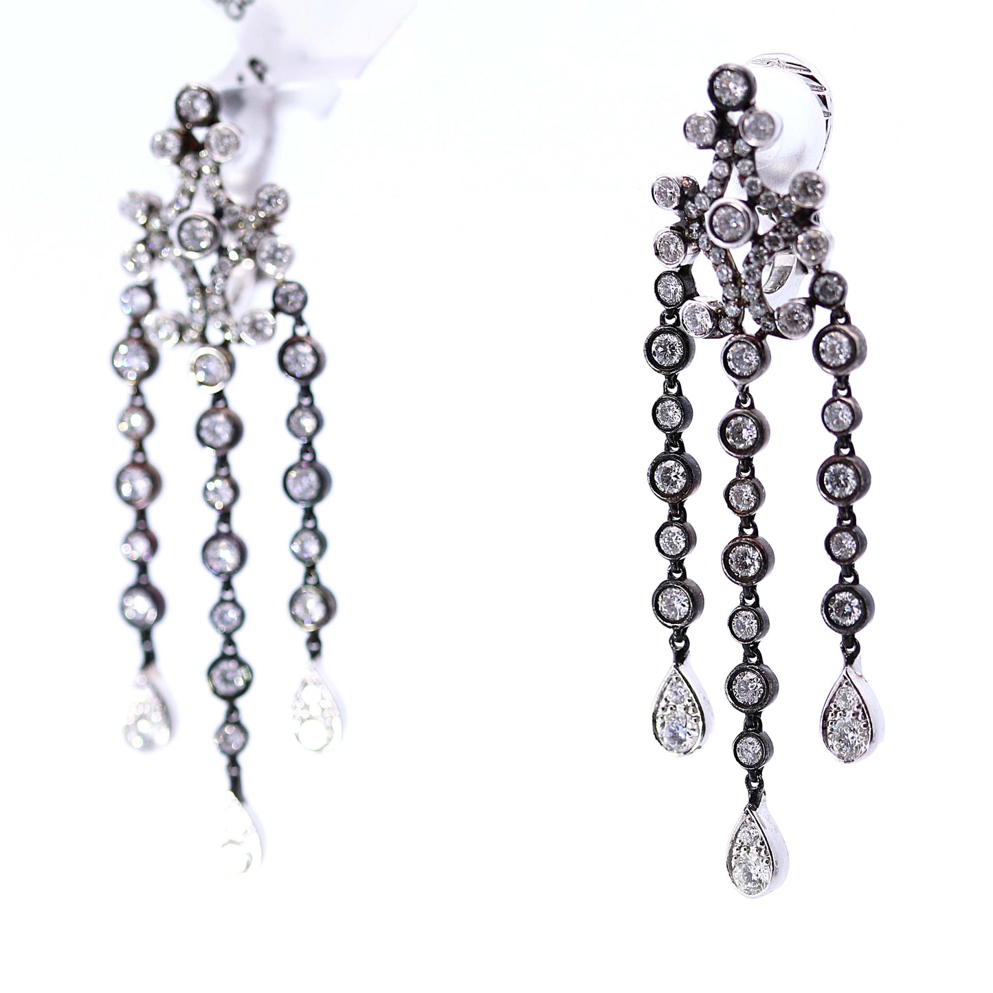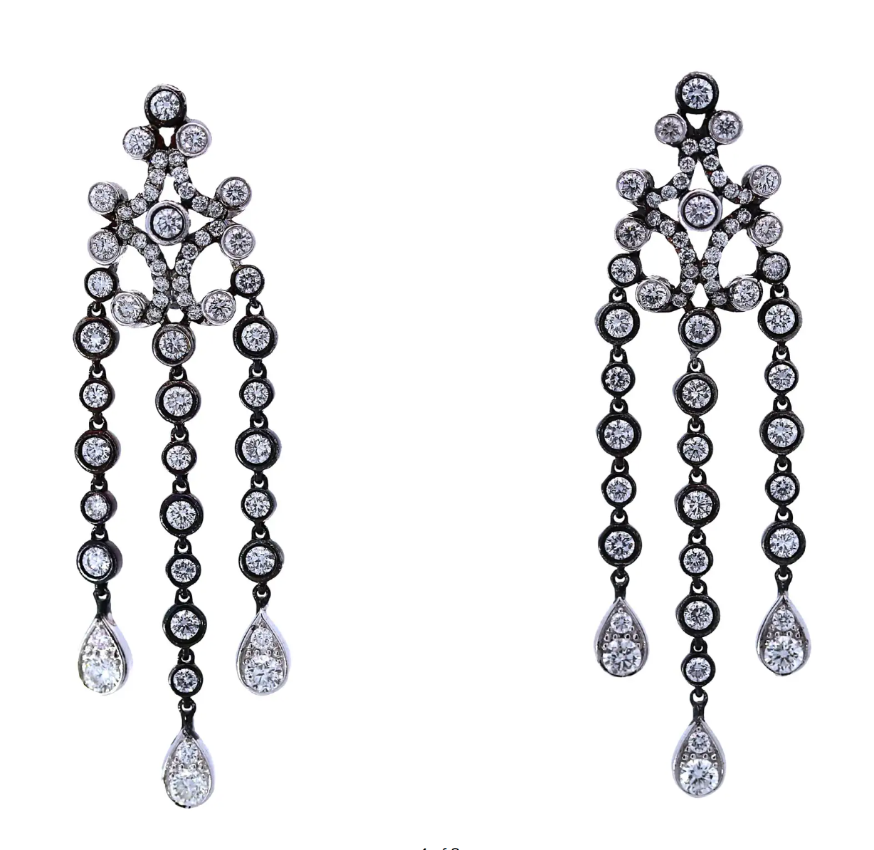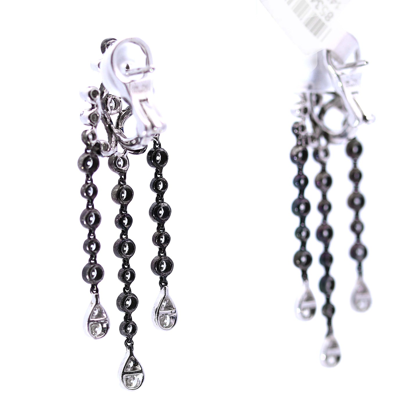Belle Époque inspired diamond dangle drop chandelier earrings. Crafted with precision and adorned with a mesmerizing cascade of diamonds totaling 3.01 carats, each earring embodies sophistication and allure. Set in luxurious 14-karat white gold with black rhodium accents, these chandelier earrings dazzle at approximately 2.5 inches in length. The earrings are designed with 3.01 carats of sparkling white round brilliant cut diamonds. The bottom tears are made with 2 round brilliants creating a pear-shaped illusion.