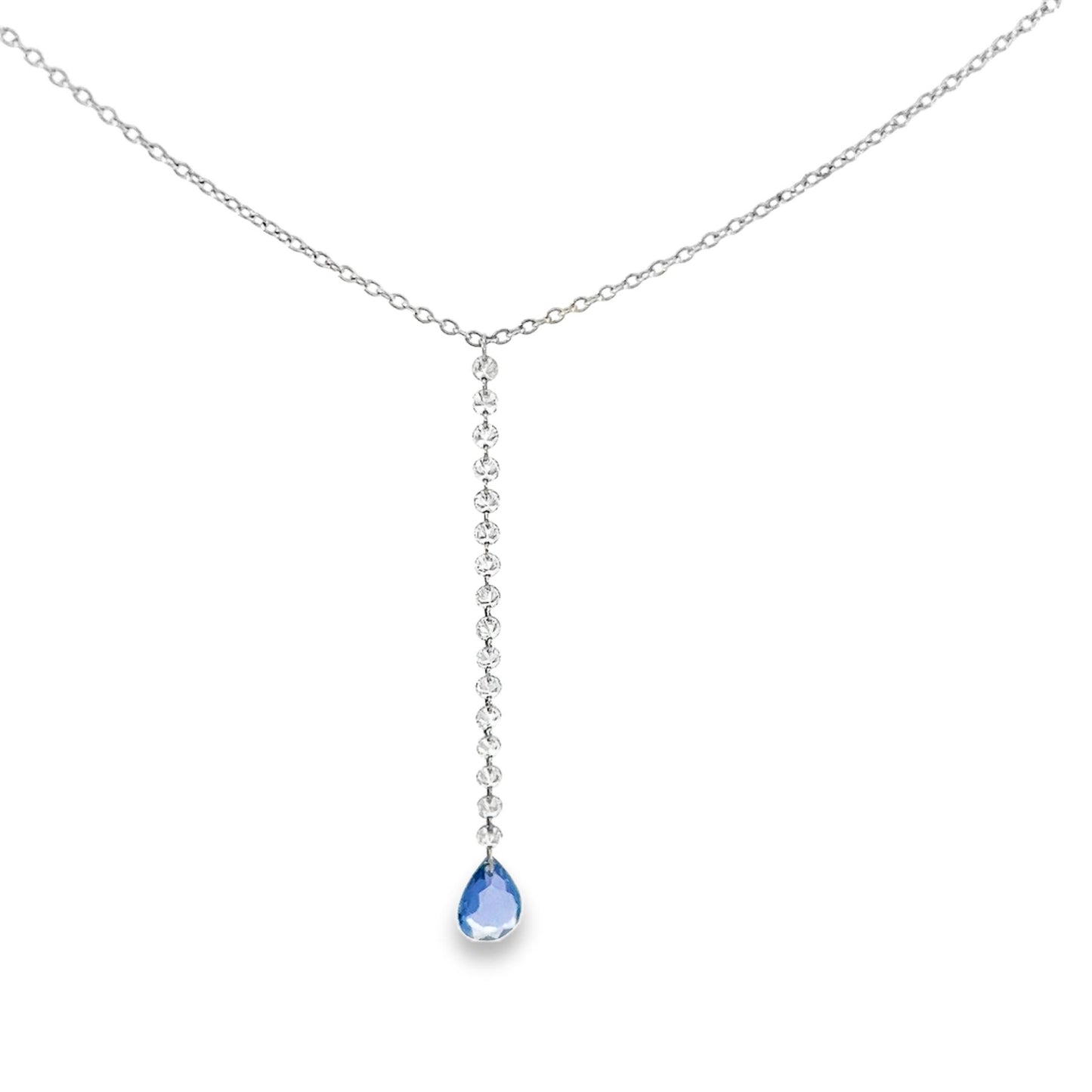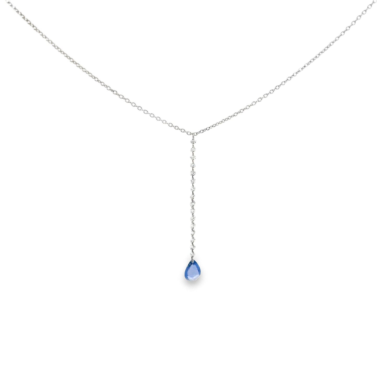 Adjustable 18K White Gold Lariat Necklace with Diamonds and 0.80-carat Sapphire Pendant. This exquisite 18K white gold necklace features a unique adjustable chain that keeps the pendant perfectly centered, whether worn short or long. This piece combines elegance and versatility and is highlighted by 16 shimmering bright white diamonds, 0.61 total carats, cascading into a pear-shaped, 0.80-carat royal blue sapphire.