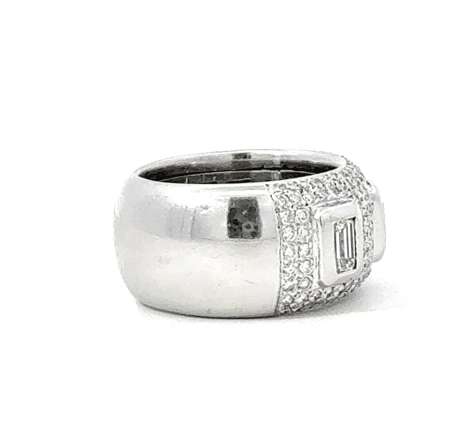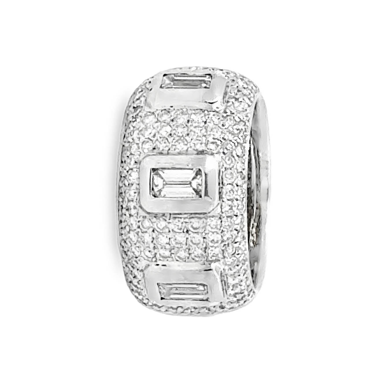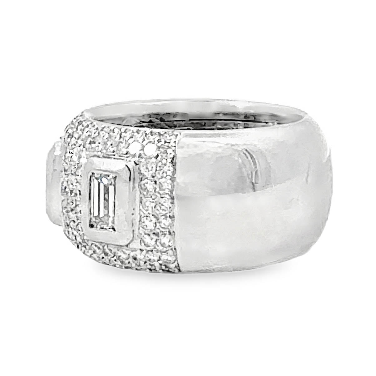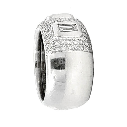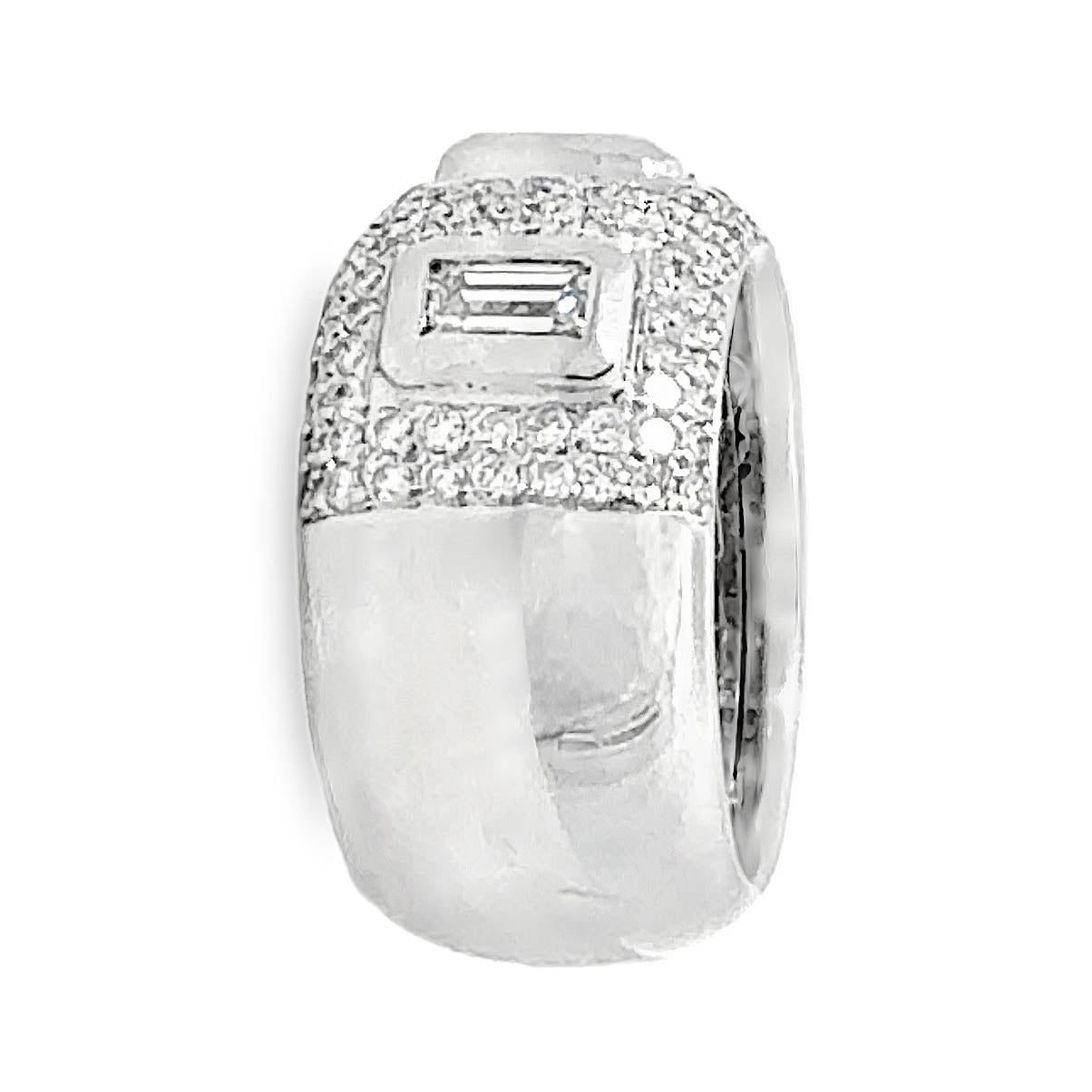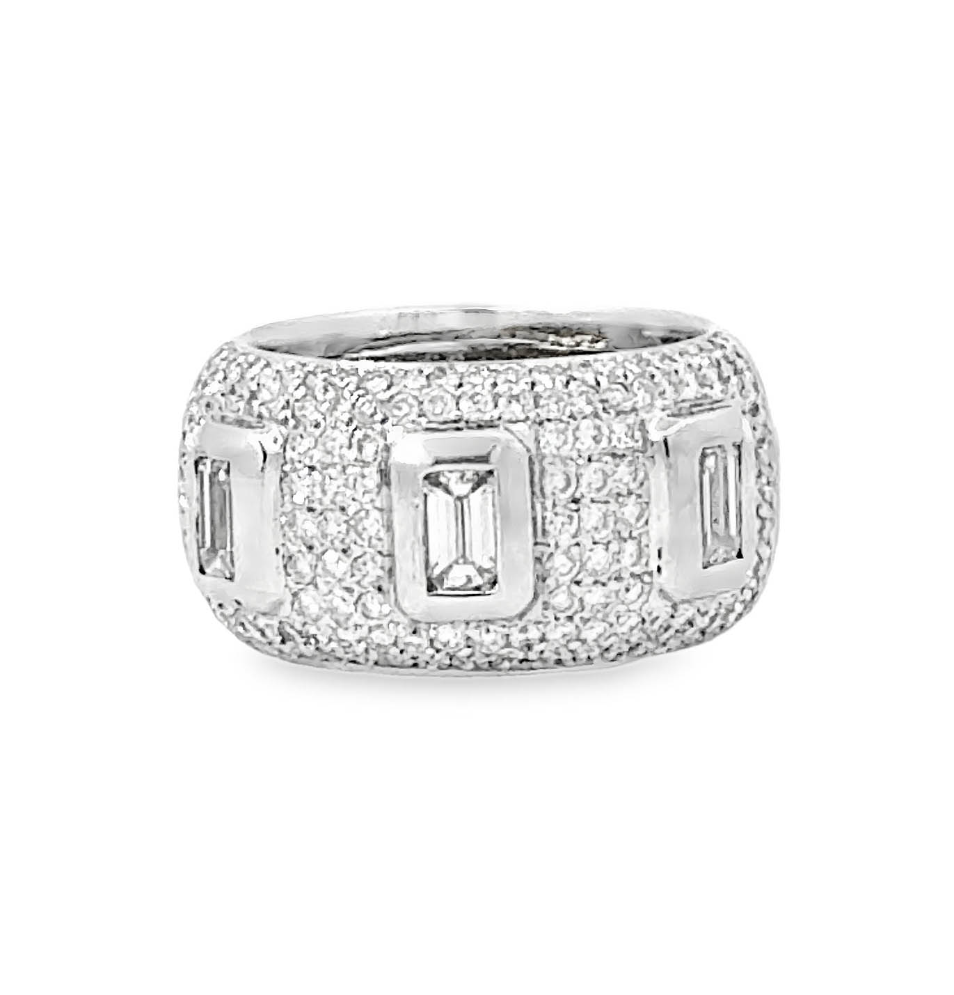 This bold diamond baguette band ring in 18K white gold is a striking statement piece featuring exceptional craftsmanship and a fashion-forward design. The 12.3 mm wide band showcases three bezel-set rectangular baguette diamonds, artfully spaced and framed by a dazzling array of round brilliant diamonds pavé-set halfway around the band. Weighing 20.0 grams and crafted in rich 18 karat white gold, the ring offers substantial presence and luxurious weight.
