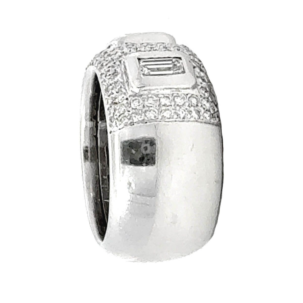 The diamonds are exceptionally bright white and clean, delivering outstanding brilliance and visual impact. The clean bezel settings enhance the angular geometry of the baguettes, while the pavé diamonds add rich texture and sparkle. The ring's interior is beautifully detailed, a testament to its refined construction and attention to comfort.