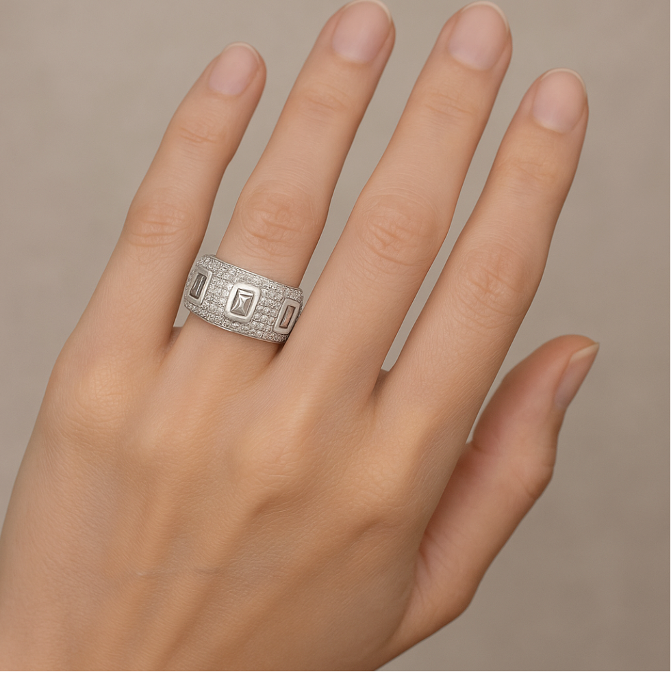 This iconic design is bold and timeless. It is a fashion-forward band ring perfect for collectors, connoisseurs, or anyone seeking a powerful everyday statement. It is a wearable work of art that combines modern glamour with classic diamond elegance.