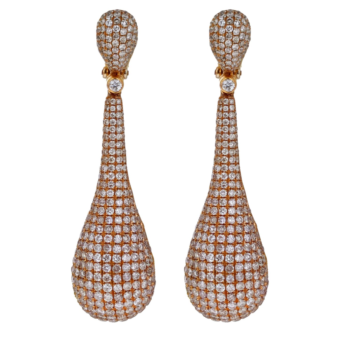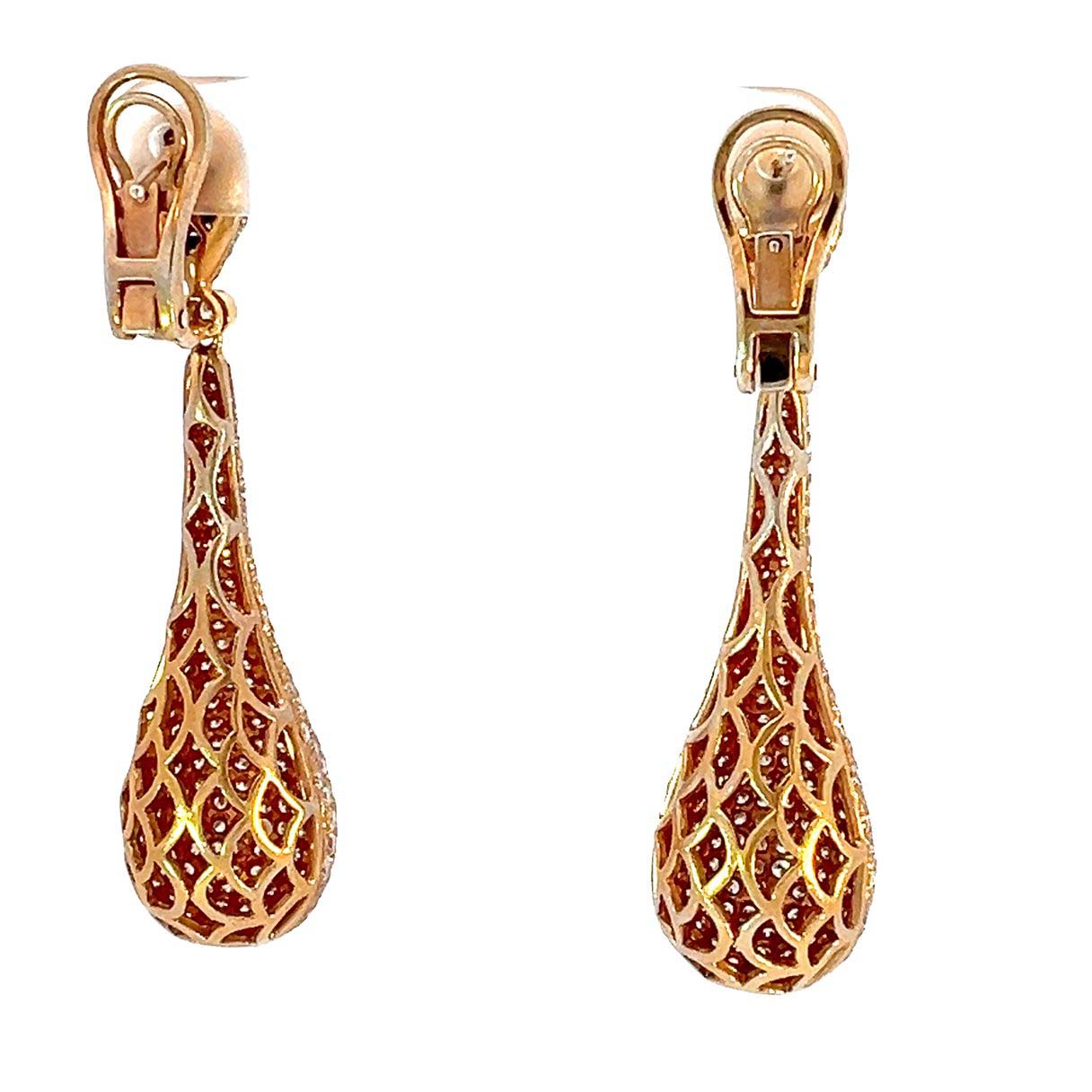 18-karat rose gold dangle earrings feature approximately 7.00 carats of round brilliant cut diamonds in G/H color and VS/SI clarity. The teardrop design, measuring 2 1/8 inches long, cascades elegantly from the lobe, with a sparkling diamond front and an open back showcasing the intricate craftsmanship. Lightweight and comfortable, these earrings can be worn as posts or clip-ons with their versatile omega lever backs. Combining timeless elegance and modern wearability, they are sure to make a statement and turn heads on any occasion.