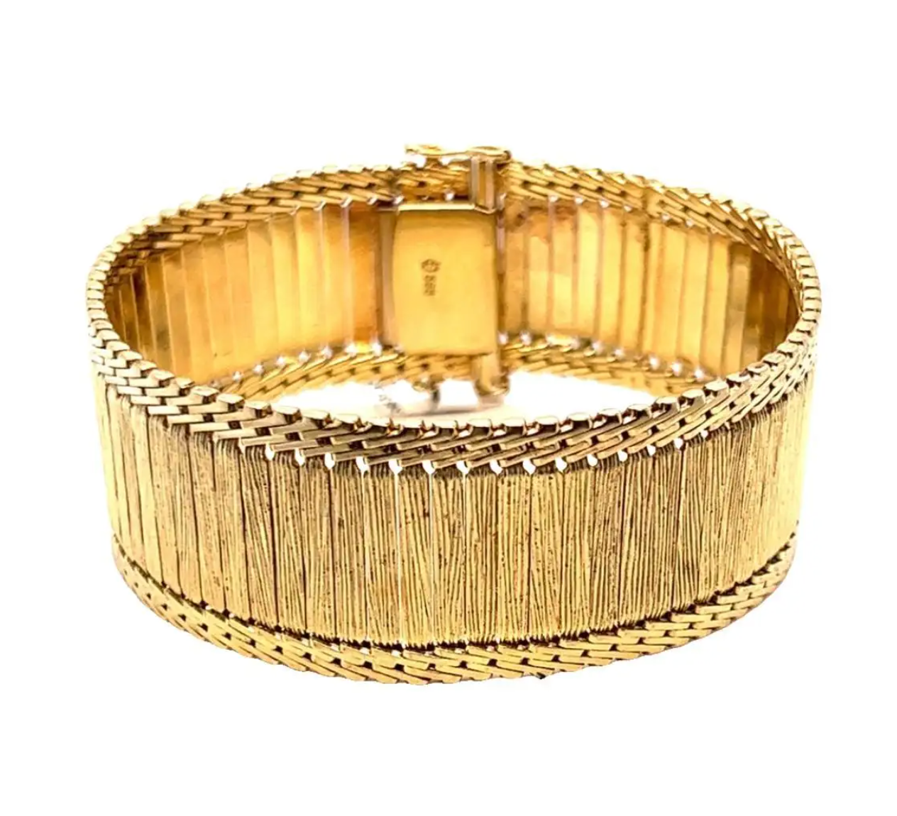 our French Textured 14k Yellow Gold Retro Style Bracelet, meticulously crafted to exude sophistication and versatility. This exquisite bracelet combines luxurious craftsmanship with a flexible hinged design, making it a coveted addition to any jewelry collection.