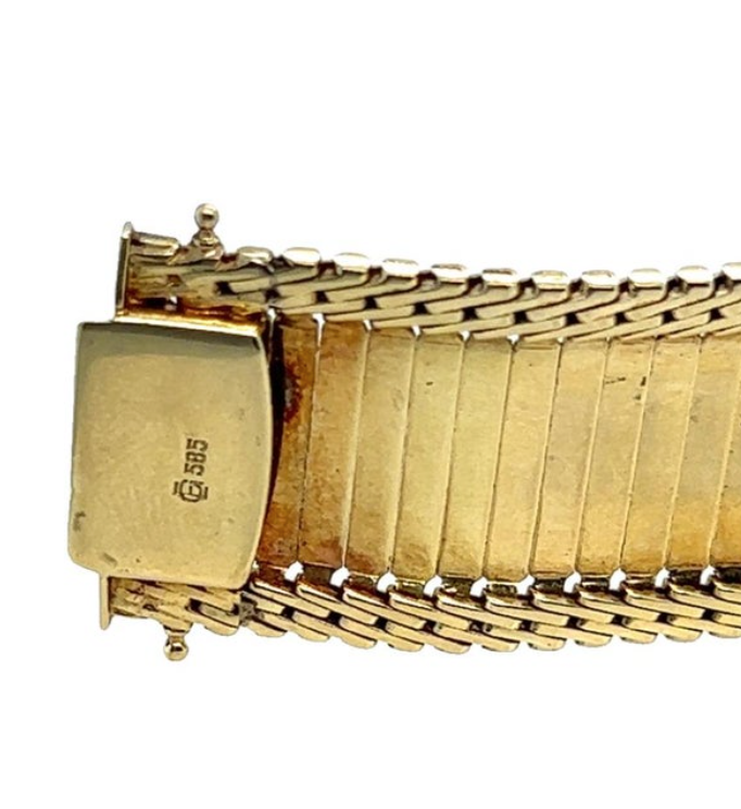 Expertly textured in the French tradition, this bracelet showcases a captivating retro style that effortlessly complements both contemporary and classic attire. The 14k yellow gold composition is marked with a stamped 585 insignia, signifying its exceptional quality and authenticity. Despite its substantial presence, the bracelet remains pleasantly lightweight at 51 grams, ensuring ease of wear for extended periods.