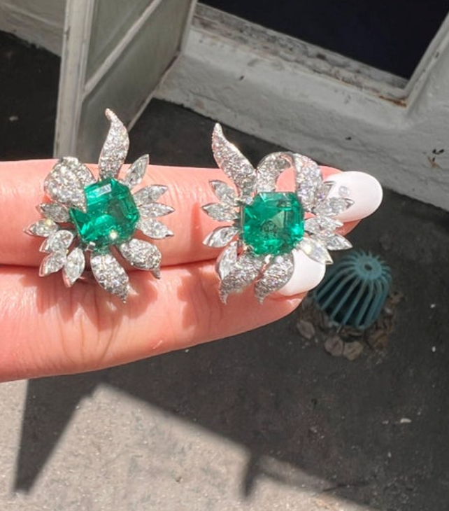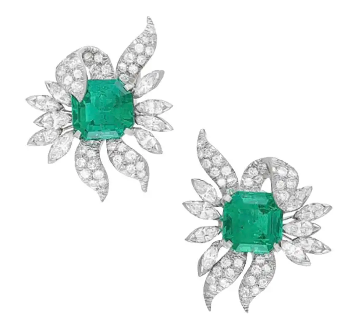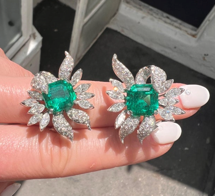 GIA-certified, 10.07-carat Colombia Minor Emerald and diamond Retro lever back stud earrings.