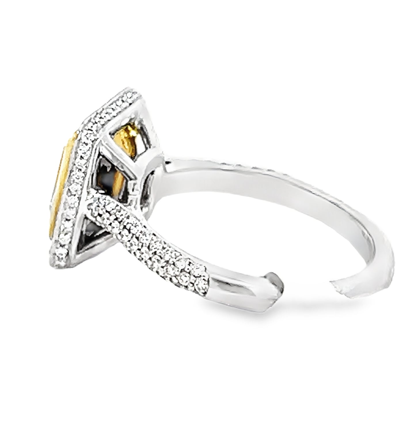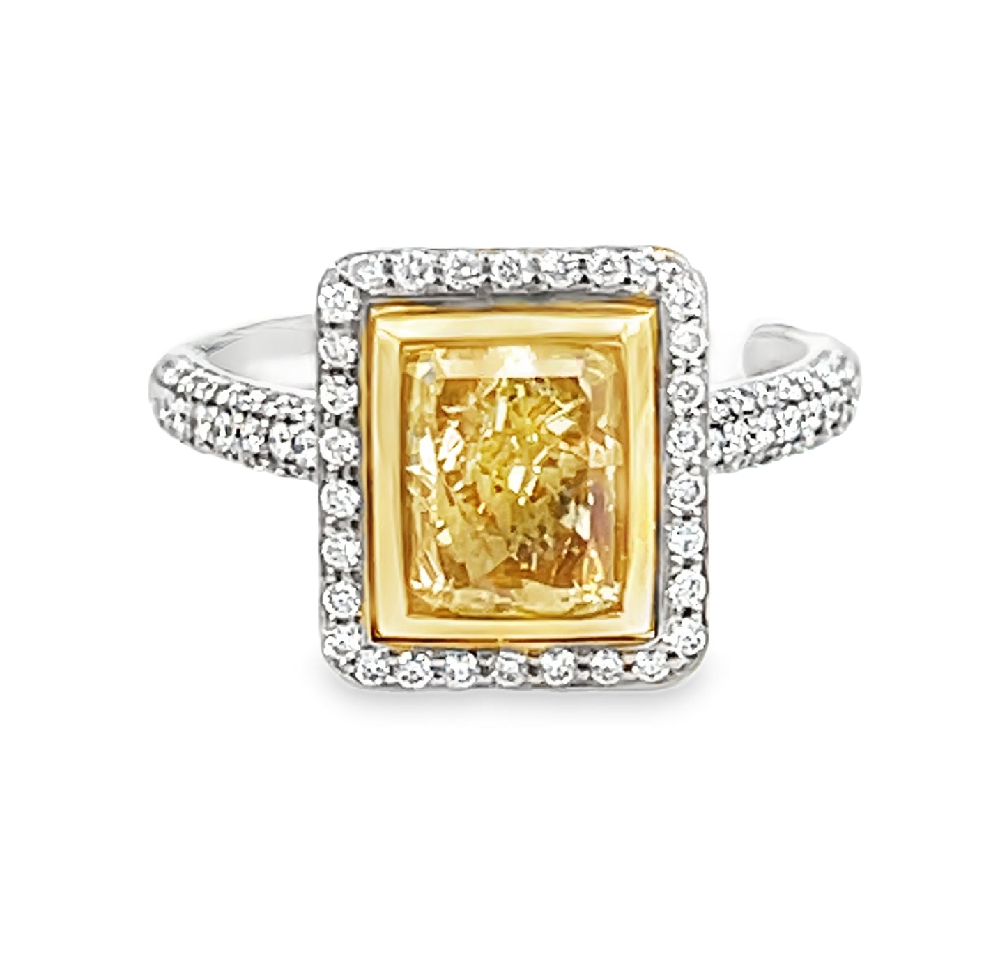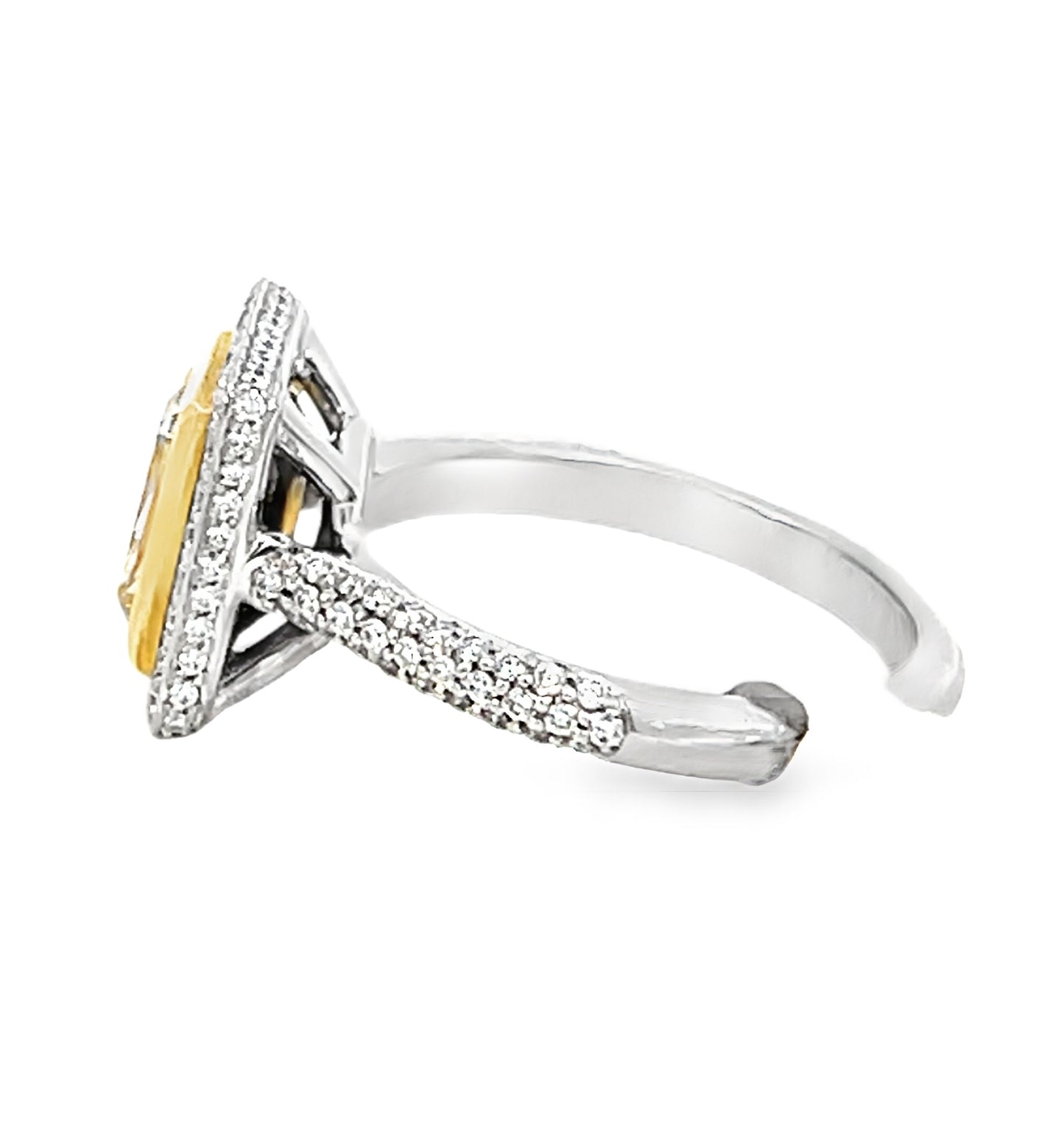 The center diamond is surrounded by a halo of white diamonds weighing 0.44 carats. Pave-set diamonds adorn all three sides of the band, creating sparkle and beauty from every angle. The yellow gold setting highlights the fancy yellow diamond, while the white gold band adds a sleek, modern touch.