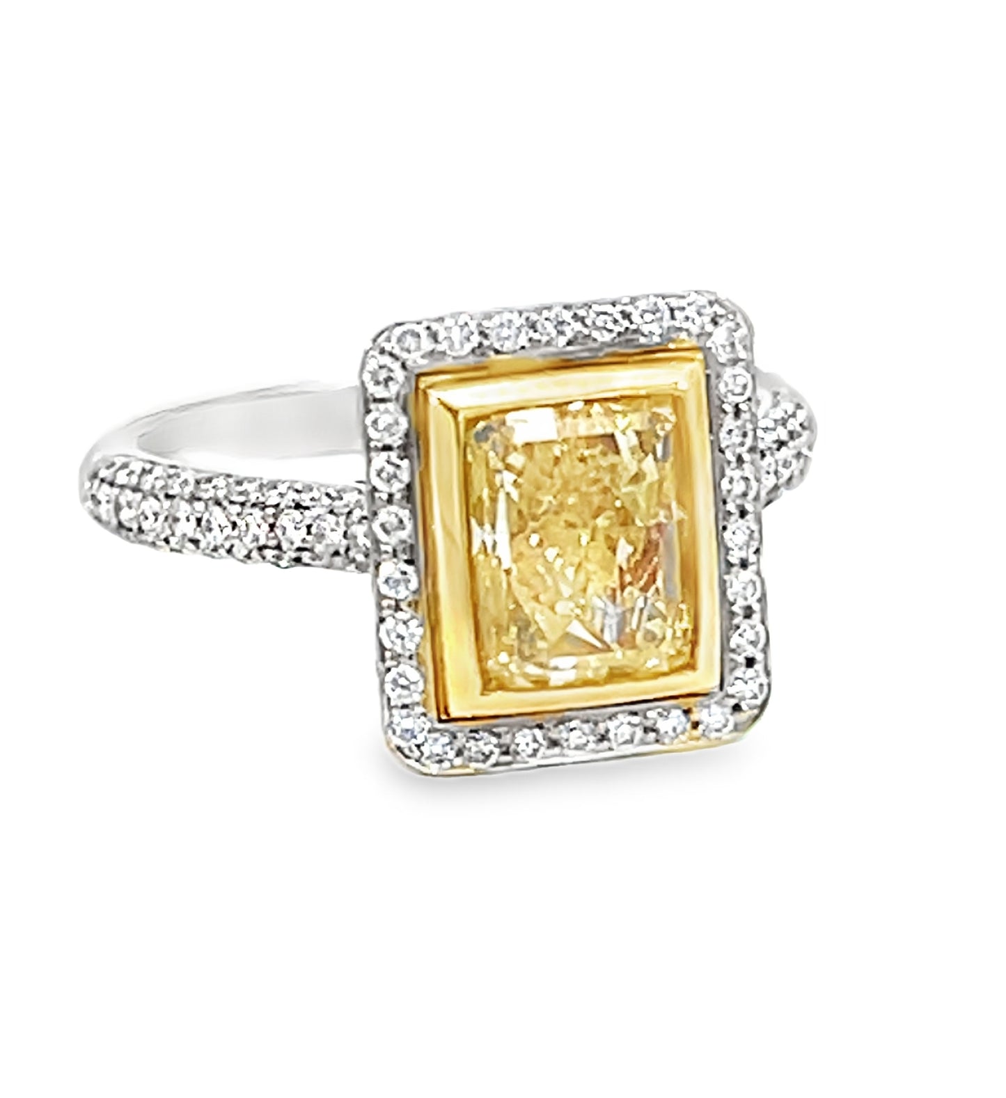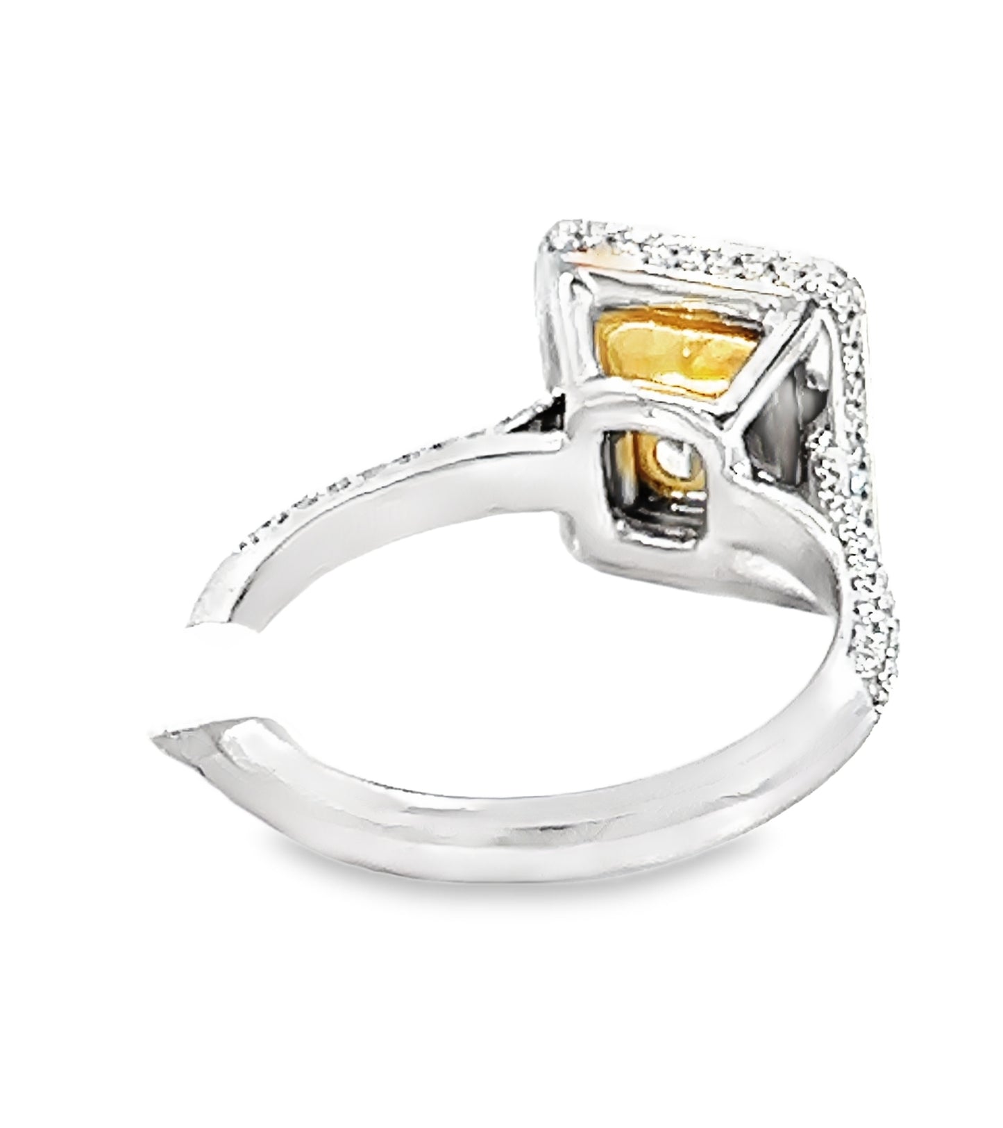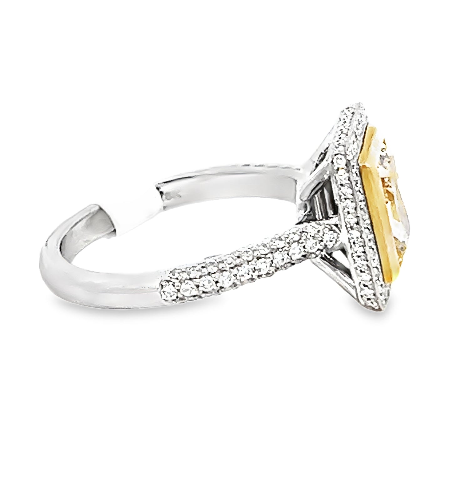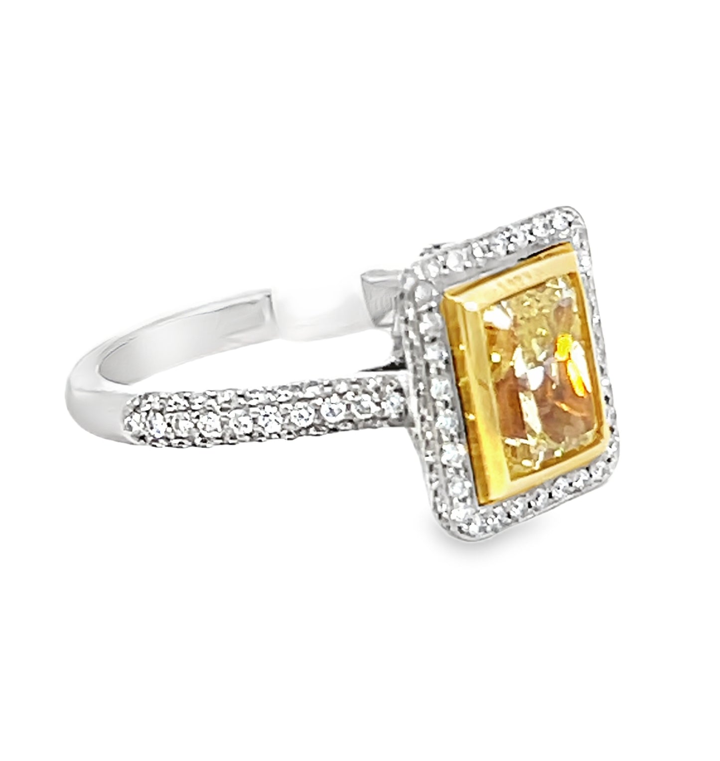 The center diamond is surrounded by a halo of white diamonds weighing 0.44 carats. Pave-set diamonds adorn all three sides of the band, creating sparkle and beauty from every angle. The yellow gold setting highlights the fancy yellow diamond, while the white gold band adds a sleek, modern touch.