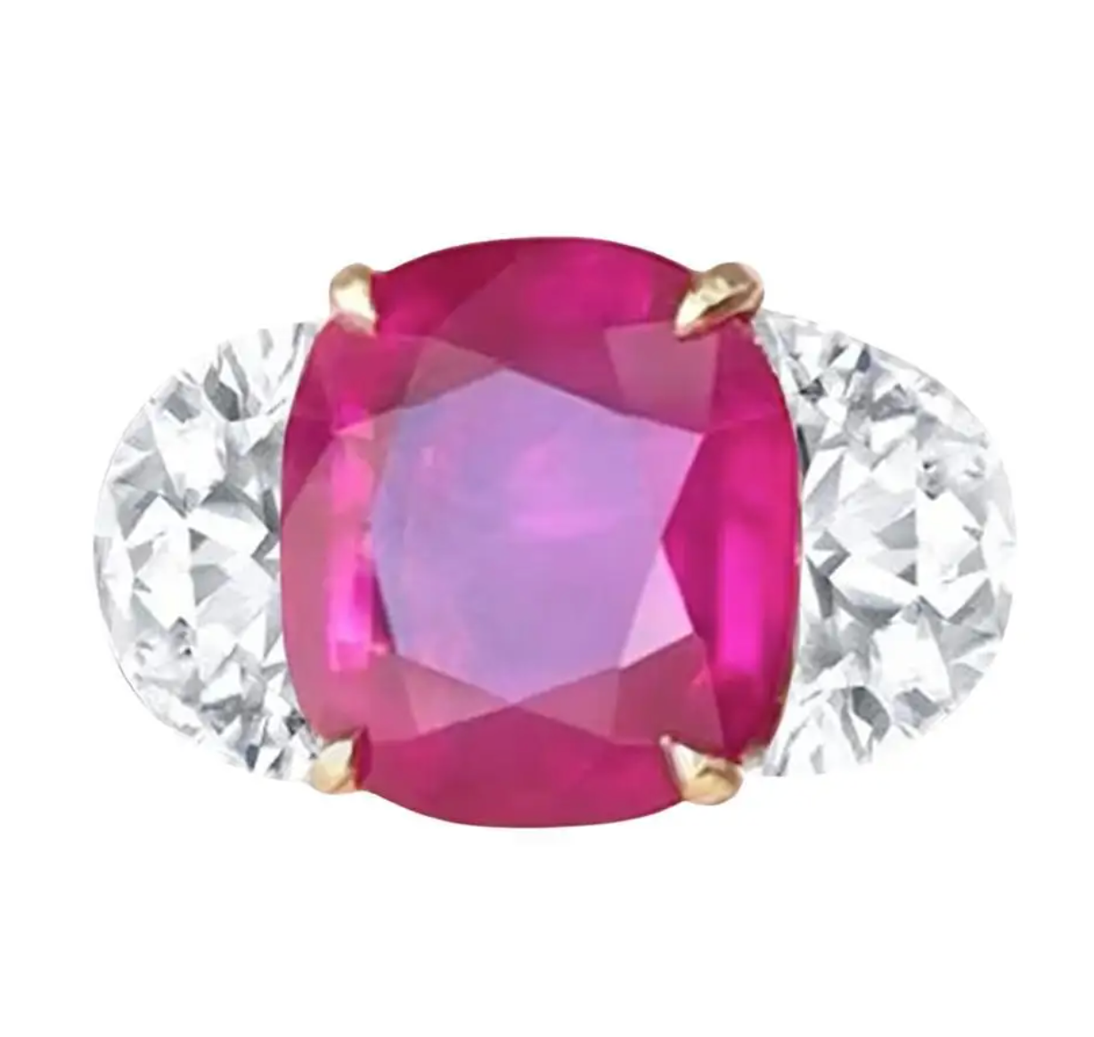 The Burma No-Heat ruby has been certified by the GIA. The GIA report states that the natural gemstone weighs 4.38 carats, is cushion brilliant cut, and measures 11.10 x 9.40 x 4.33mm. The origin is Burma (Myanmar), the color is described as red, and there are no indications of heating.