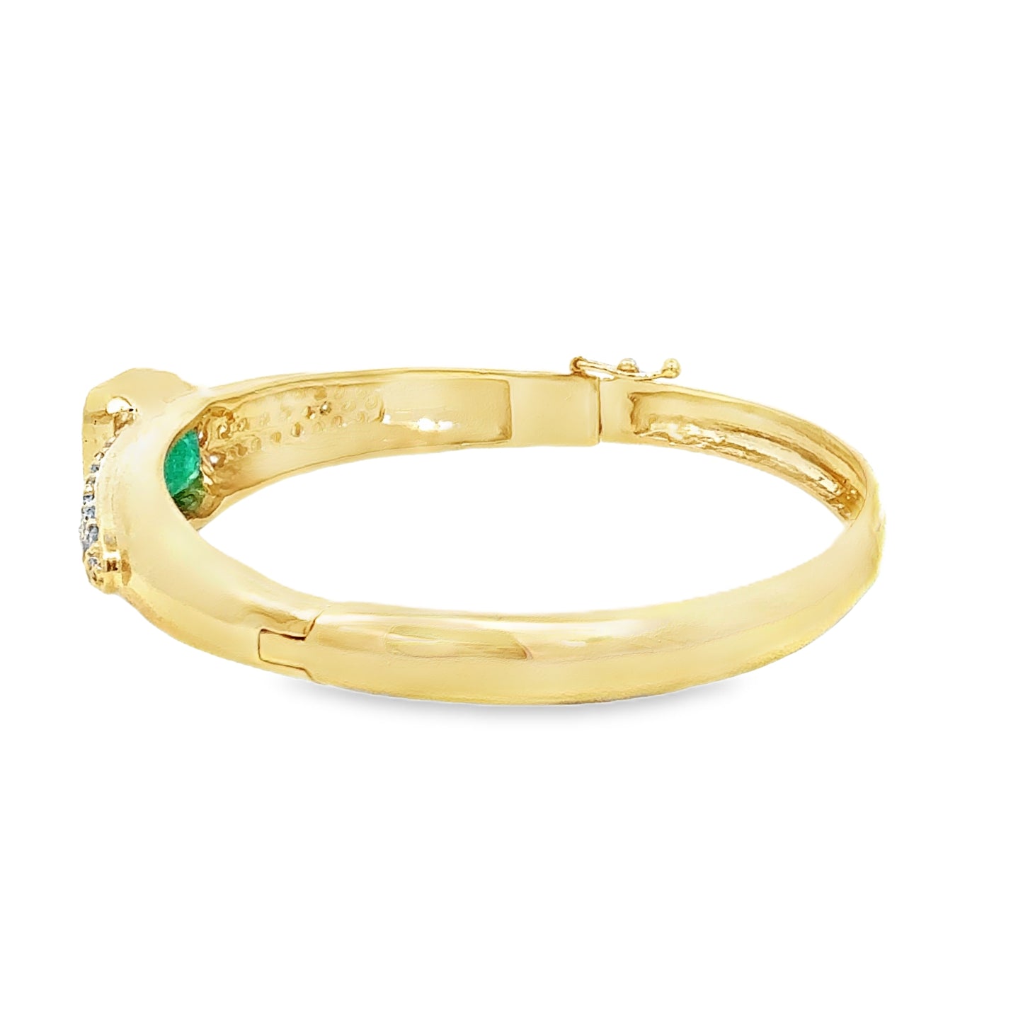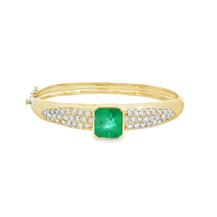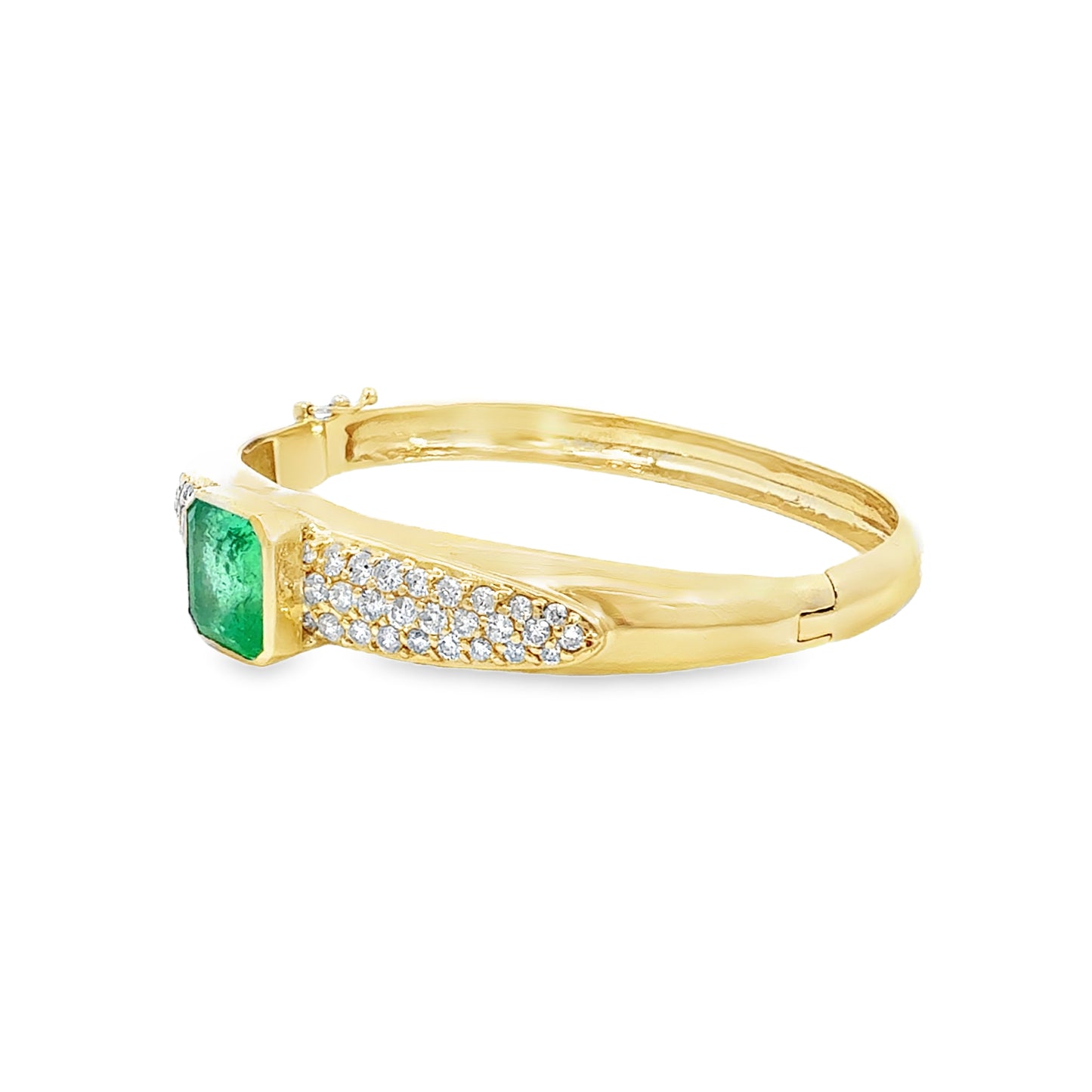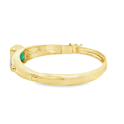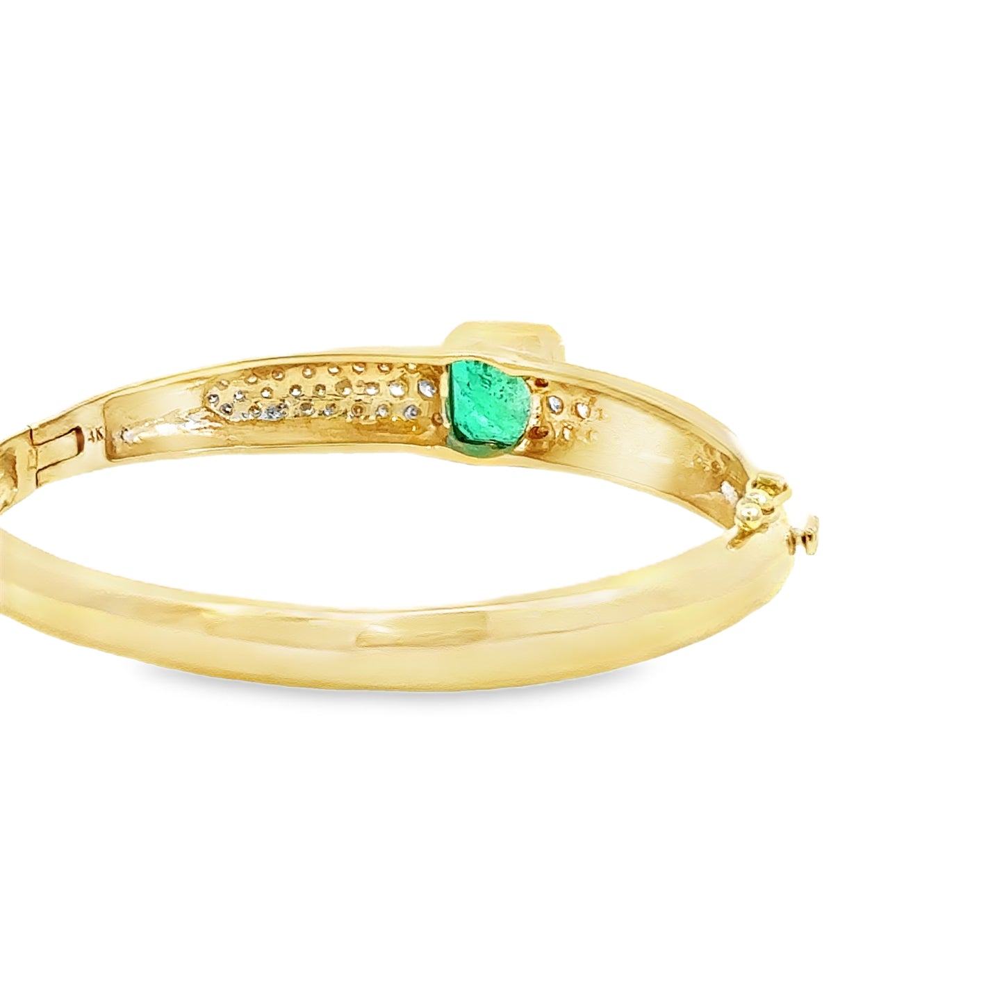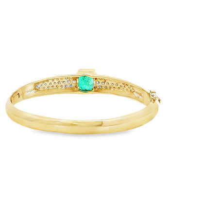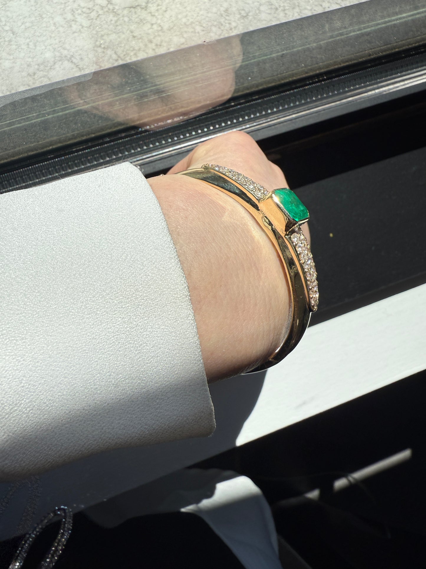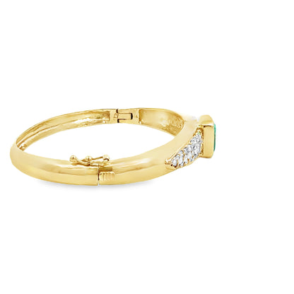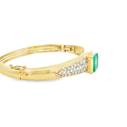 GIA Certified 6.96 Carat Colombian Emerald and Diamond Vintage 14K Yellow Gold Bangle Bracelet