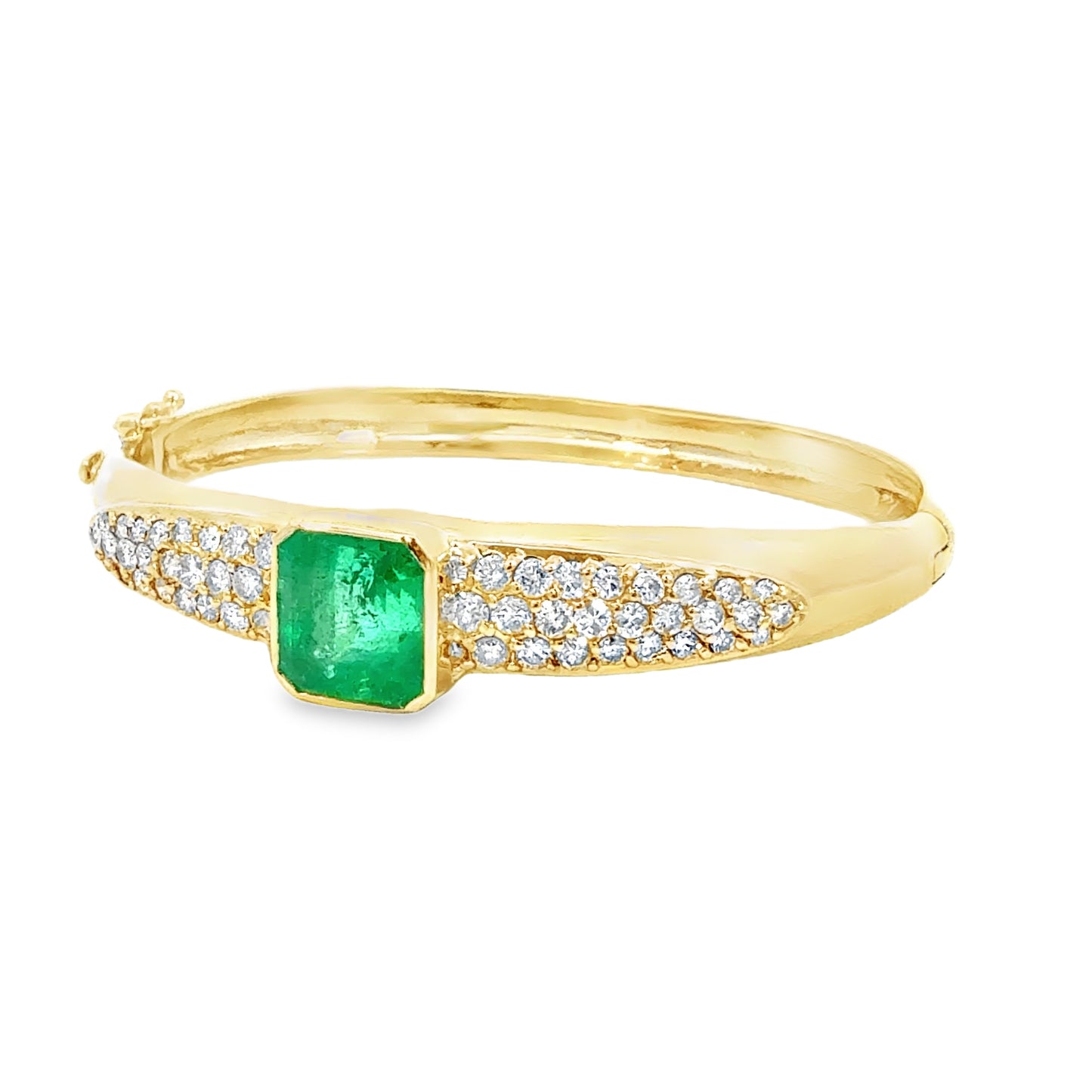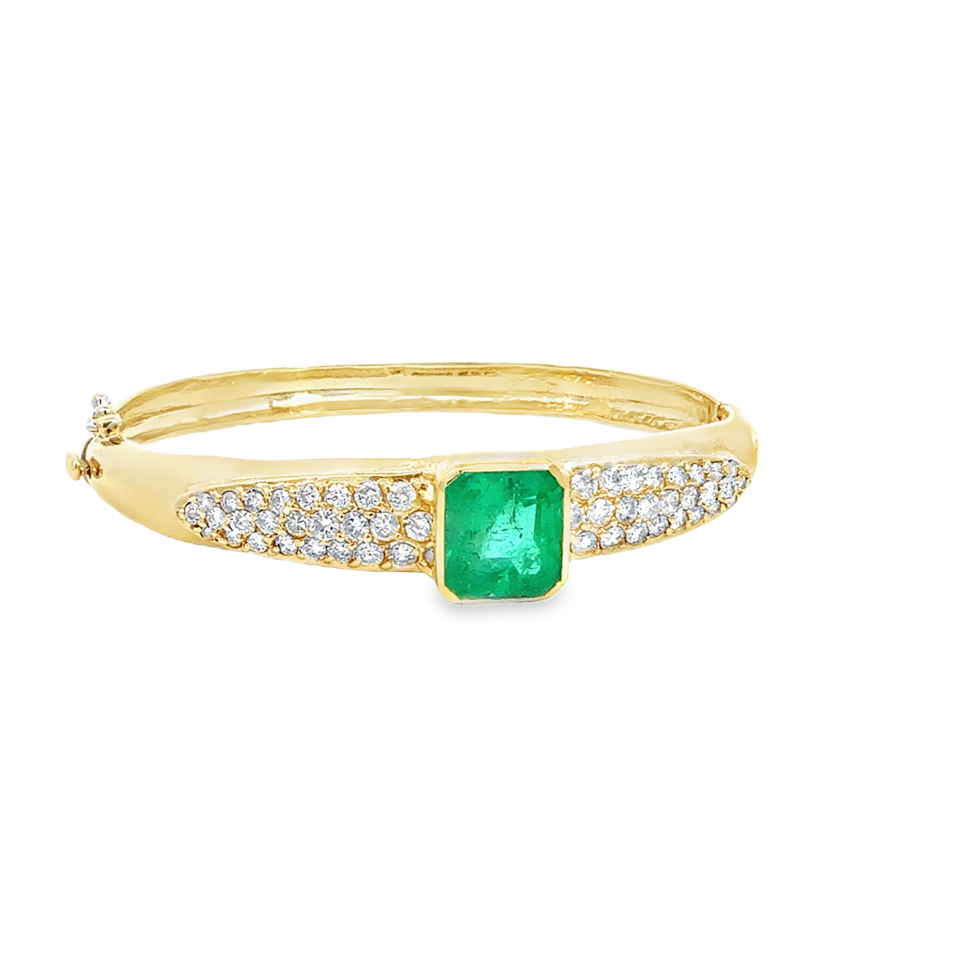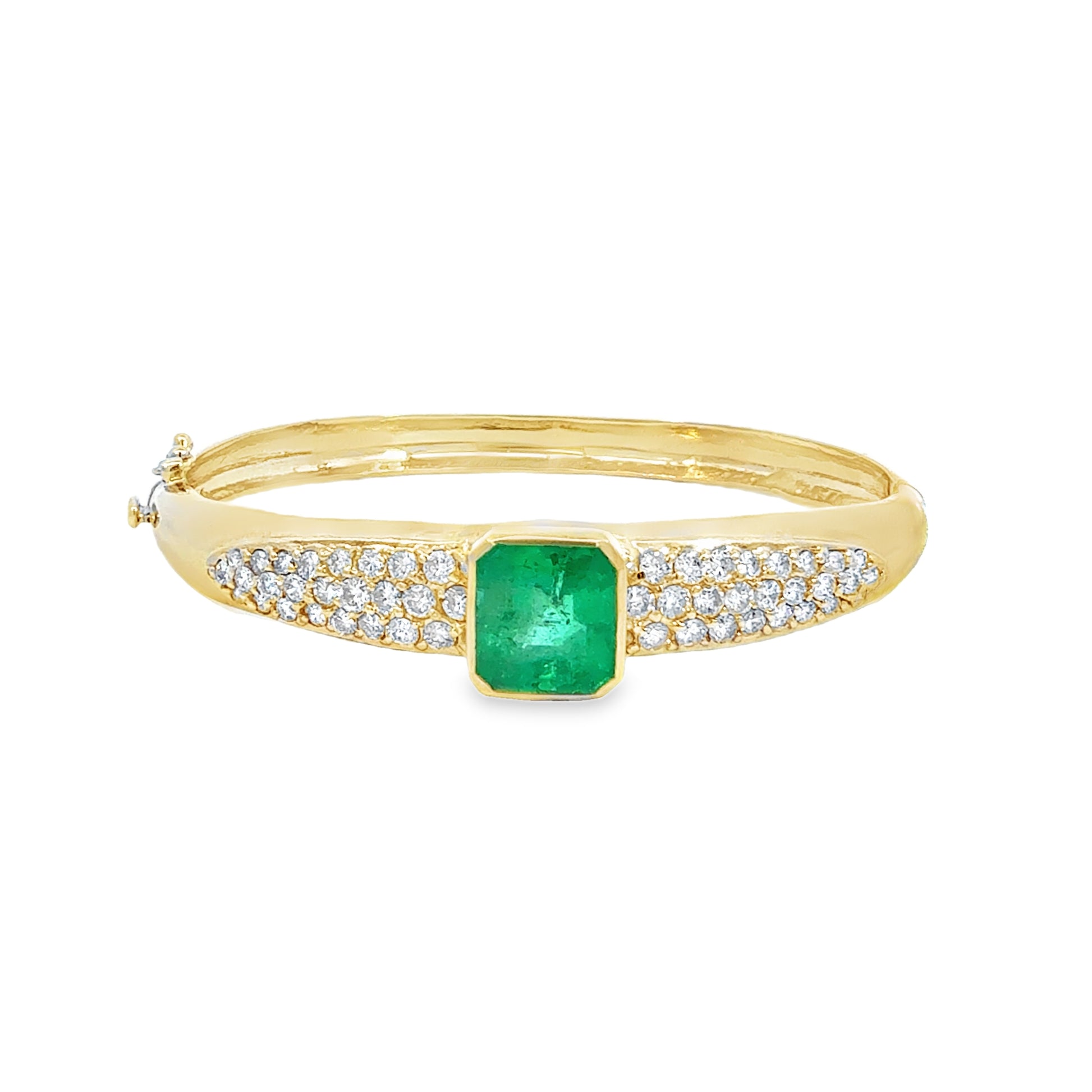 A breathtaking GIA-certified 6.96 carat Colombian emerald takes center stage in this vintage 1960s-1980s bracelet, exquisitely crafted in 14K yellow gold. The emerald-cut emerald, measuring 11.20 x 10.20 x 8.86 mm, is bezel-set in rich gold, radiating its signature deep green hue. Surrounding the emerald is 2.50 carats total weight of round brilliant-cut diamonds, meticulously arranged in a shared prong setting for maximum sparkle.