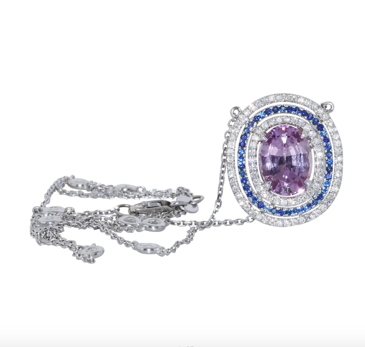 GIA 3.31 carat Burma No Heat Pink Sapphire pendant necklace. Burma is the best source for pink sapphires and this 3.31 carat shows why. The color of this pink sapphire oval is 100% natural and has not been altered by any heating. The necklace is 14kt white gold and has a diamond and sapphire halo surrounding the center stone.