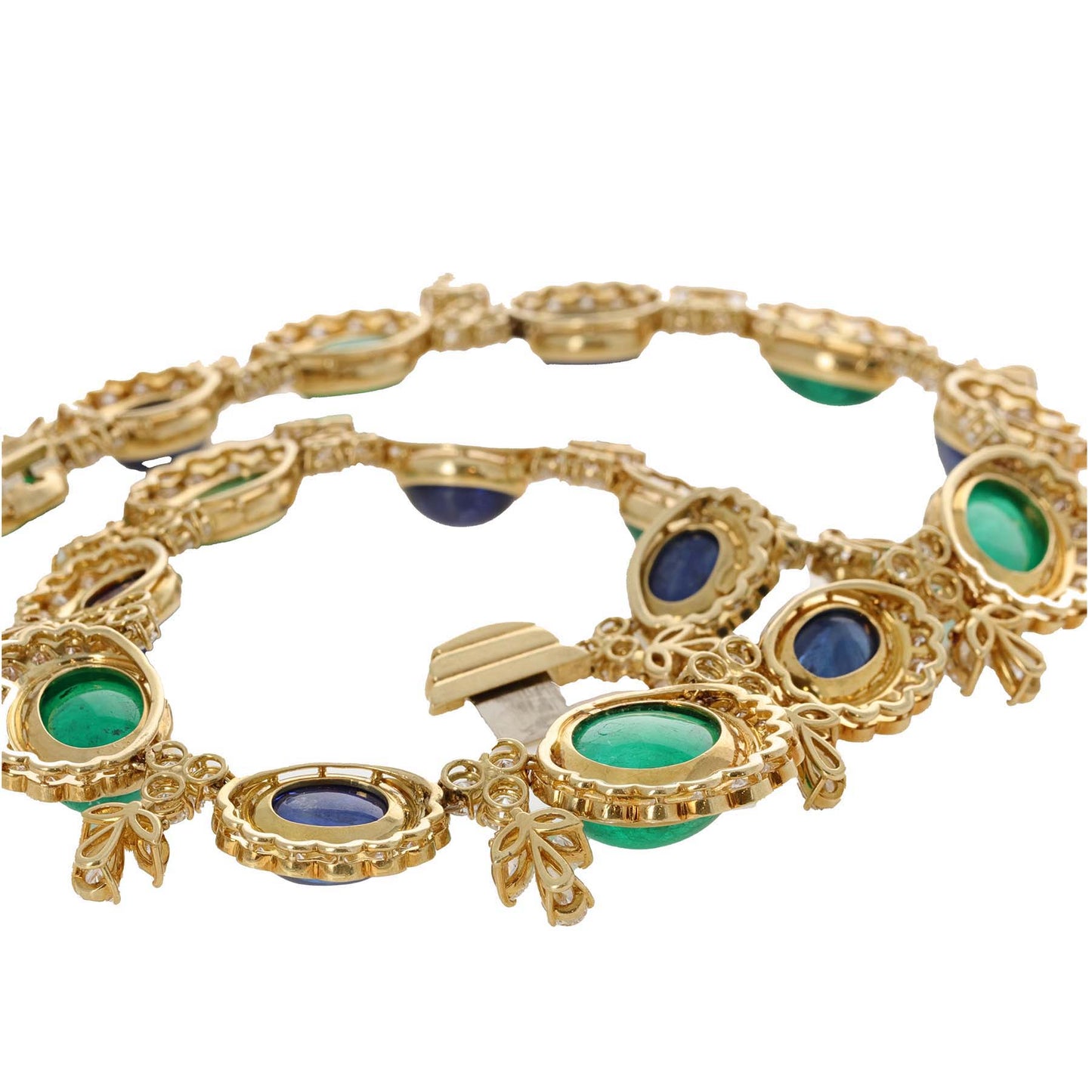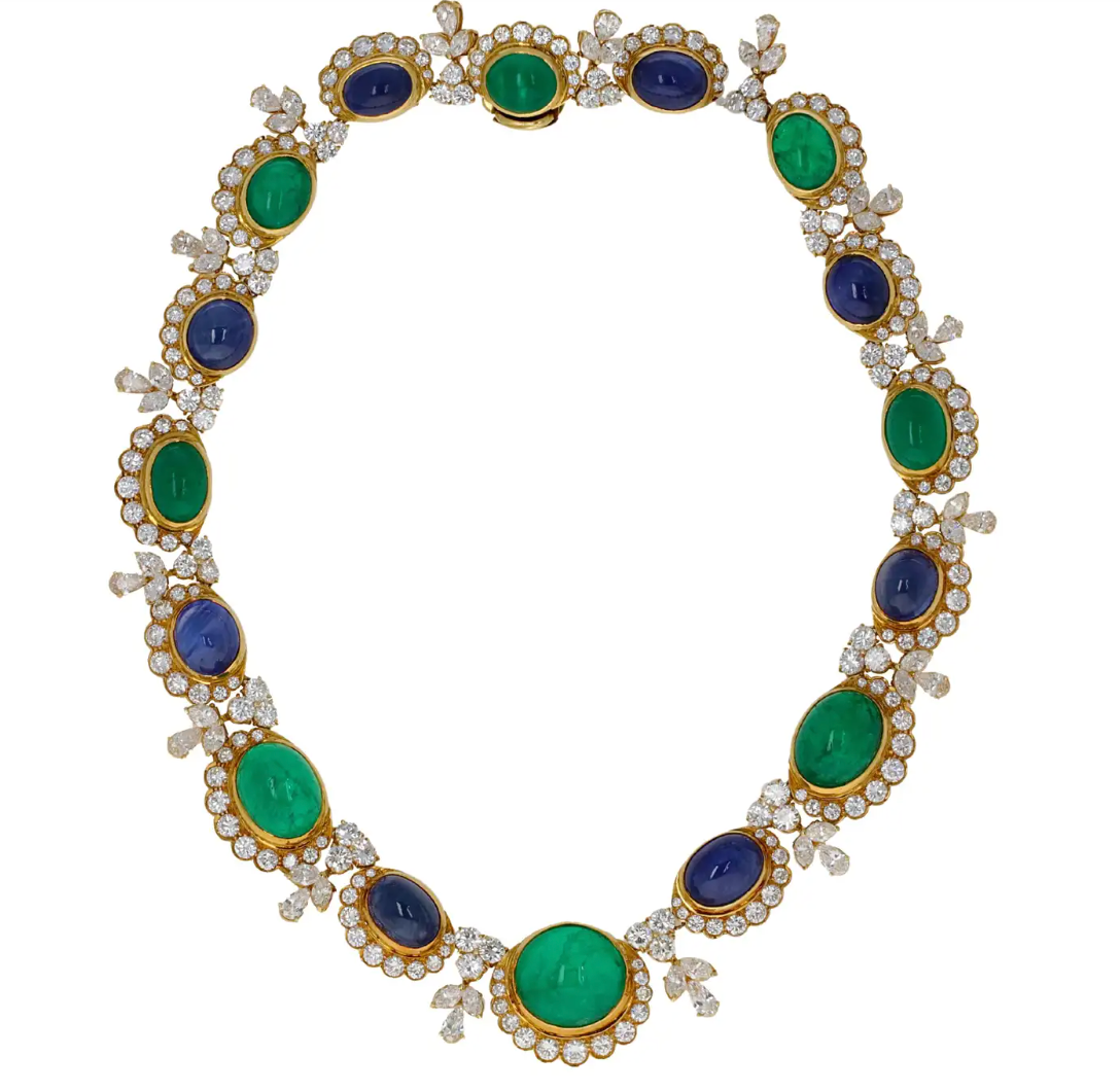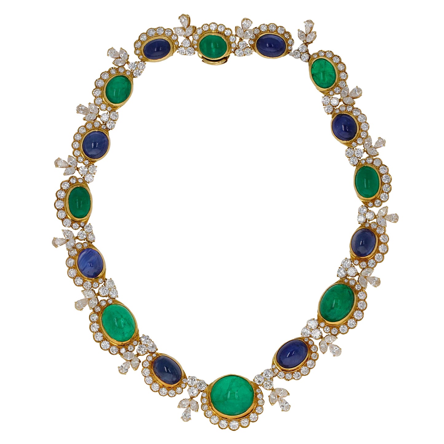 GIA Vintage Retro Sapphire Emerald Cabochon and Diamond Necklace