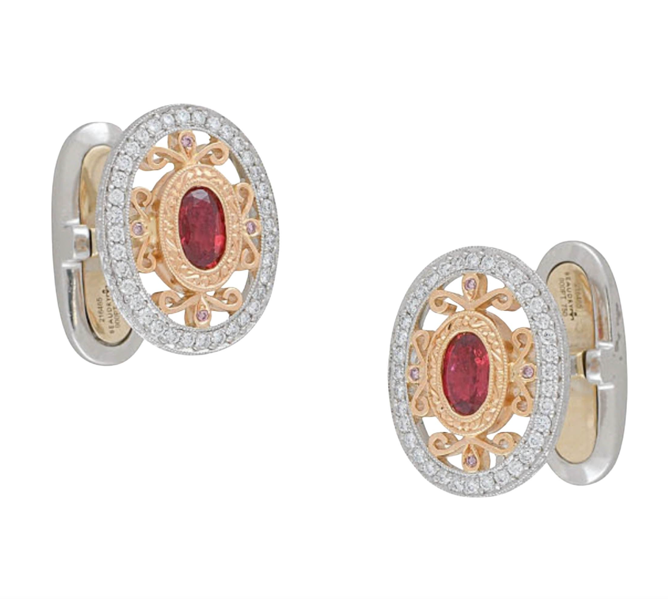 Intricately handcrafted Michael Beaudry Ruby, Pink Diamond, and White Diamond Cufflinks. These Platinum and 18k gold Fleur-de-Lis Silhouette oval shape ruby and diamond cufflinks are an original design by Michael Beaudry. There are two bezel set oval vivid red ruby centers that have a total weight of 1.15 carats, surrounded by an 18k rose gold Fleur-de-Lis silhouette with 0.30 carats of fancy pink diamonds and bordered in platinum with 0.42 carats total in round brilliant diamonds.