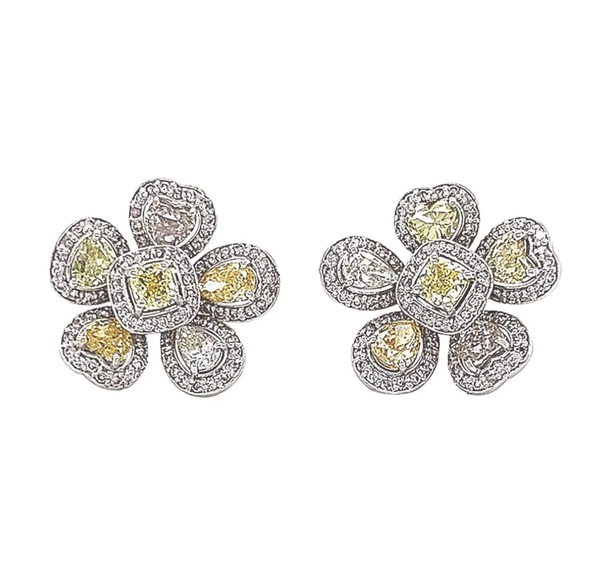 Fancy color, mixed shape diamond floral studs hand crafted in white gold with 4.83 carats total weight. Each fancy shape stone is enhanced by white, round brilliant diamond pave. The 1.31 carat of pave adds to the beauty of the earrings and their overall appearance.