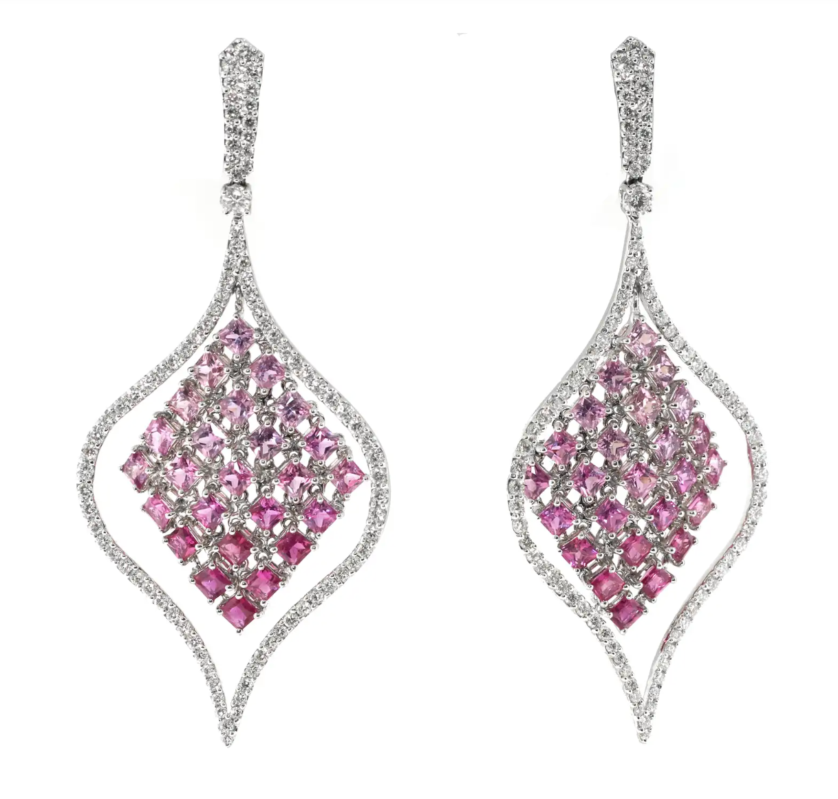 Gorgeous pair of hanging pink sapphire and diamond drop earrings. The greatest part is how perfectly the pink sapphires graduate in color from deep pink to light pink. The center section of the earrings hangs freely so there is flexible movement. Great pair of earrings for dressy occasions but can also be worn casually. Total weight of sapphires is over 8 carats and the total weight of the diamonds is close to 2.50 carats.