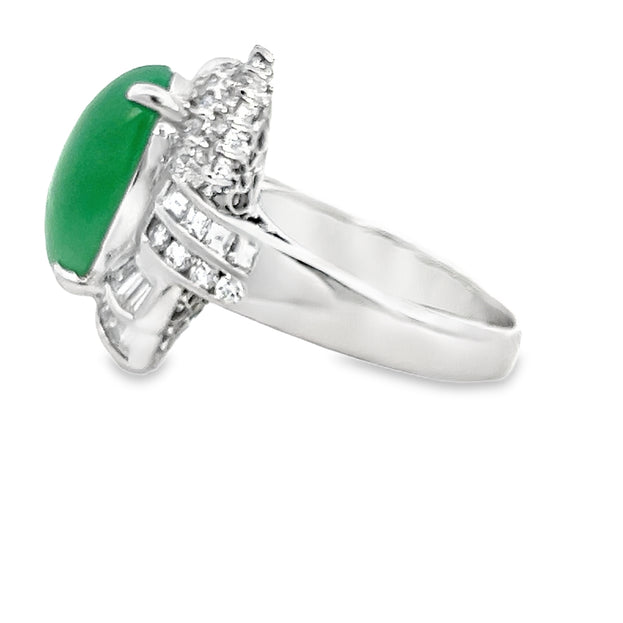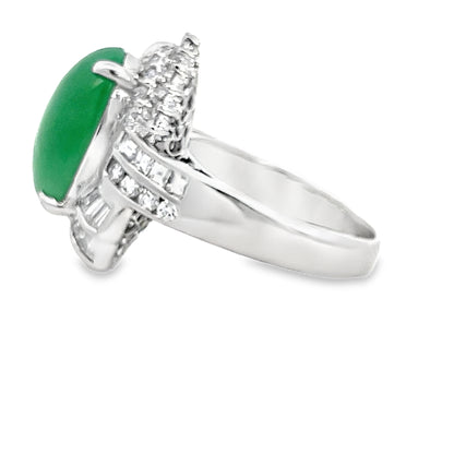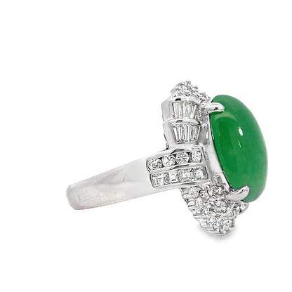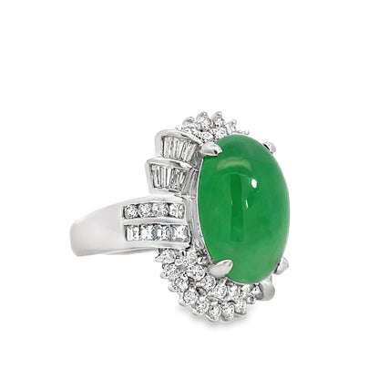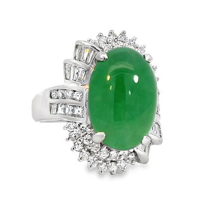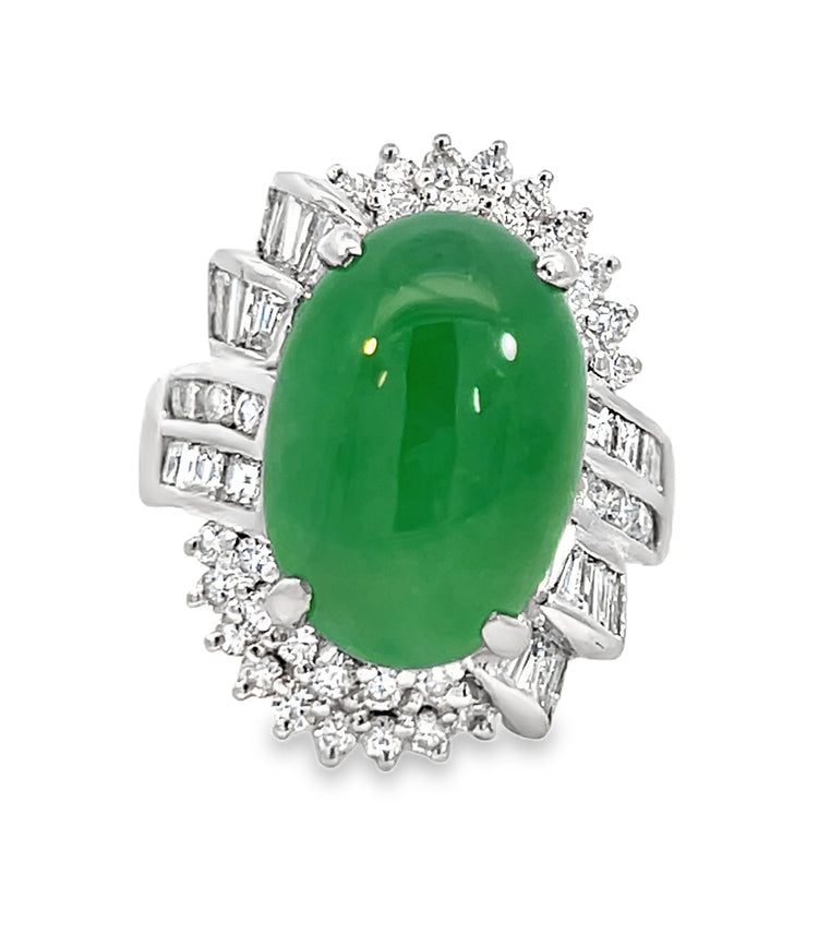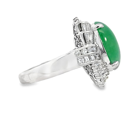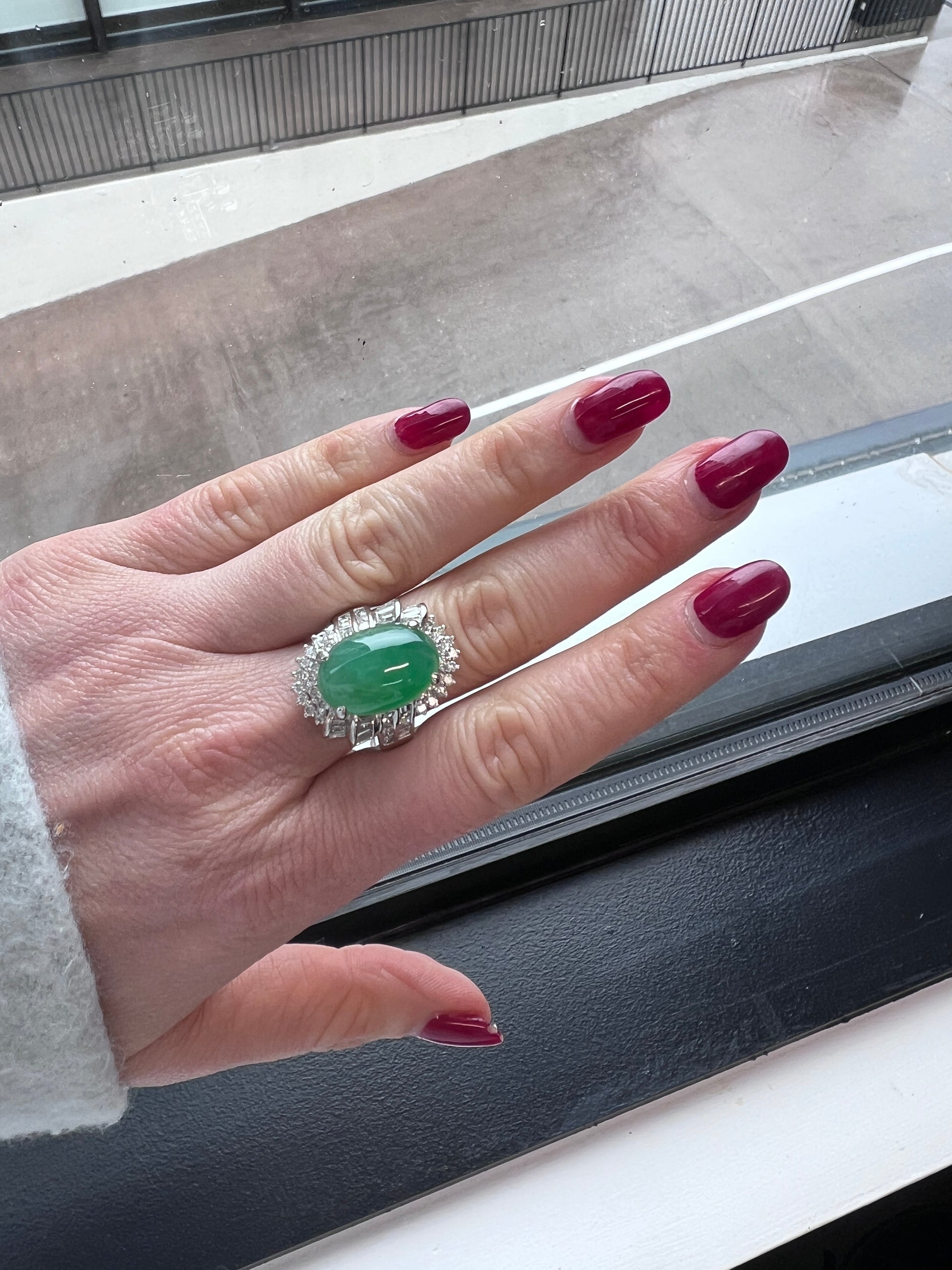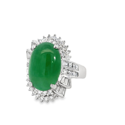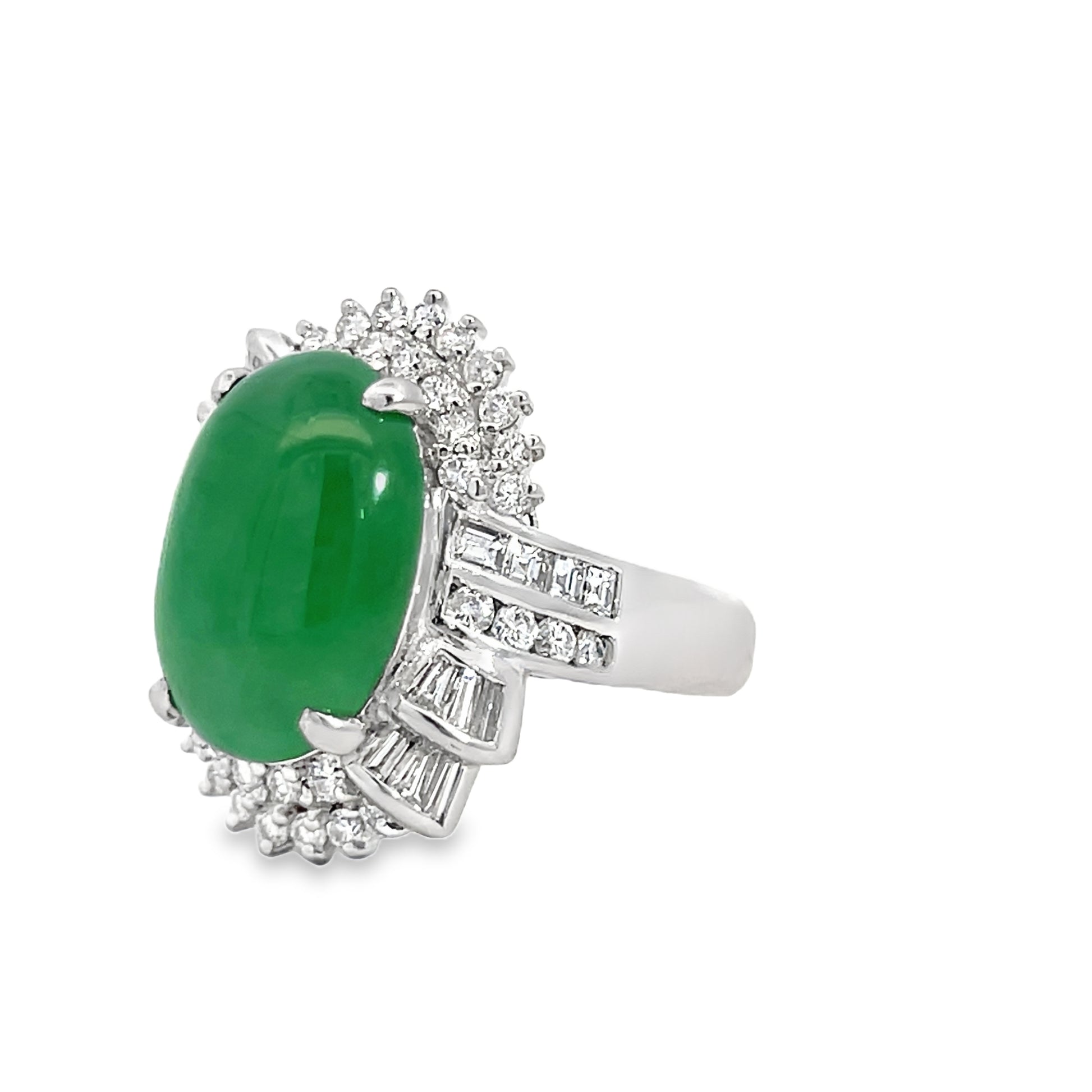 This striking retro cocktail ring features an 11.44-carat natural green jade gemstone set in solid platinum and framed by 1.95 carats of sparkling diamonds. The diamond halo includes carre cuts, round brilliants, and tapered baguettes, offering a mix of textures and brilliance.
