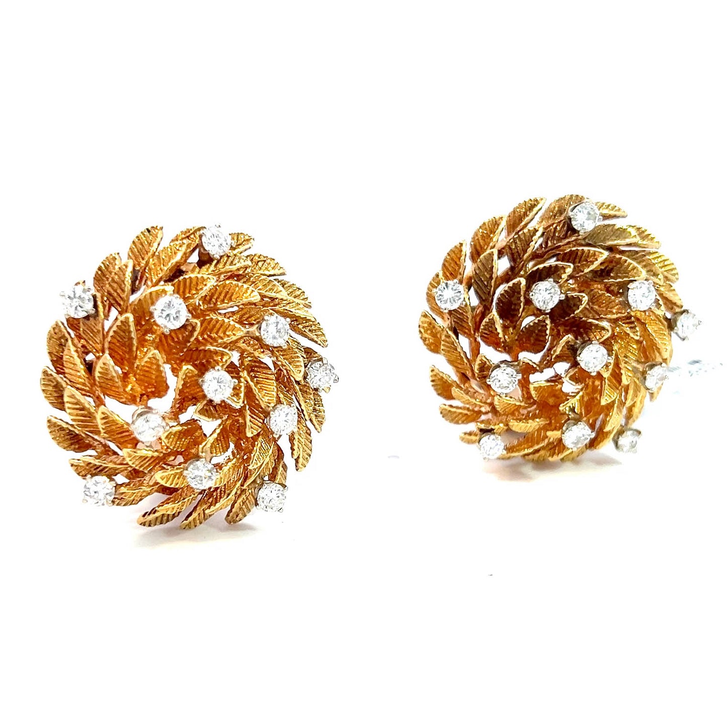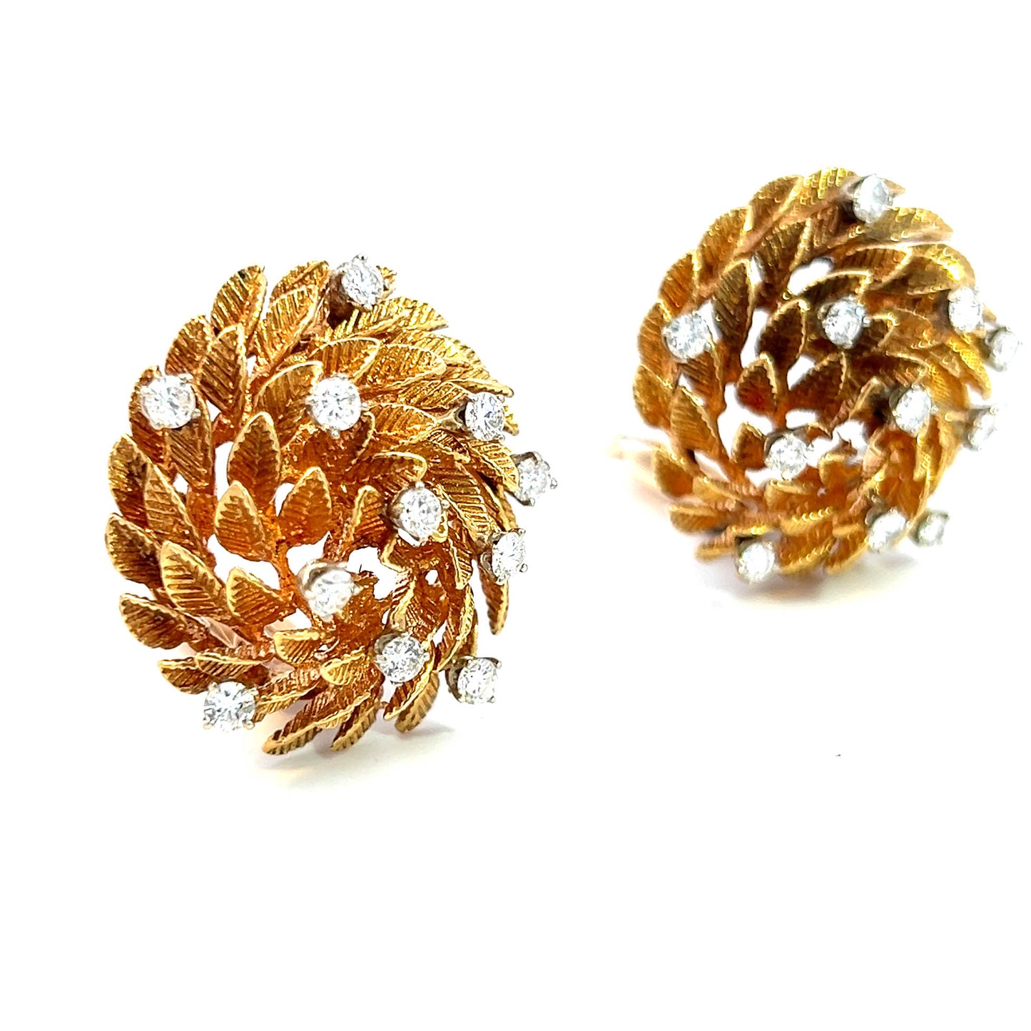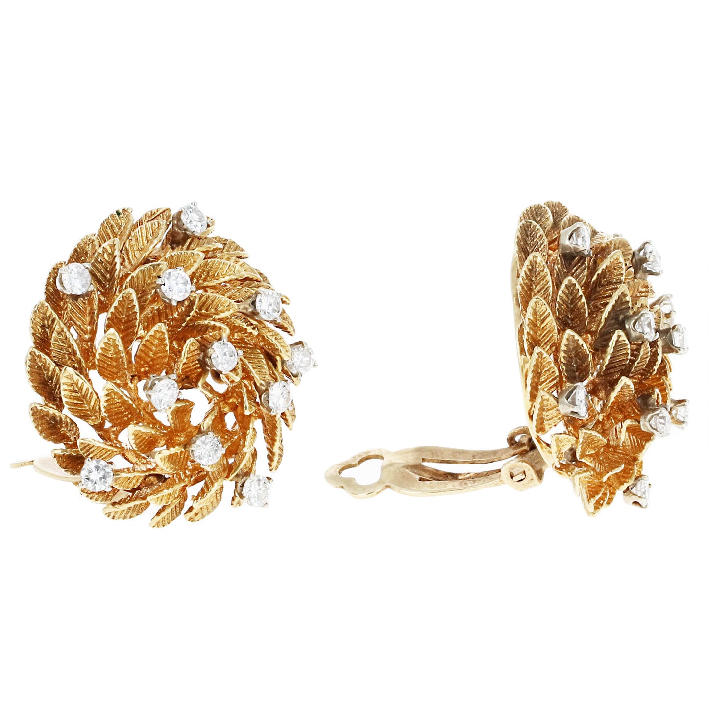 Retro 14k Gold and 1.76 Carat Diamond Clip-On Lever-Back Stud Floral Swirl Design Earrings