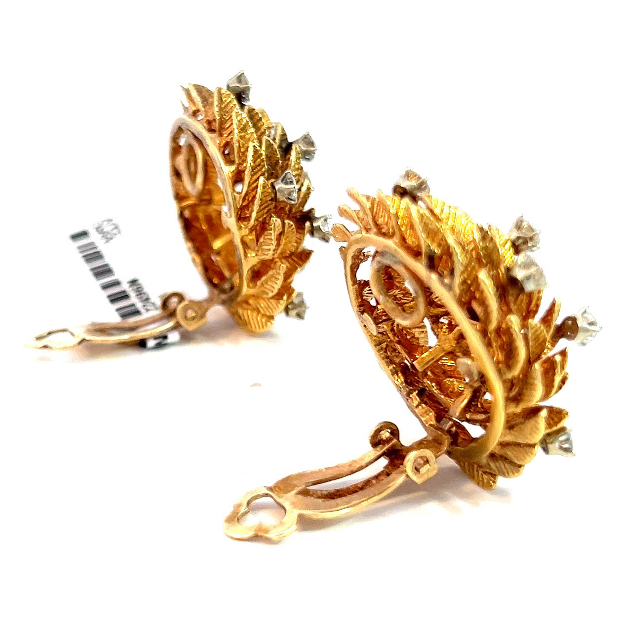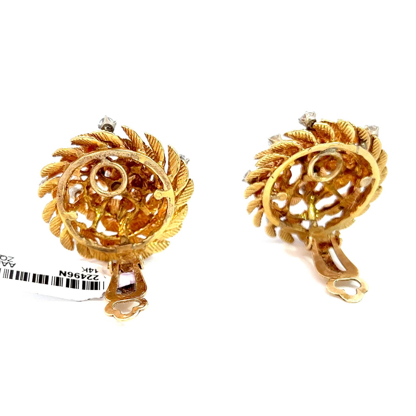 Retro Estate 14k rose gold and diamond clip-on lever back stud earrings. Showcasing a perfect blend of timeless style and exquisite craftsmanship, these vintage earrings feature hand-etched gold leaf accents paired with a stunning swirl floral motif, bringing intricate artistry to life.