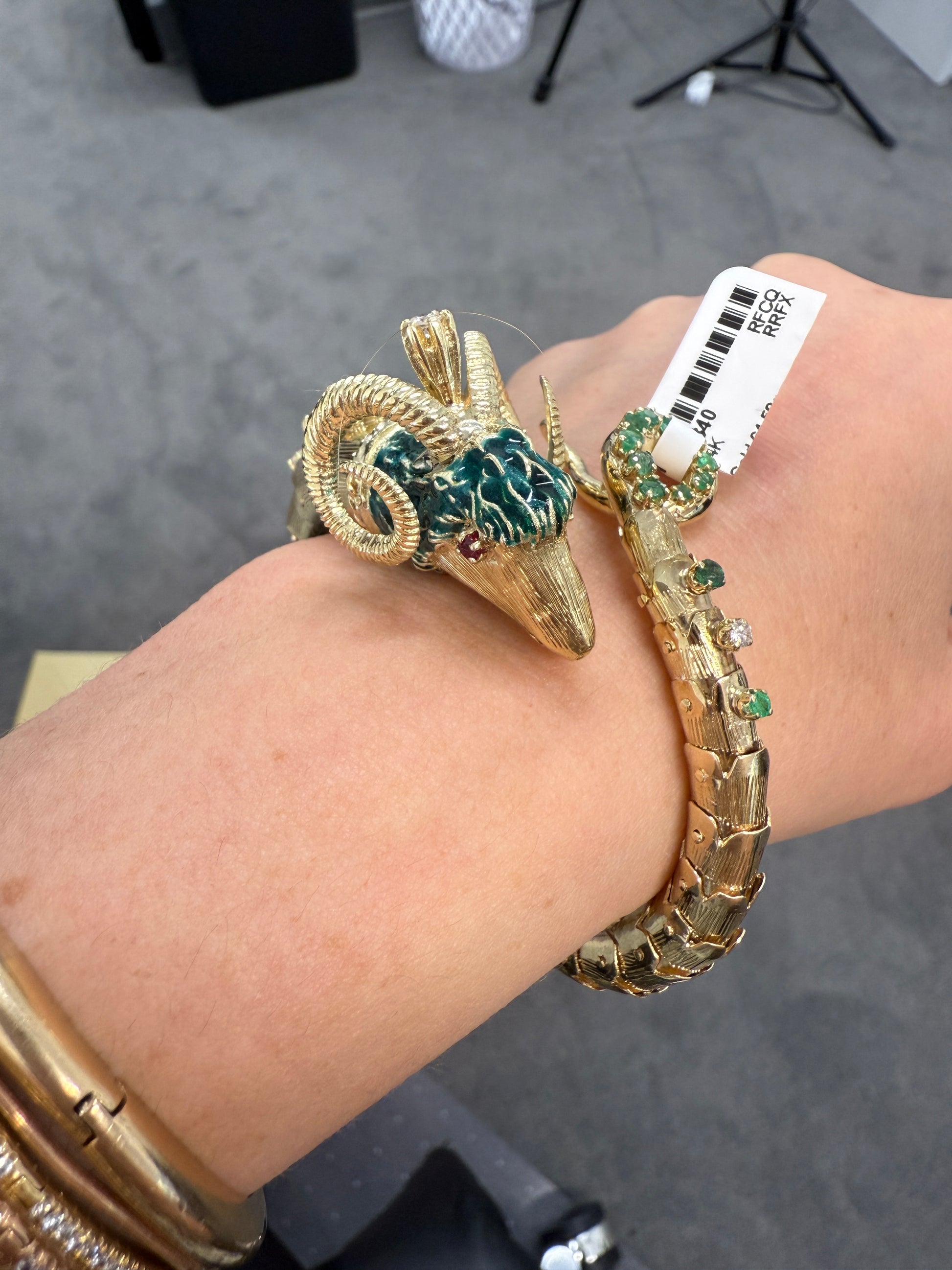 Retro 14K Gold Ram Head Bangle with Emeralds, Diamonds & Ruby Eyes