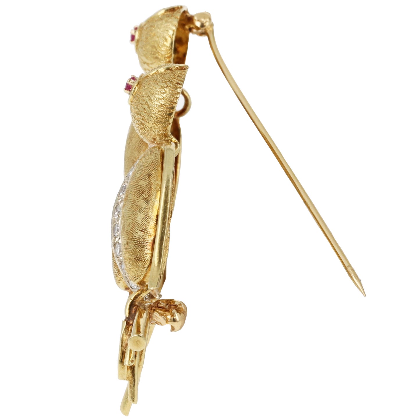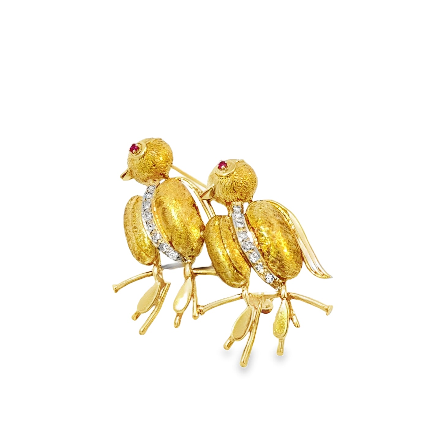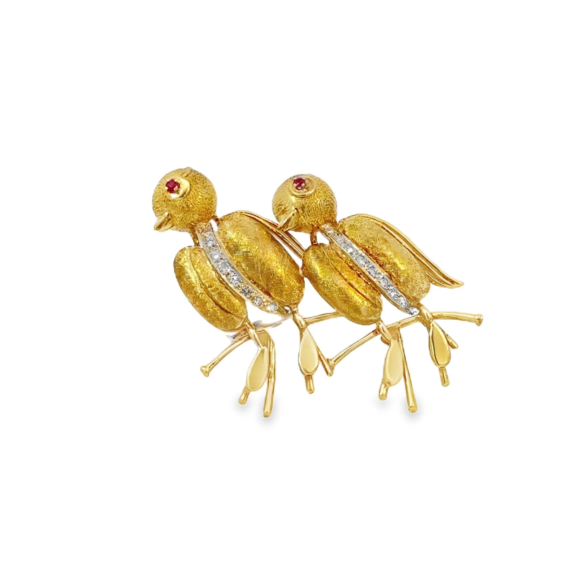This retro 18 karat gold bird brooch showcases two whimsical birds perched gracefully on a branch, crafted in rich 18K yellow and white gold. The bodies of the birds are beautifully textured with alternating finishes, while a vertical strip of white diamonds runs down each bird’s center, adding brilliant sparkle and contrast. Each bird is accented with a vibrant ruby eye, adding charm and personality to the playful design.