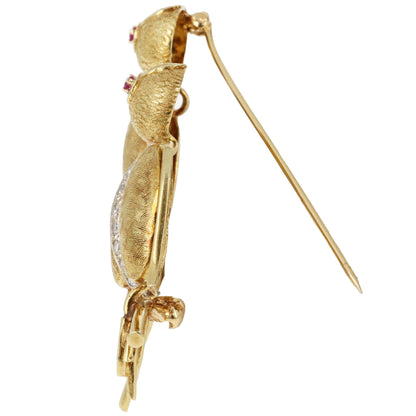 Retro 18K Gold Love Bird Brooch Pin with Diamonds and Ruby Eyes