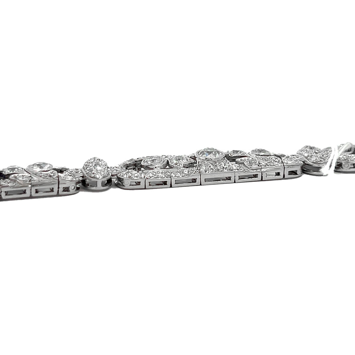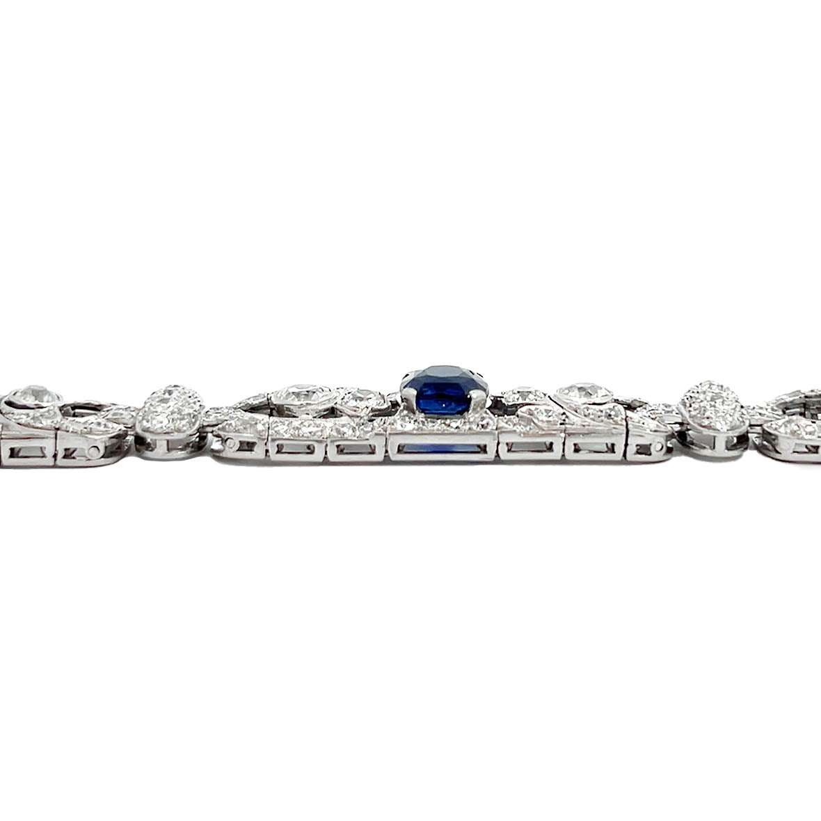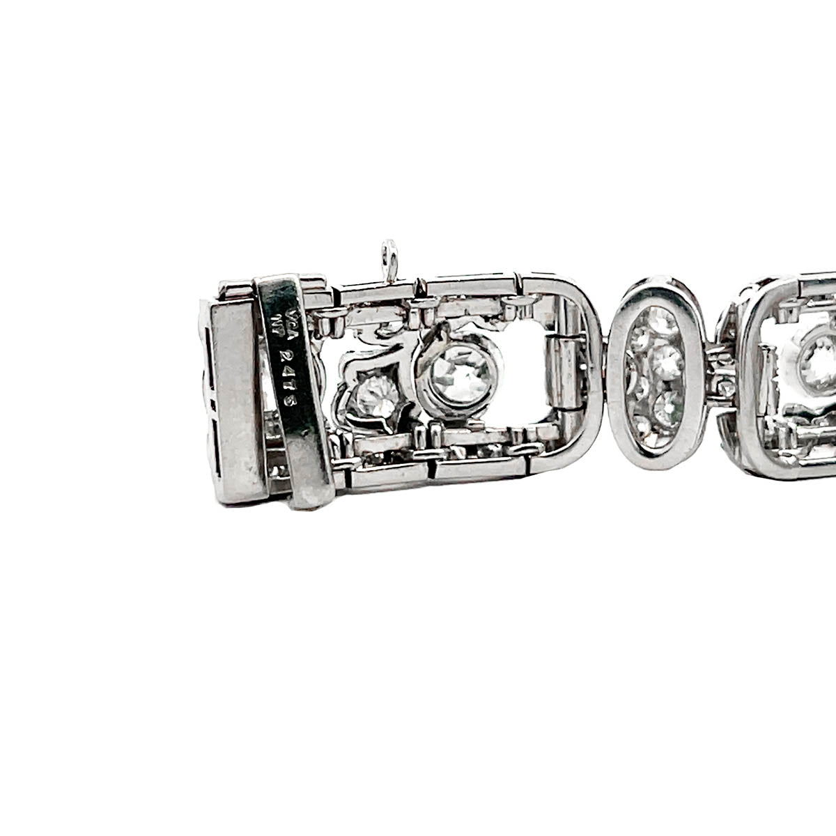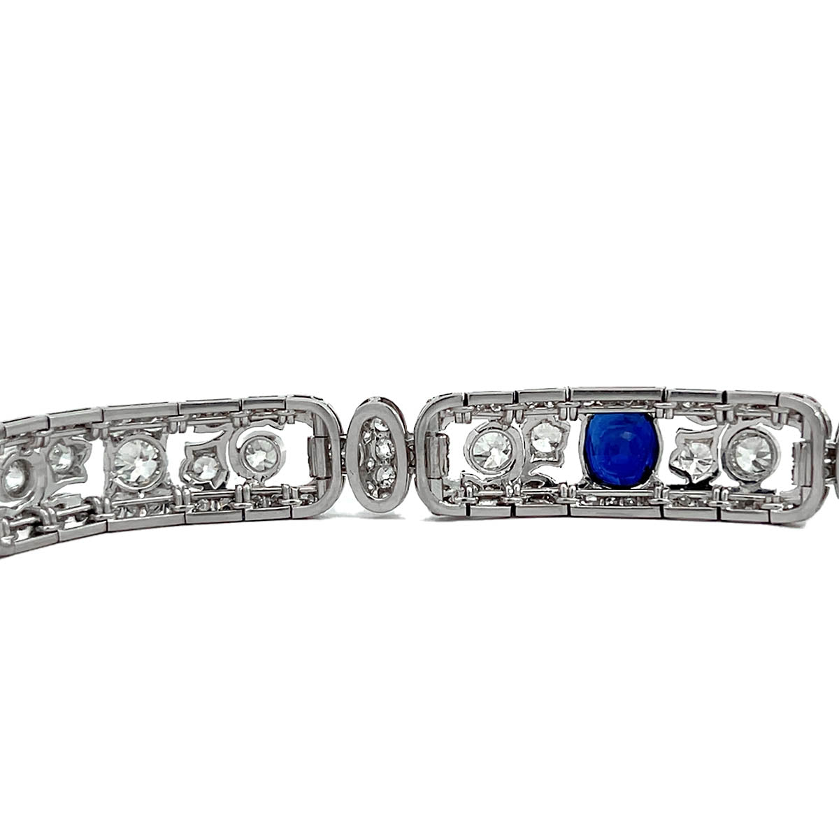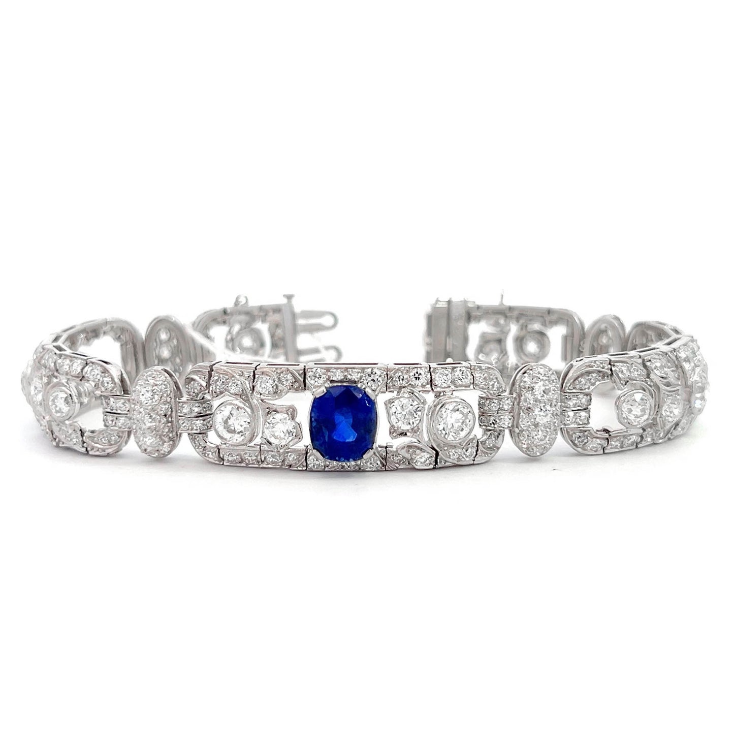 Crafted in premium platinum, the antique Art Deco design captures the elegance and geometric precision characteristic of the era. The central sapphire boasts a deep royal blue hue and measures 8.59 x 7.38 x 5.93 mm. The Sapphire is complemented by brilliant, high-quality old, single-cut, round diamonds, G-color, and VS1-clarity diamonds, ensuring this bracelet is an eye-catching accessory and a valuable addition to any jewelry collection. The bracelet bears the esteemed “VCA NY” hallmark and an authentic serial number, affirming its status and heritage as an authentic Van Cleef & Arpels creation. A secure safety clasp and an additional chain safety provide extra peace of mind for wear. It measures 7 inches in length by 0.50 inches in width.