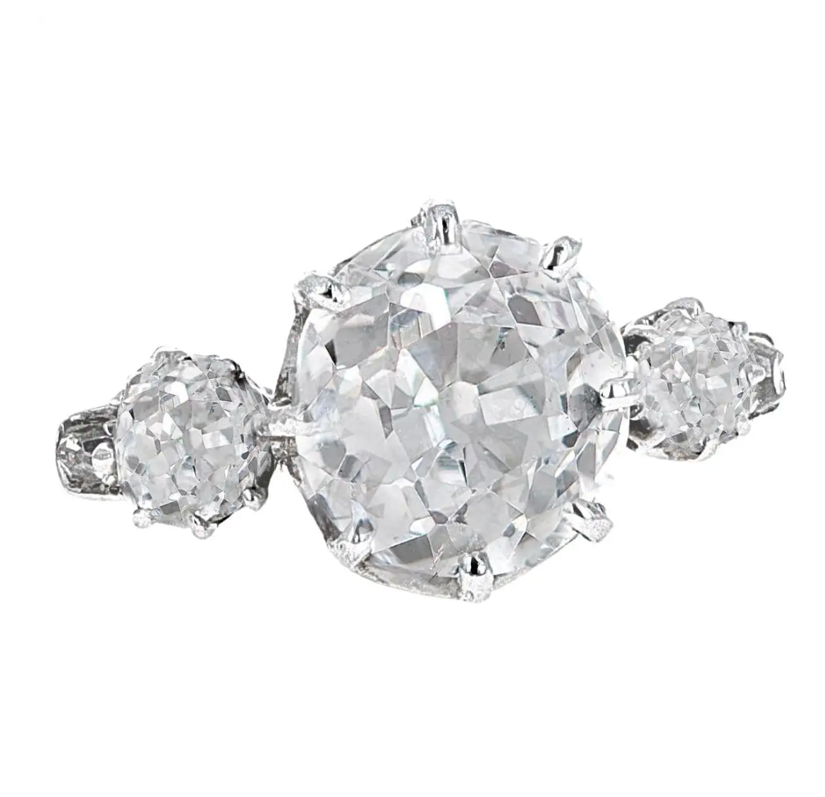 Vintage 3-stone ring Victorian GIA certified, 2.43 carat F-I1 old European cut diamond ring with two old European diamonds set in platinum. The ring features a platinum setting with two old European cut diamonds. The center diamond weighs 2.43 carats and has a color grade of F (nearly colorless) and a clarity grade of I1 (visible inclusions under magnification but possibly not to the naked eye).
